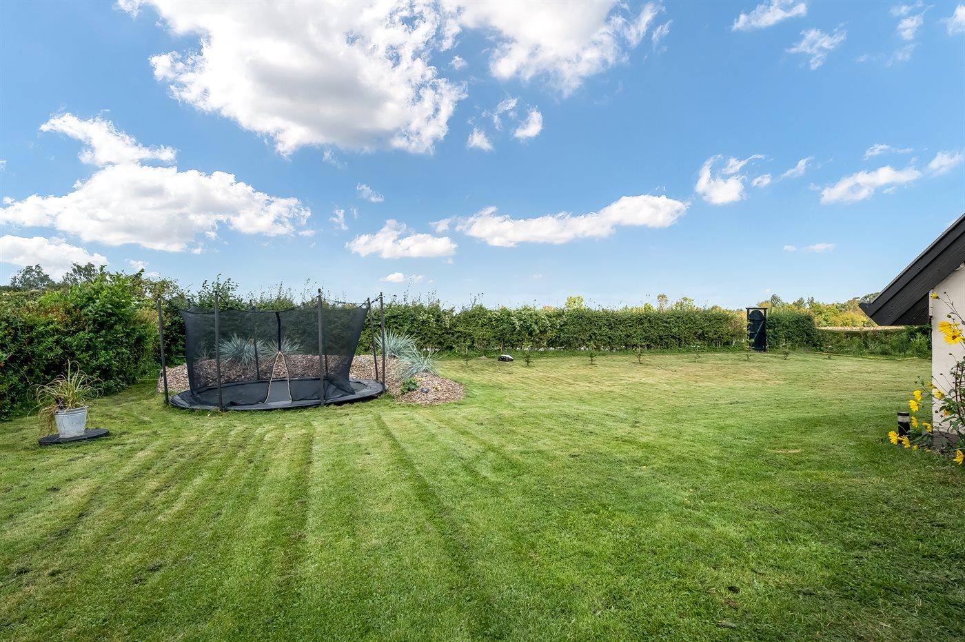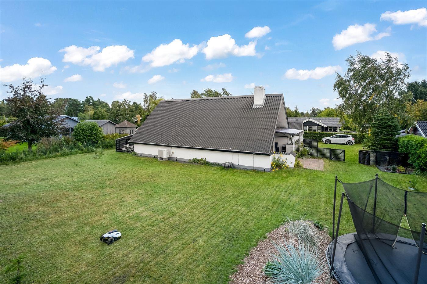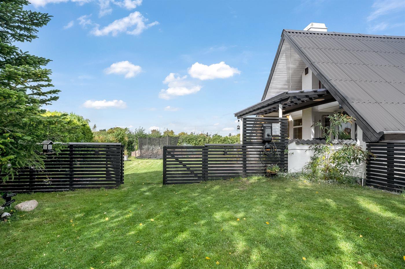 Ferieboligen er beliggende på en 1122 m² stor havegrund. Grunden er indhegnet. Der er 650 m til havet. Nærmeste forretning er beliggende i en afstand af 1000 m. Der er en golfbane i en afstand af 4000 m. Til ferieboligen hører åbent terrasseareal. Desuden er der overdækket terrasse. Udgang til altan. Trampolin. Bålsted. Udendørs sauna. Grill til rådighed. Der er installeret stik til opladning af elbil. Type 2 stik. Med 11 kW ladeeffekt. Parkering ved ferieboligen.