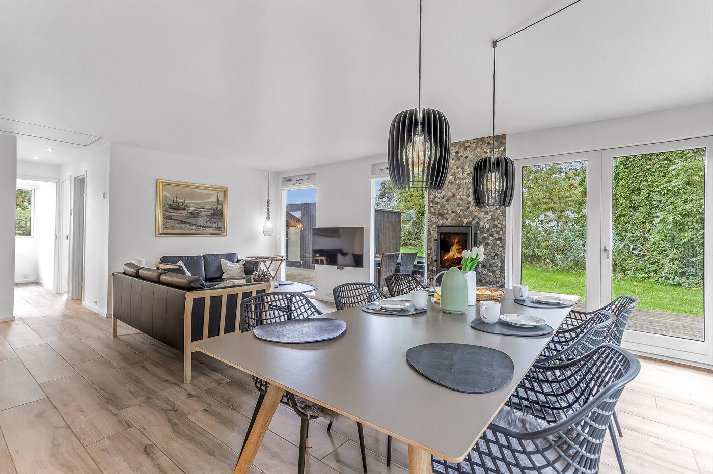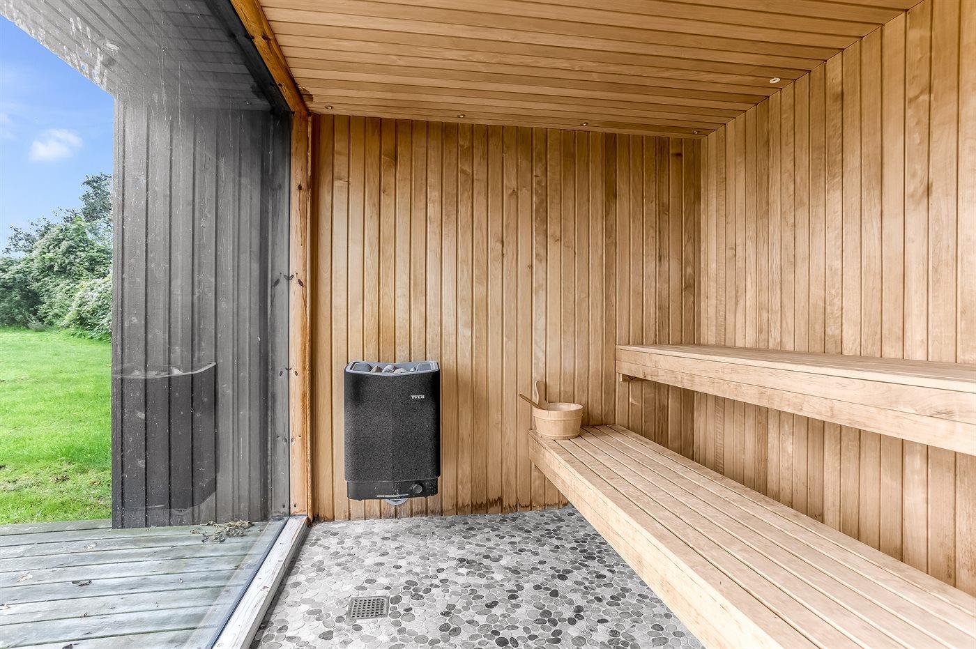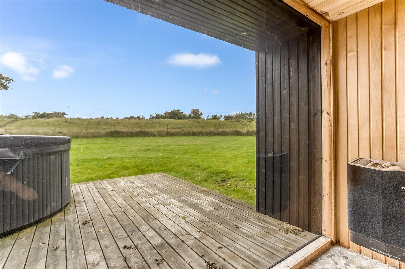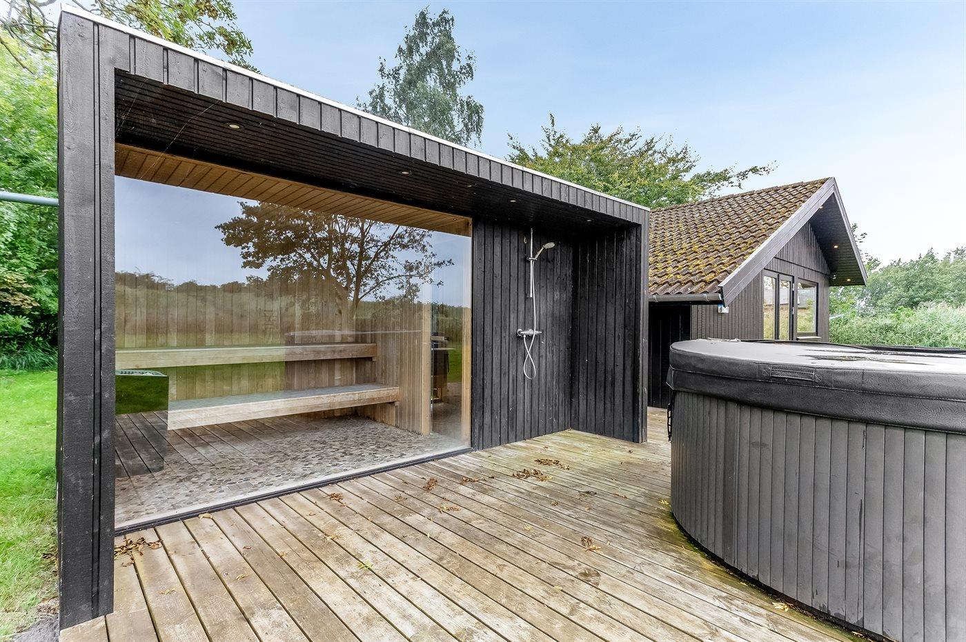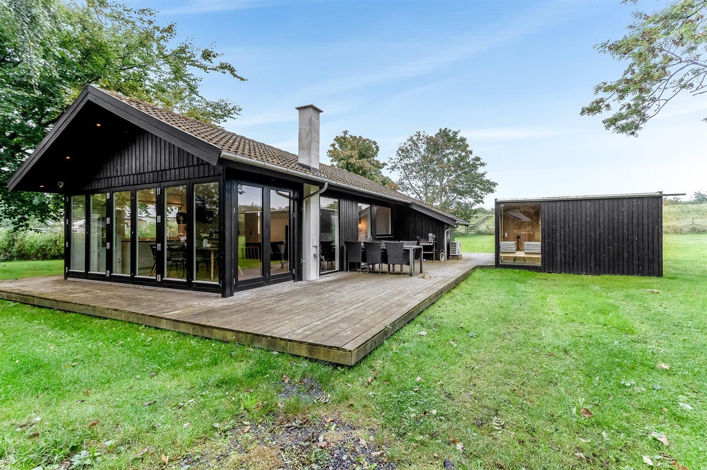 Moderne sommerhus tæt på havet med spa, sauna og stor terrasse i naturskønne omgivelser.