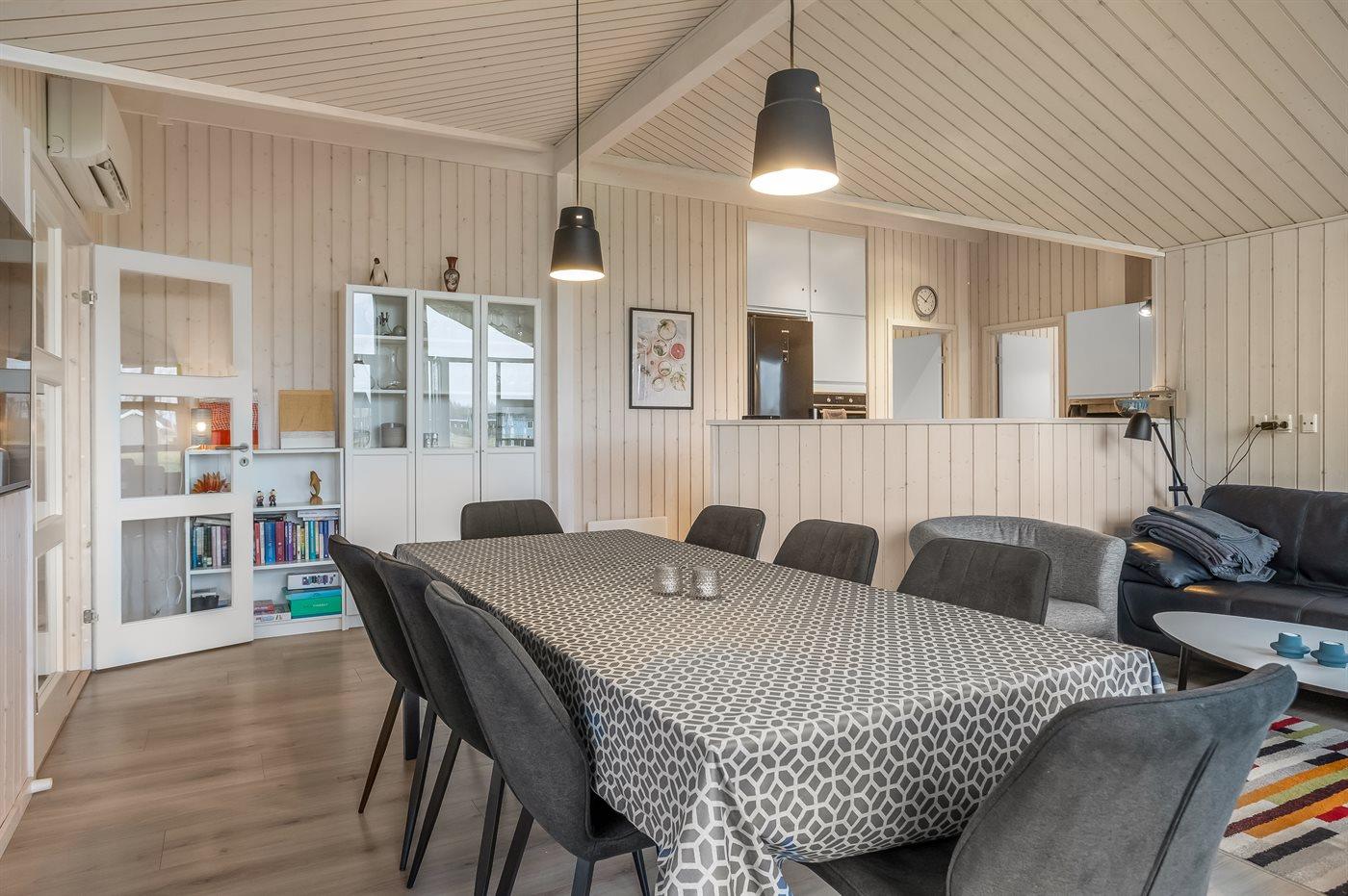 Sommerhuset egner sig til 10 personer. Ferieboligen er på 143 m² og er bygget i 2021. Det er tilladt at medbringe 1 husdyr. Ferieboligen er udstyret med 2 energivenlige luft til luft varmepumper. Der er gulvvarme i alle klinkegulve. Ferieboligen har vaskemaskine. Tørretumbler. Frysekapacitet på 90 liter. Der er desuden brændeovn. Til de små er der 1 stk. barnestol.