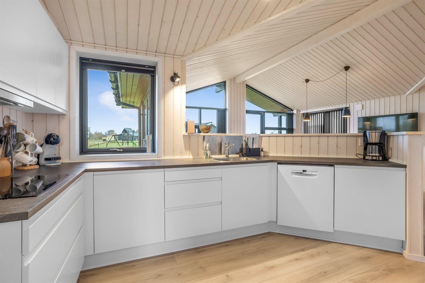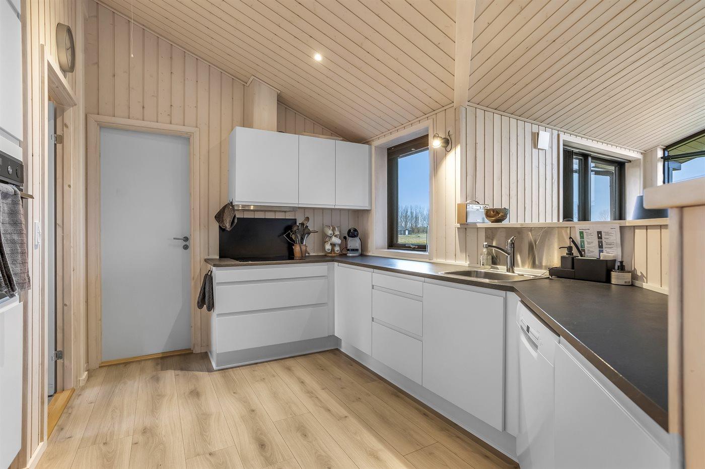 Køkkenet er udstyret med 1 køleskab. Der er 4 induktionskogeplader, varmluftovn, mikrobølgeovn samt opvaskemaskine.