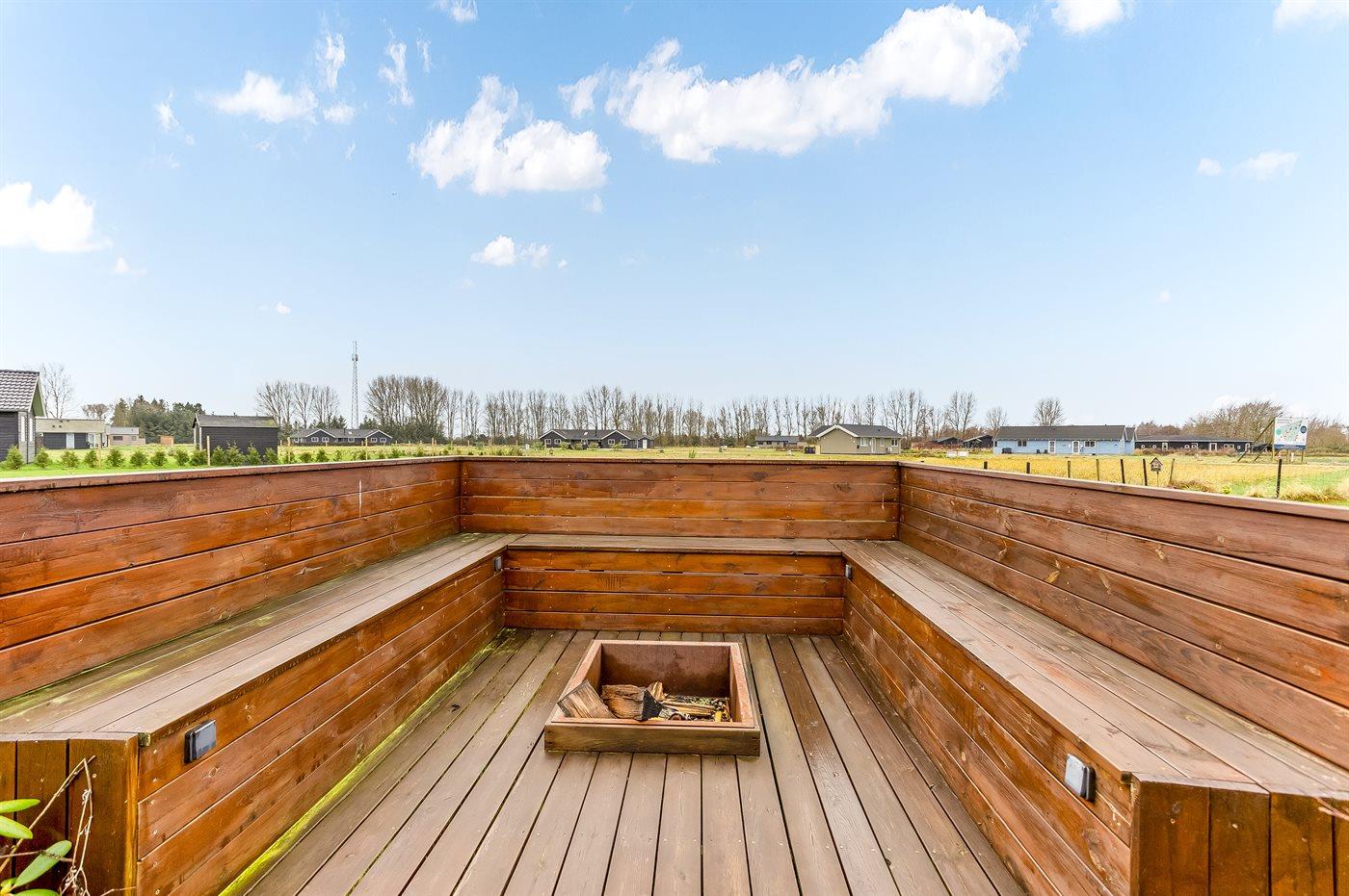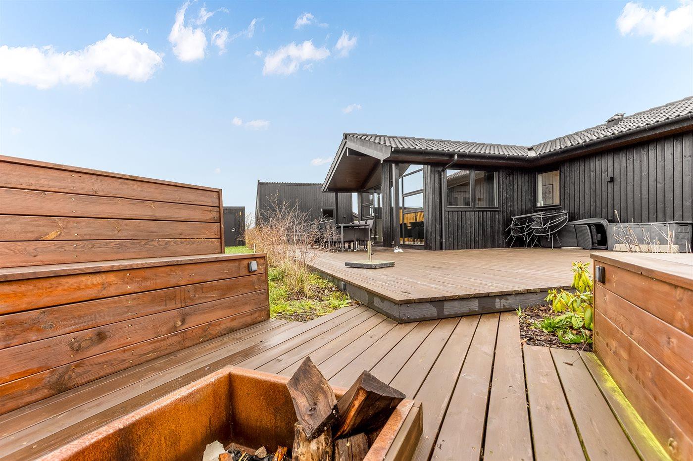 Skøn plads i haven med masser af hyggepladser rundt omkring, der er bålsted og endda en udendørs bruser. Stort terrasseareal både åbent og overdækket, hvor I kan nyde solen på liggestolene og grille om aftenen. Der er også tænkt på de små gæster med 1 barnestol og udendørs finder I trampolin (benyttes på eget ansvar/forsikring).