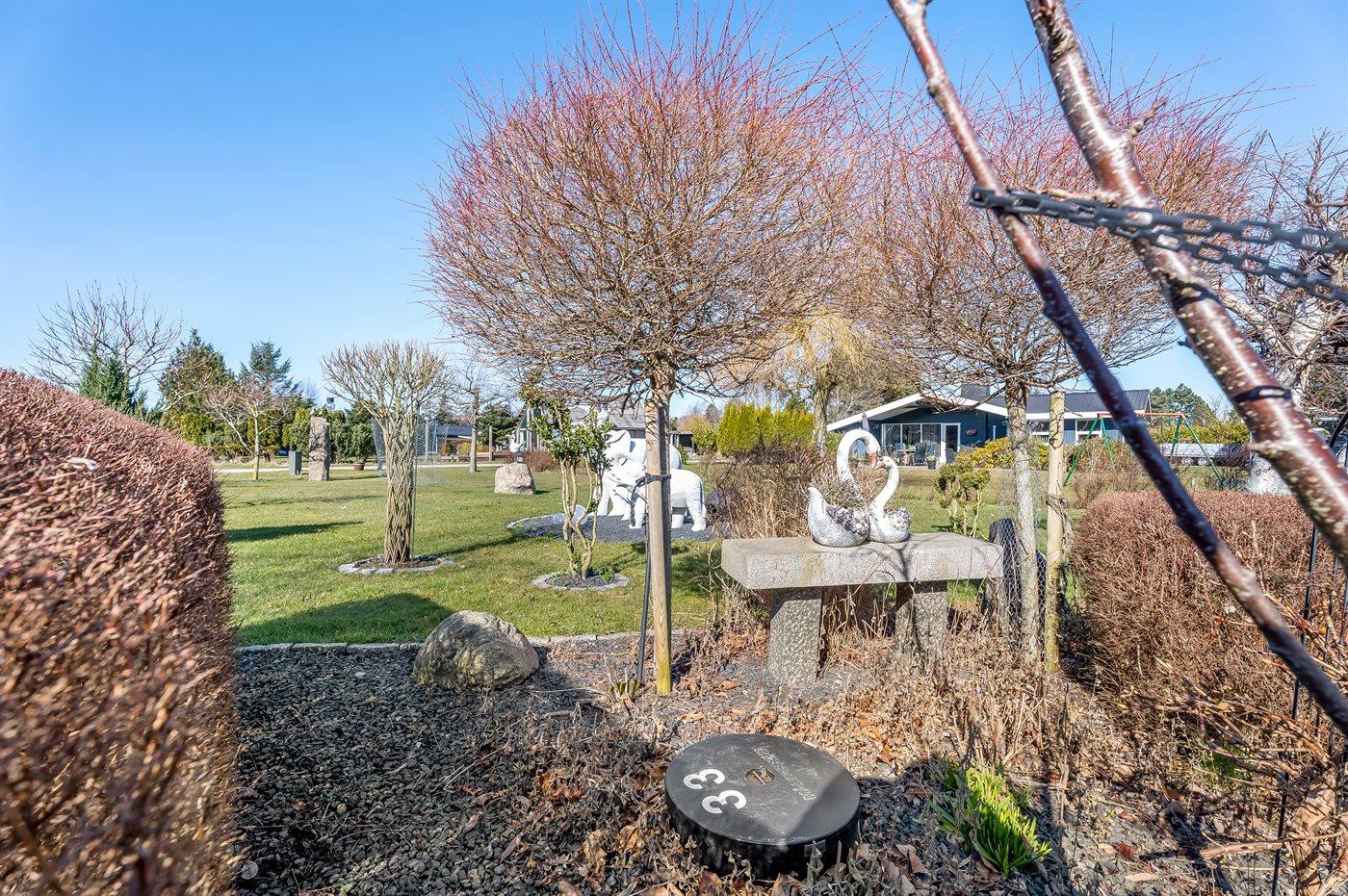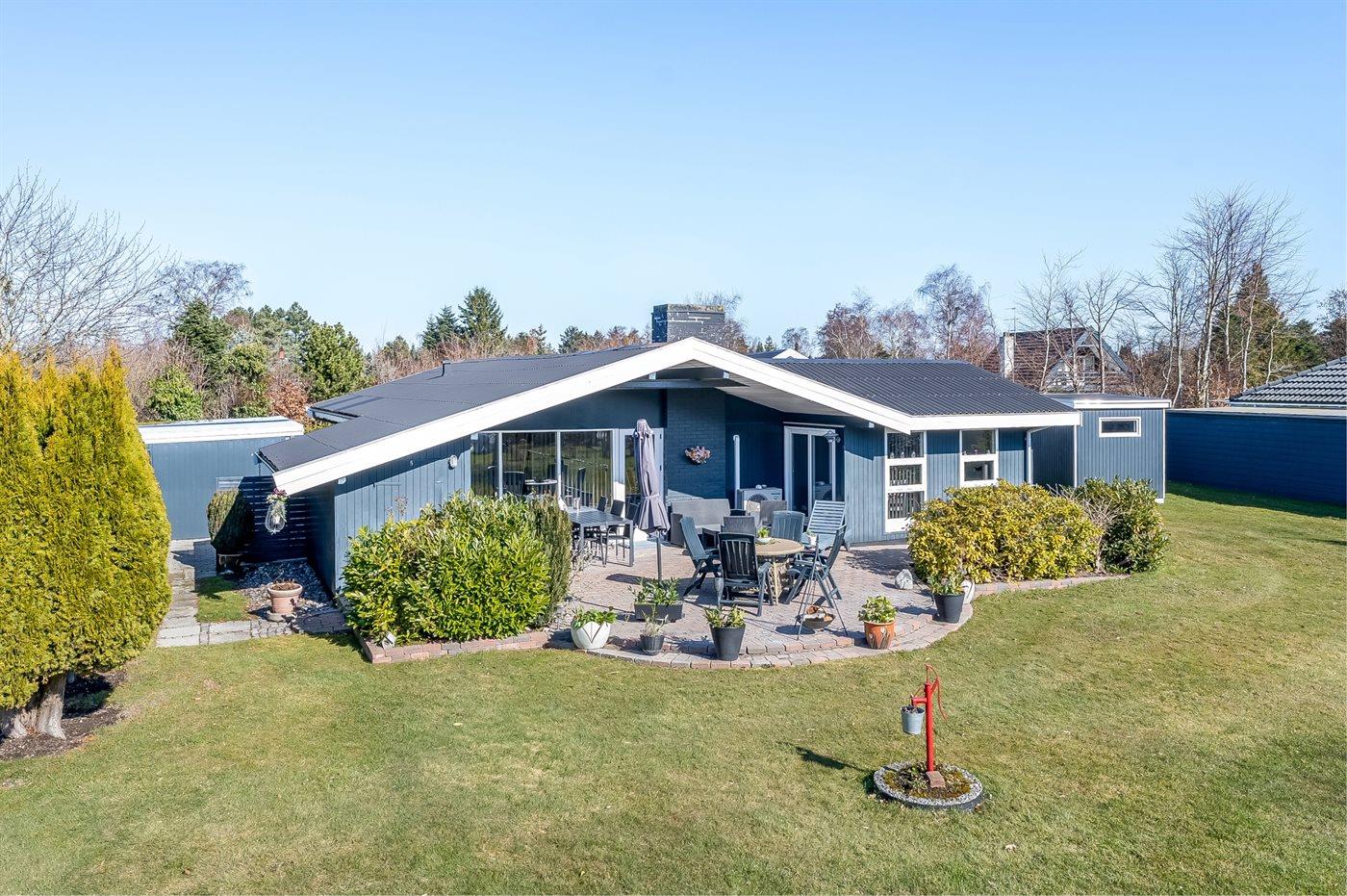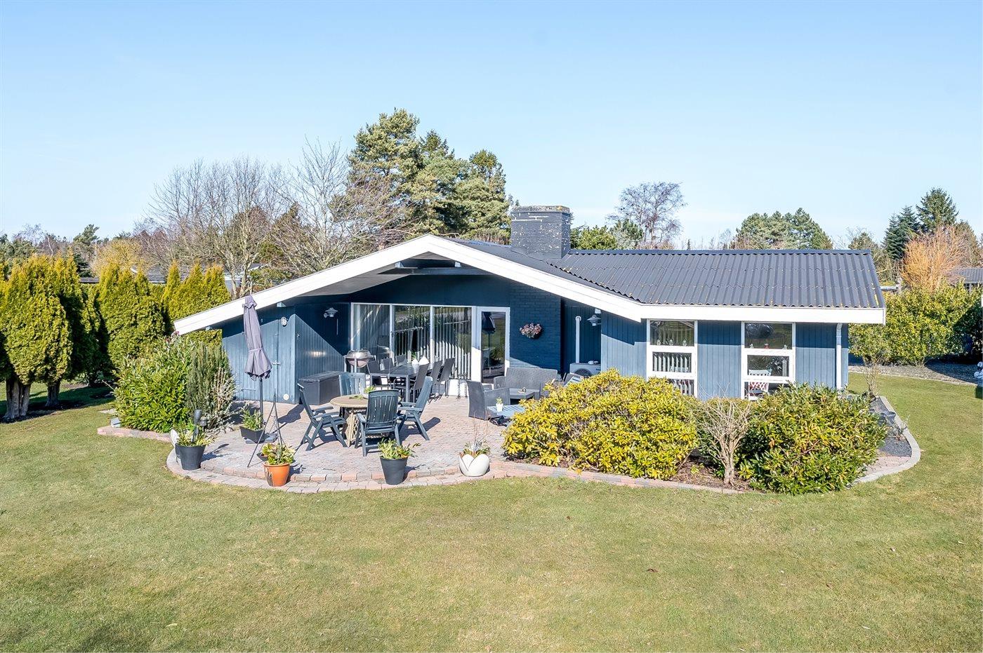 Ferieboligen er beliggende på en 1300 m² stor naturgrund. Der er 800 m til havet. Nærmeste forretning er beliggende i en afstand af 1000 m. Til ferieboligen hører åbent terrasseareal. Desuden er der overdækket terrasse. Gynge. Sandkasse. Grill til rådighed. Der er carport til rådighed. Parkering ved ferieboligen.