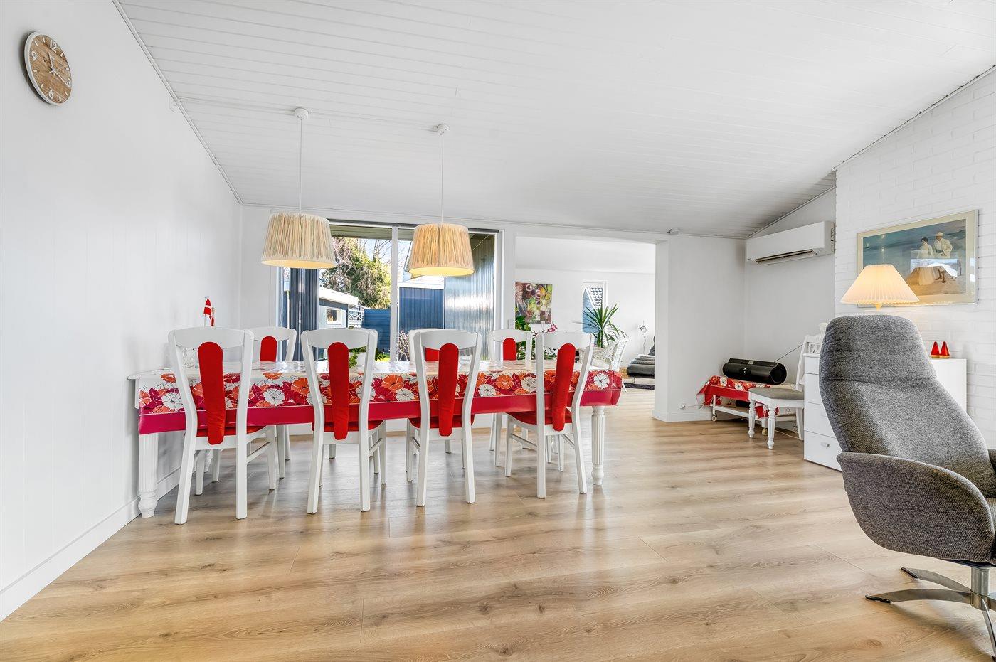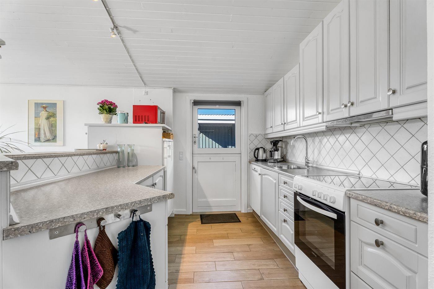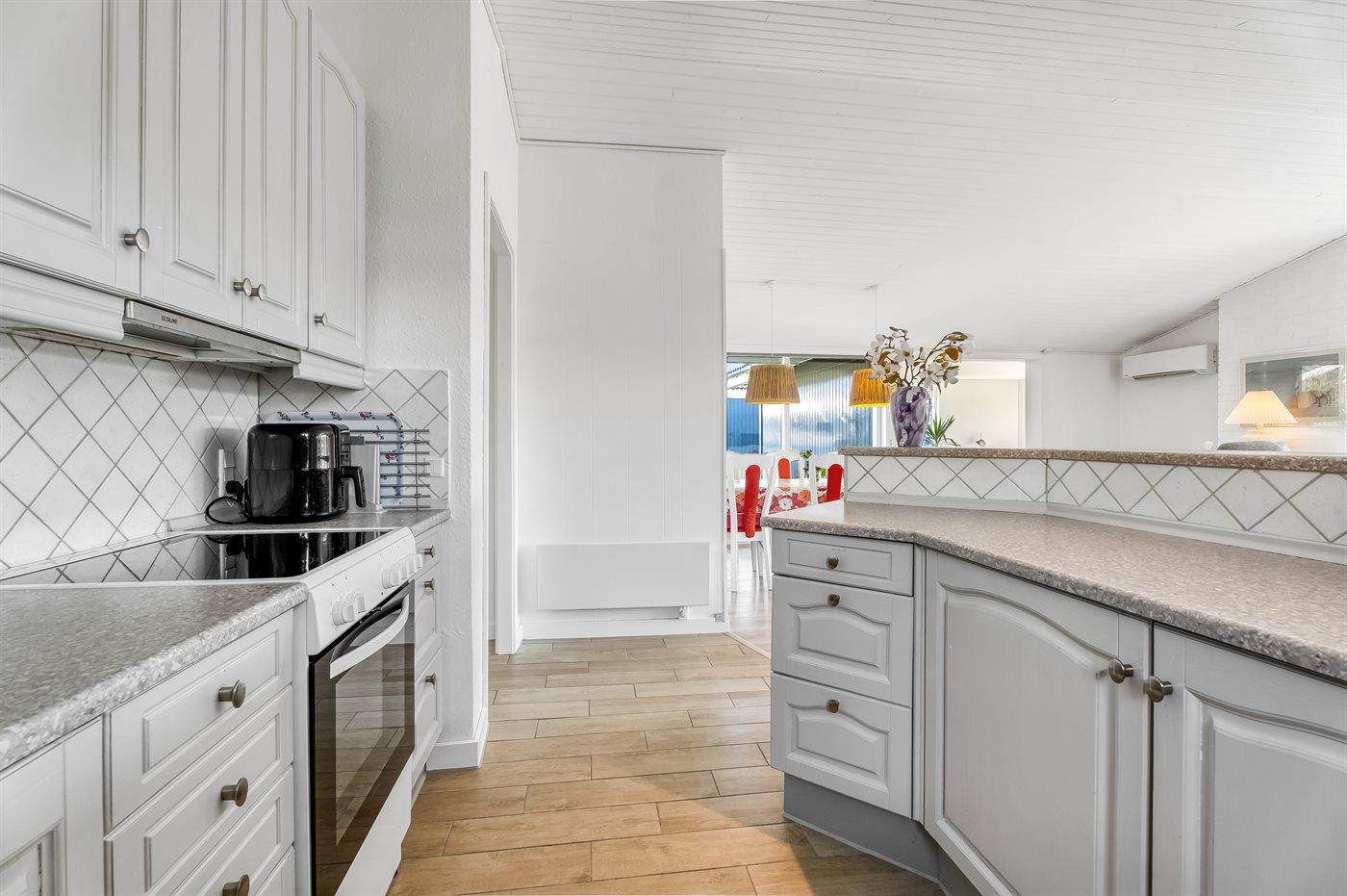 Køkkenet er udstyret med 1 køleskab. Der er 4 keramiske kogeplader, varmluftovn, Airfryer samt opvaskemaskine.