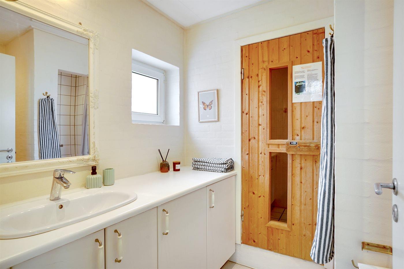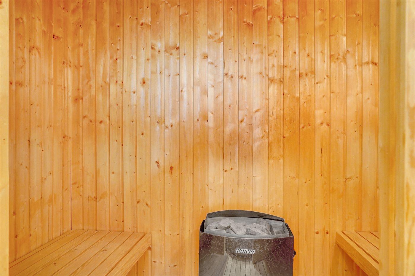Der er 2 badeværelser med bruseniche og 2 toiletter. Der er gulvvarme på 2 badeværelser. I saunaen er der mulighed for afslapning.