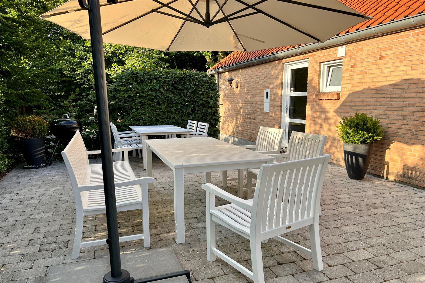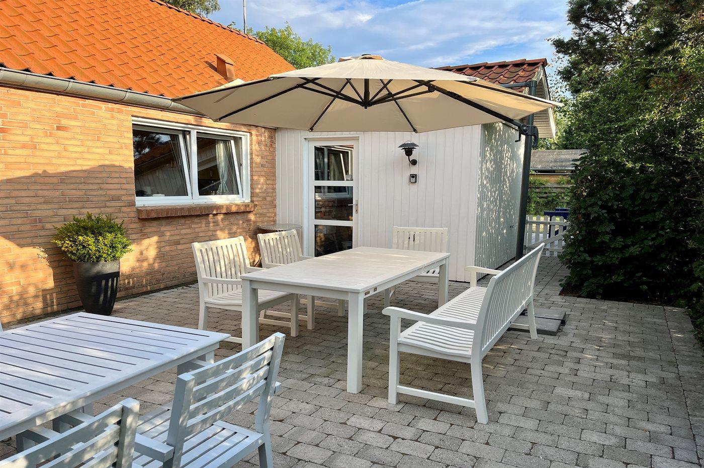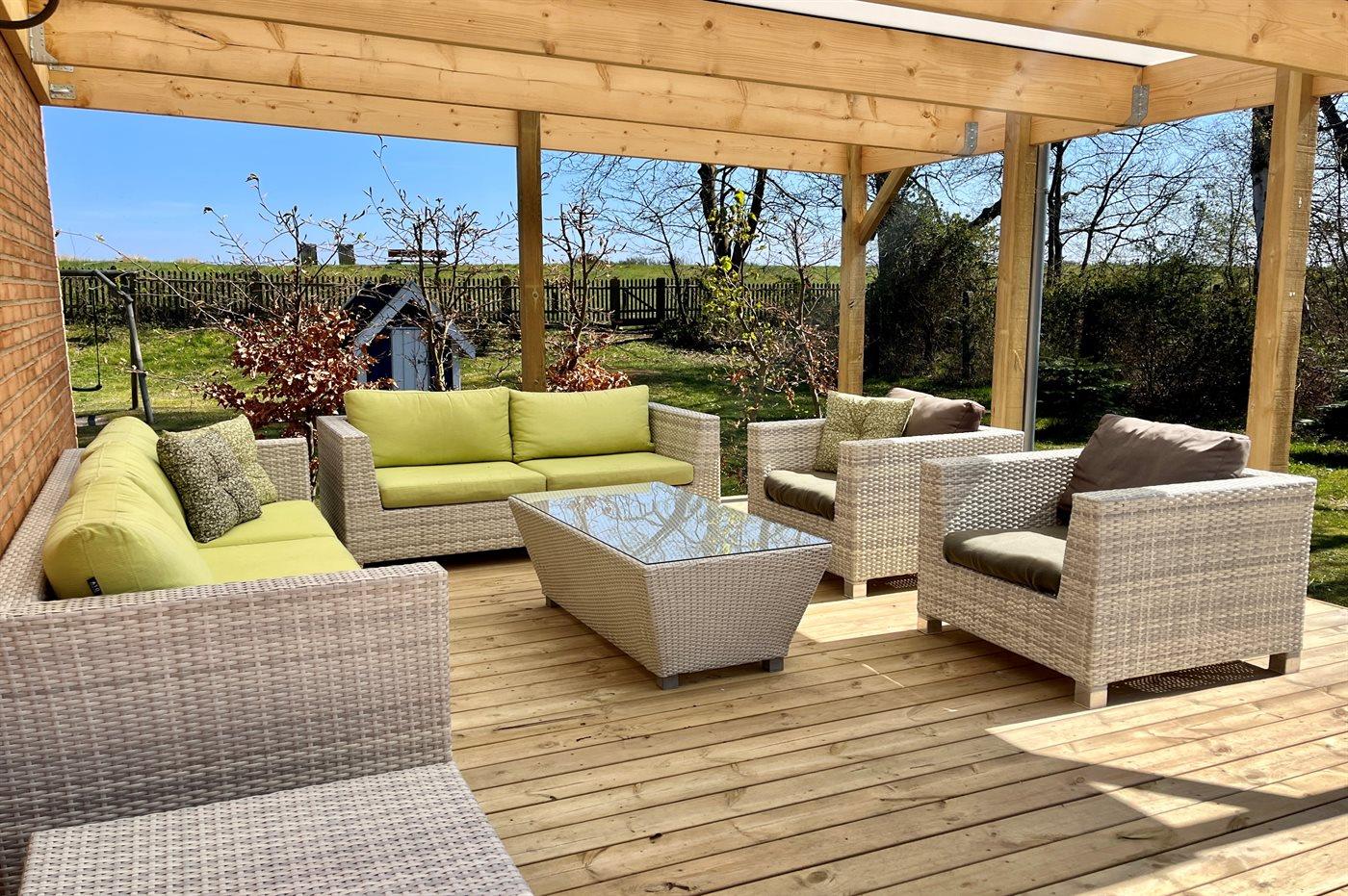 Der er etableret en ny overdækket terrasse (2023) med lounge-møbler, hvor du kan sidde hele aftenen til lyden af bølgerne.