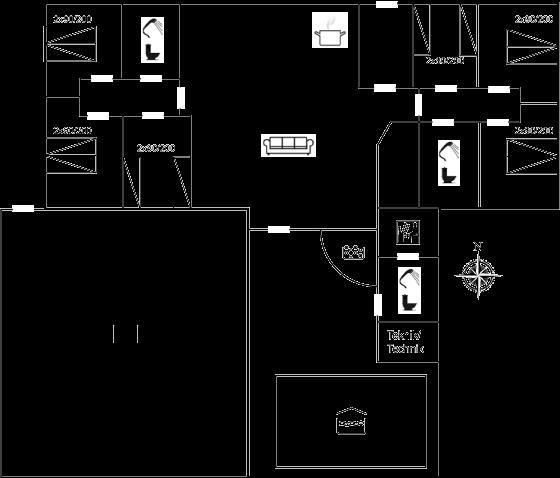 Der er i alt 6 soveværelser. Sovepladserne fordeler sig på: 8 sovepladser i dobbeltsenge. 4 sovepladser i enkeltsenge. Derudover er der 2 stk. barnesenge.