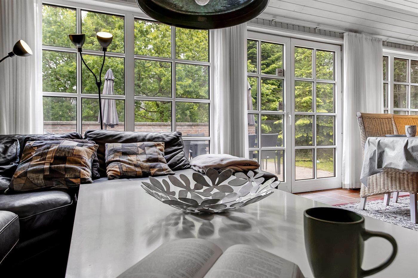 Midt i huset med adgang til den ene terrasse findes opholdsstuen med spisebord til 12 personer - til de små er der en barnestol. Her er også en stor sofagruppe samt tilhørende sofabord. I opholdsstuen er der plads til hygge ved brændeovnen med brætspil og kort Der er gulvvarme i hele opholdsrummet.