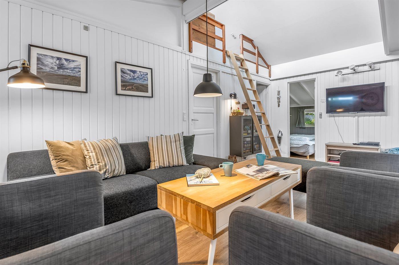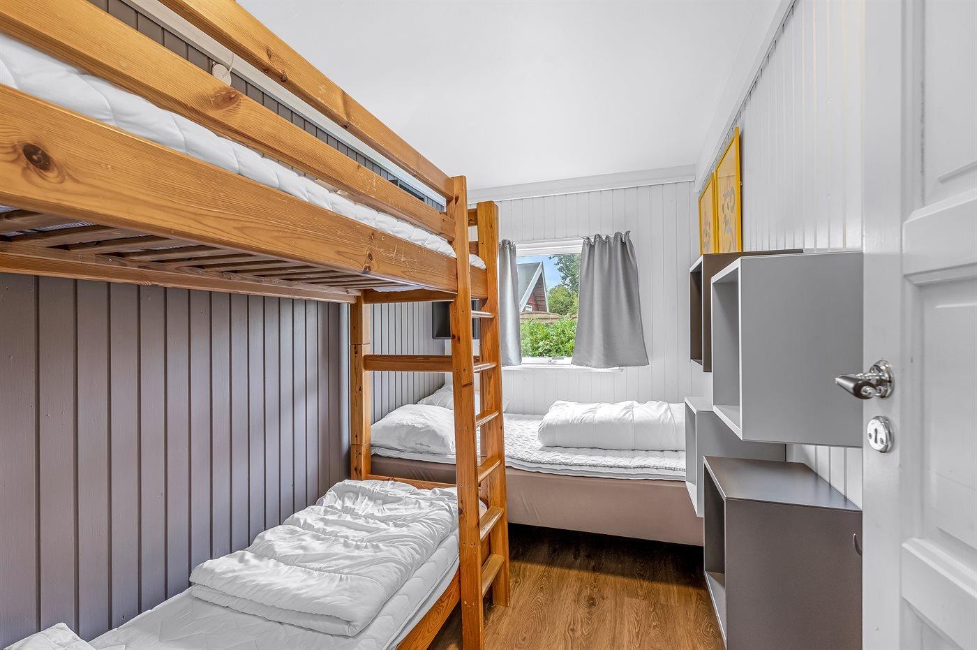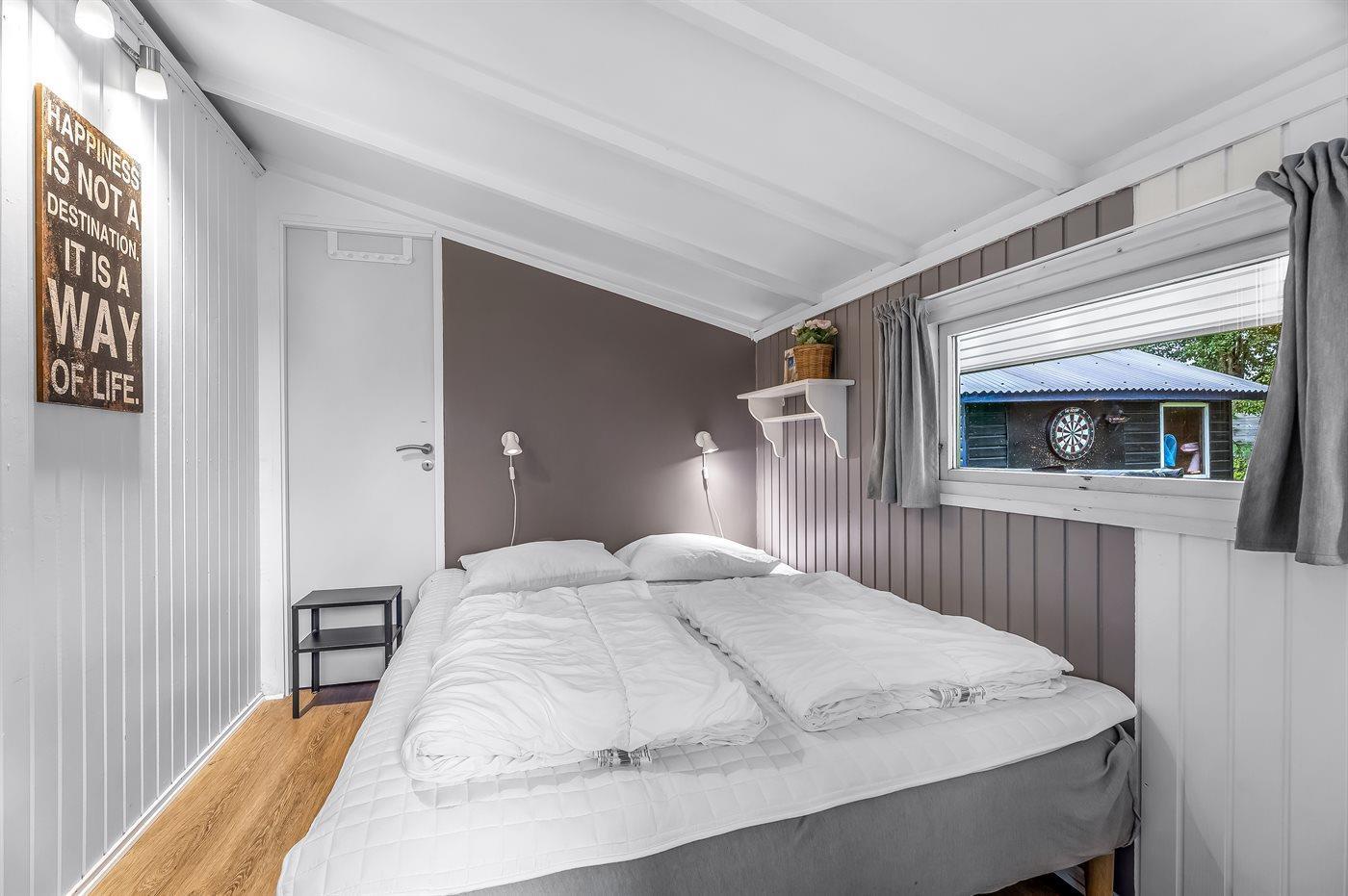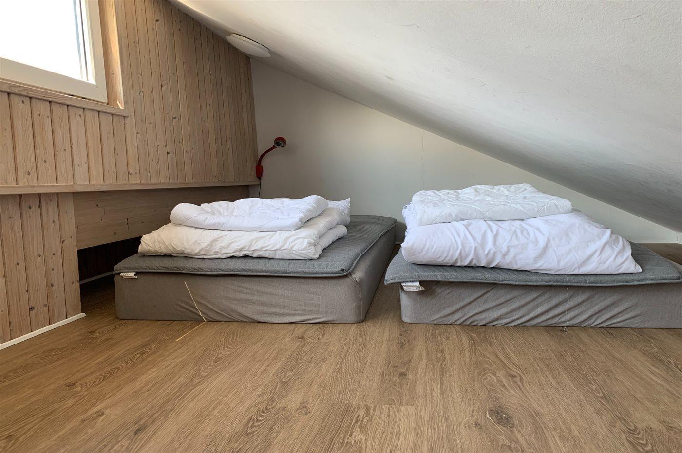 Huset er indrettet med tre soveværelser og sovepladserne fordeler sig på to dobbeltsenge, en soveplads i en bred enkeltseng, to sovepladser i køjeseng og to sovepladser på husets hems.