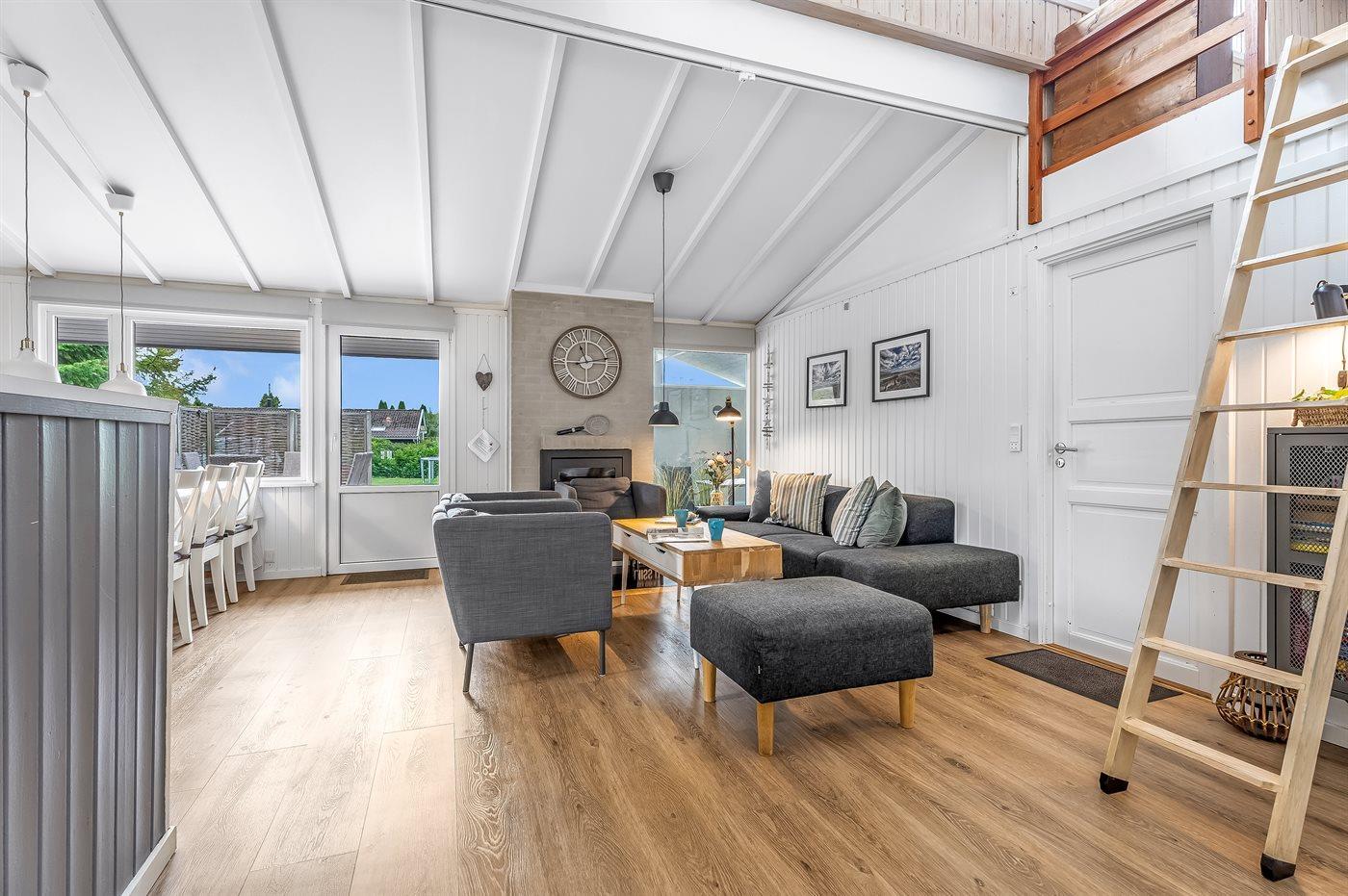 Stuen er indrettet med brændeovn, spiseafdeling og sofagruppe.