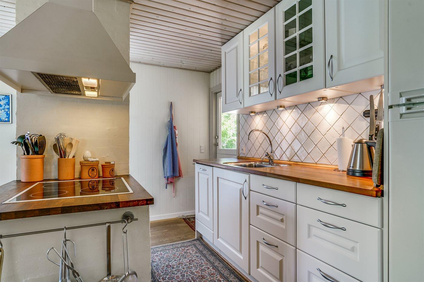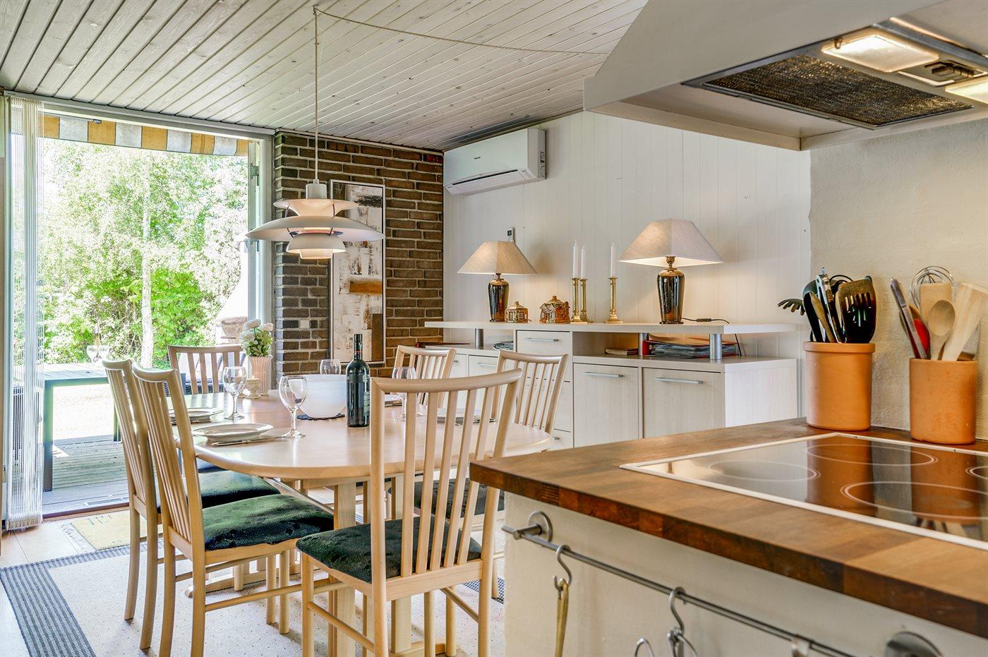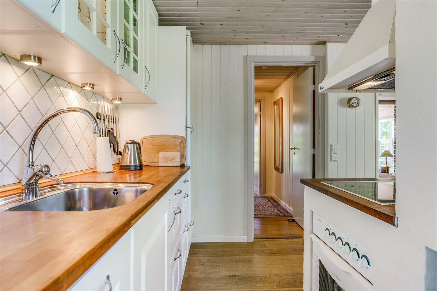 Køkkenet er udstyret med 1 køleskab. Der er 4 keramiske kogeplader, varmluftovn.