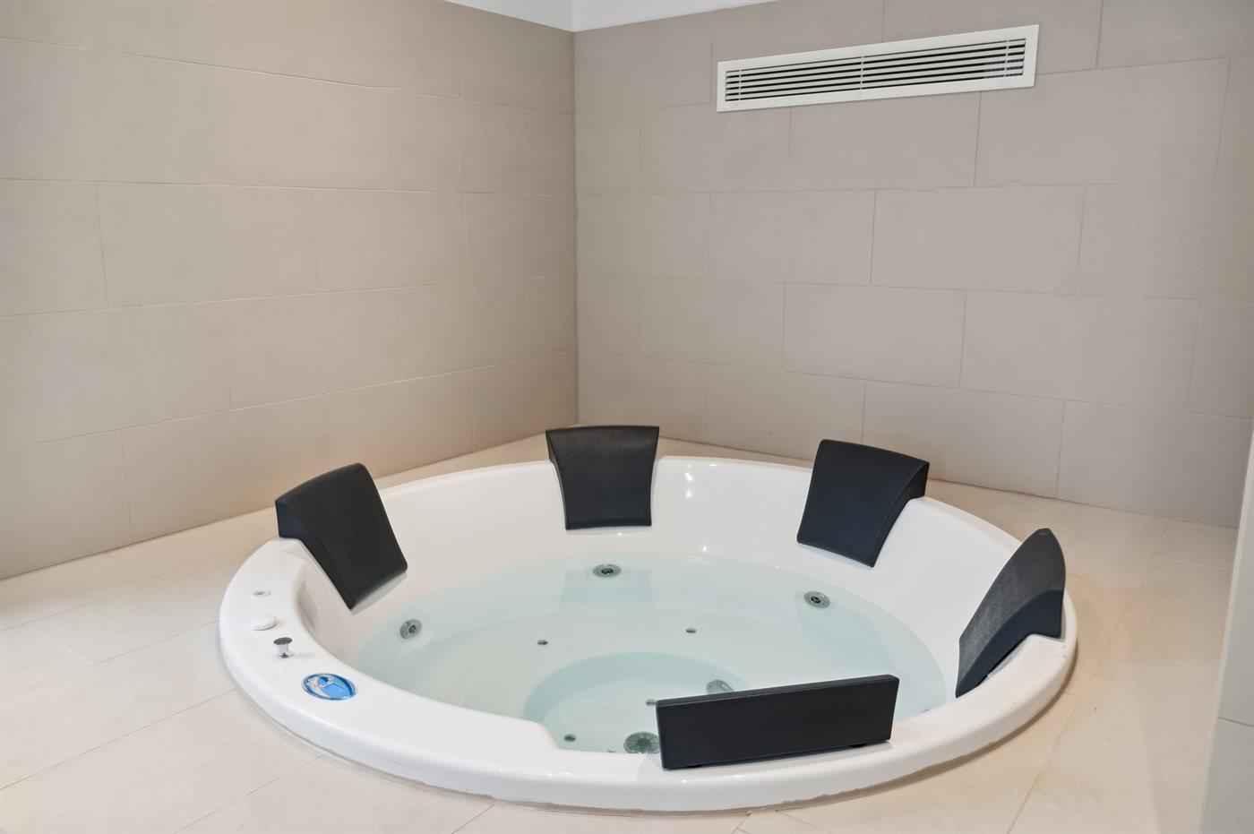 Poolhuset er indrettet med en stor swimmingpool på 4 x 7 m. og en dybde på 1,4 m. En trappe fører ned i poolen, som også er monteret med et modstrømsanlæg (svømmetræner). Desuden findes der en nedbygget spa med plads til 6 personer samt en sauna også med plads til 6 personer. Poolen har et selvstyrende kemianlæg, som sikrer en ensartet klorbalance, hvilket betyder at den aldrig er for høj og ikke for lav, og der er ingen ubehagelig klorlugt. Poolen bliver naturligvis stadig serviceret 1-2 gange om ugen.