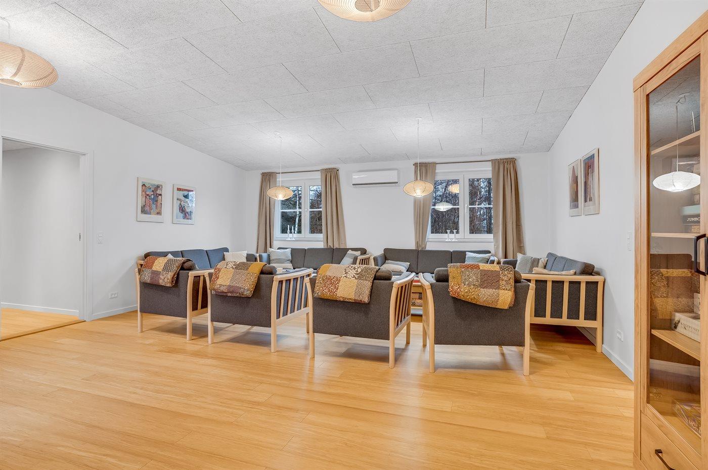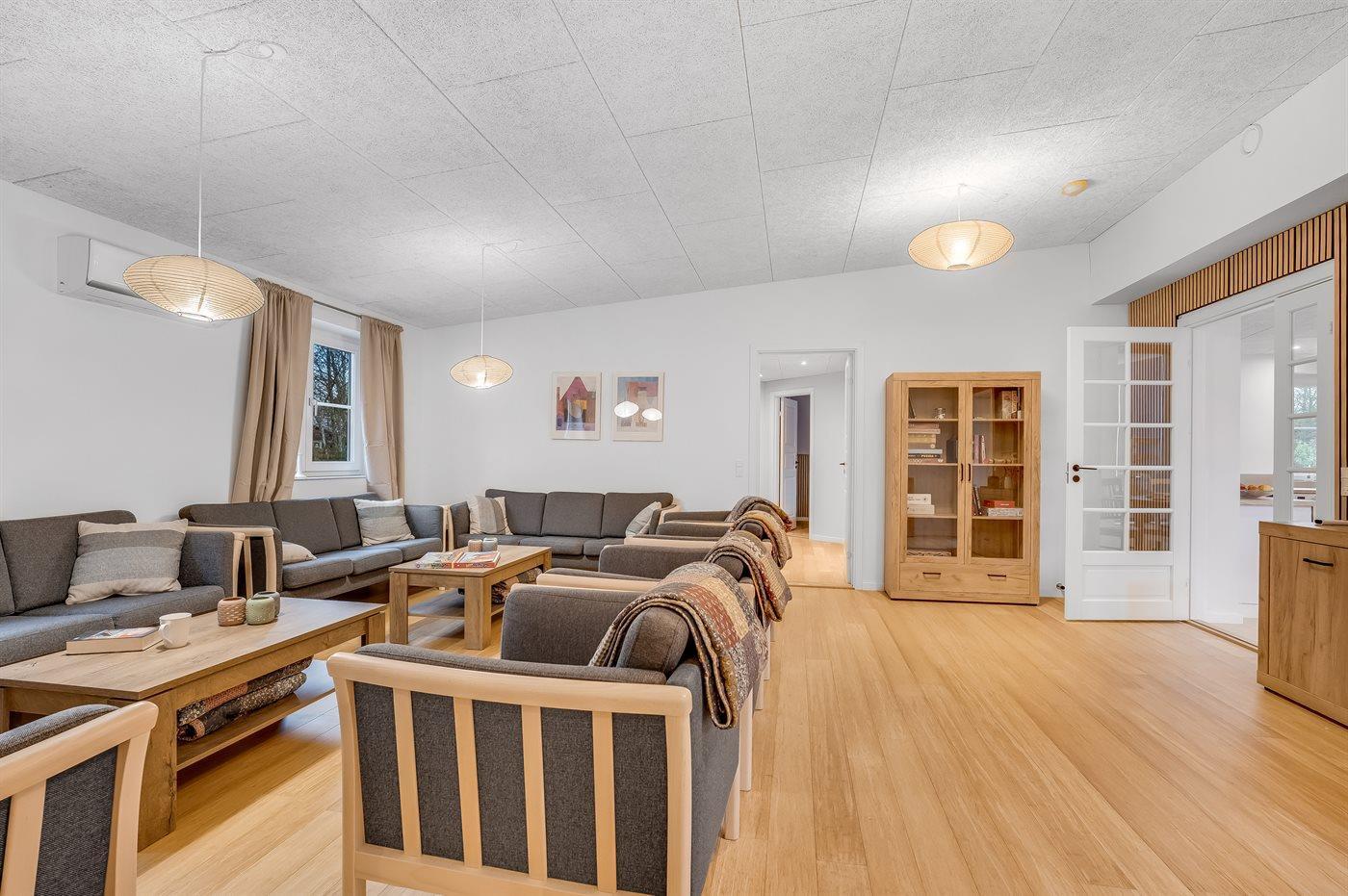 Dagligstue: I huset er der en stor dagligstue med 16 siddepladser til voksne, et 75” TV med mange kanaler bl.a. DR1, TV2, en del tyske kanaler samt over 50 Samsung TV-kanaler. Der findes forskellige spil i skabet i stuen og lidt bøger.