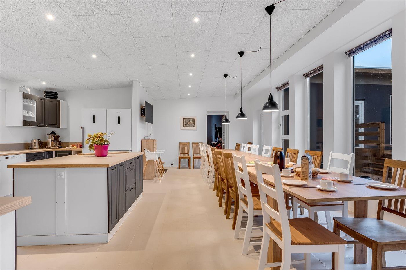 Køkkenet, som er separeret fra stuen, er veludstyret med 2 elkomfurer med hver sin ovn og 4 kogeplader, der er 2 køleskabe, hvoraf det ene også har fryser, 2 opvaskemaskiner, 2 mikrobølgeovne, 2 Mokkamaster kaffemaskiner og meget mere. Der findes et langt bord med plads til 22 personer, der står også 2 barnestole, og der er opsat et 43” TV.