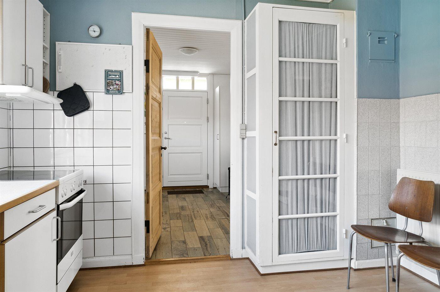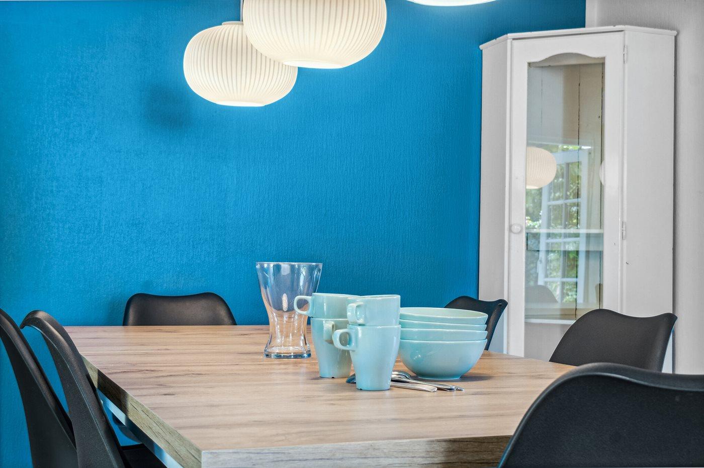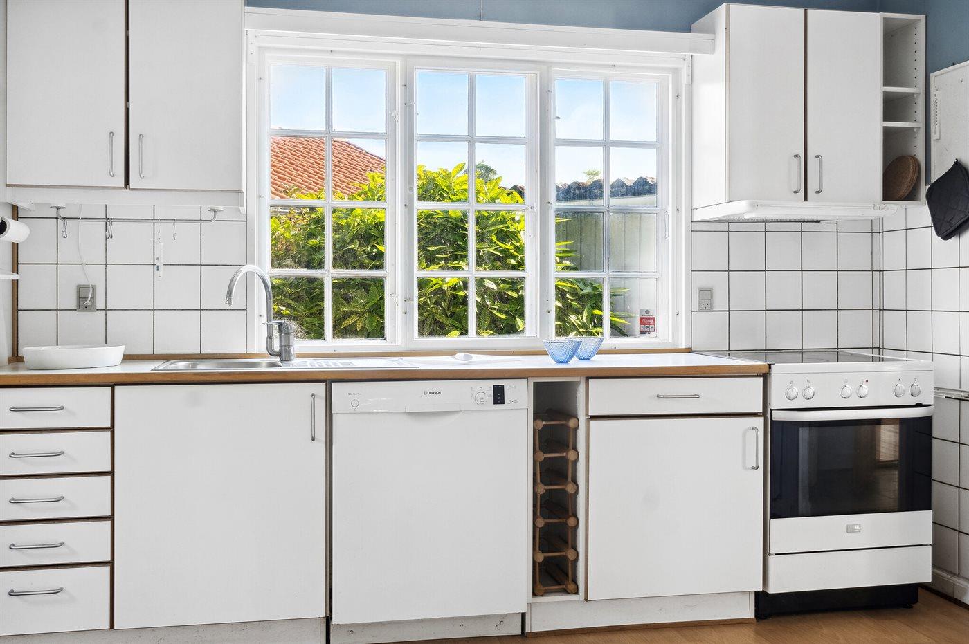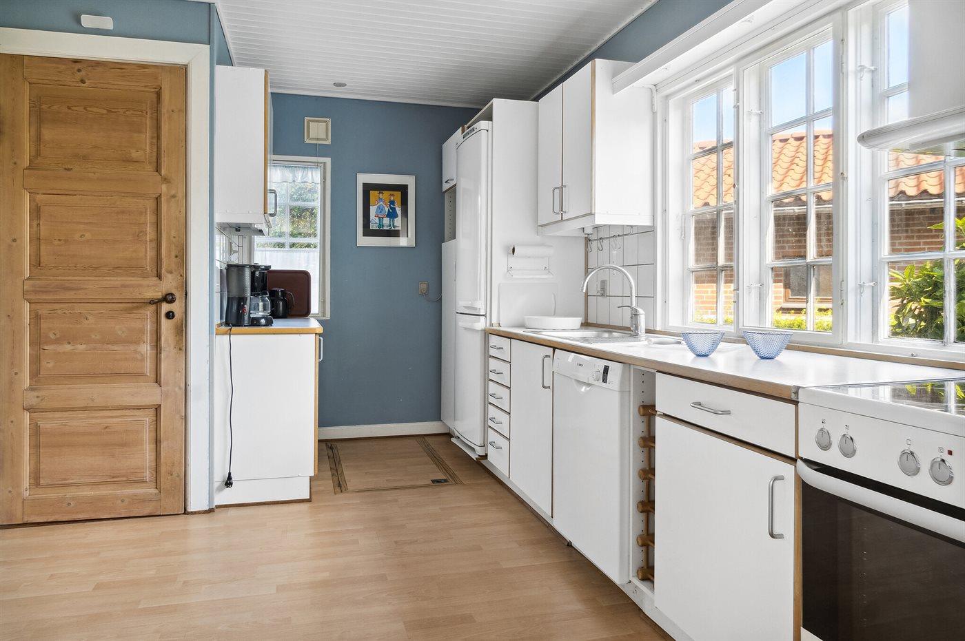 Køkkenet er udstyret med 1 køleskab. Der er 4 keramiske kogeplader, varmluftovn, mikrobølgeovn samt opvaskemaskine.