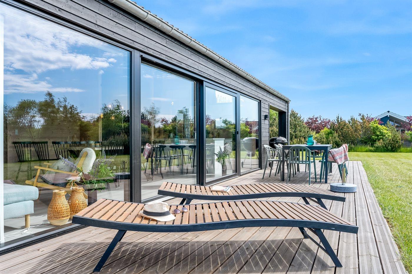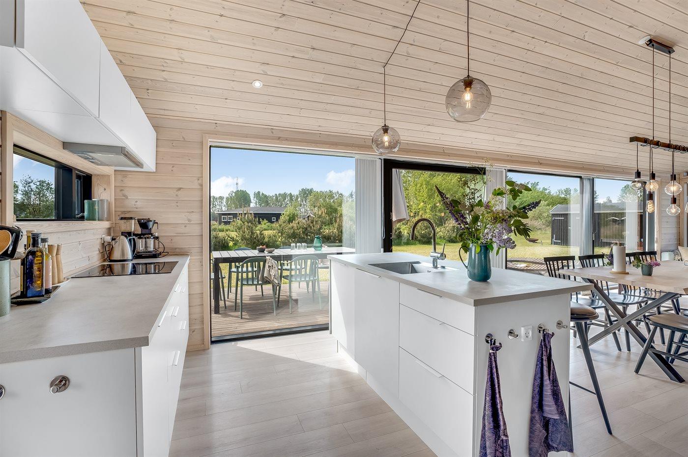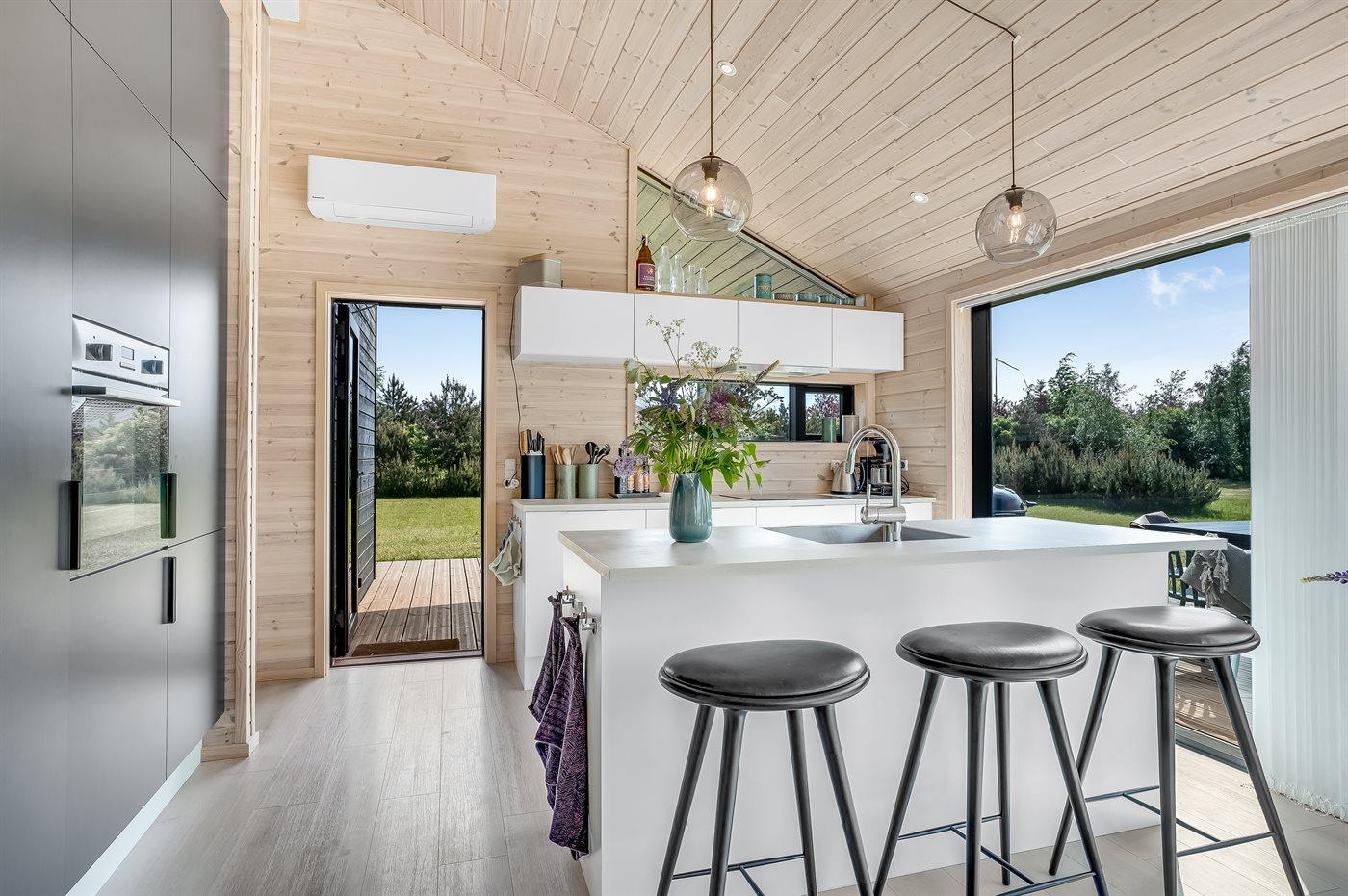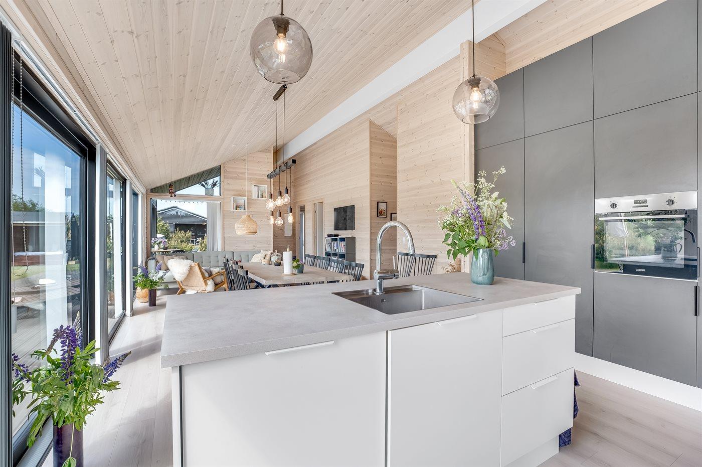 Fra stuen er der adgang til en træterrasse med lounge- og havemøbler samt gode kroge, hvor du kan sætte dig med en bog og slappe af. Tilbered lækre måltider på grillen, mens børnene leger på grunden.