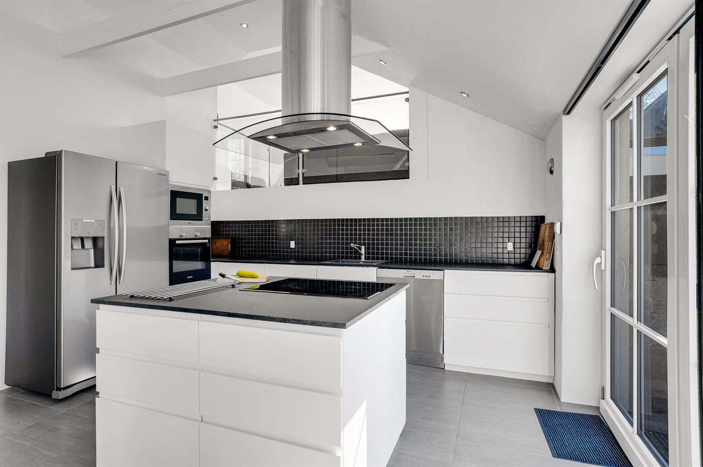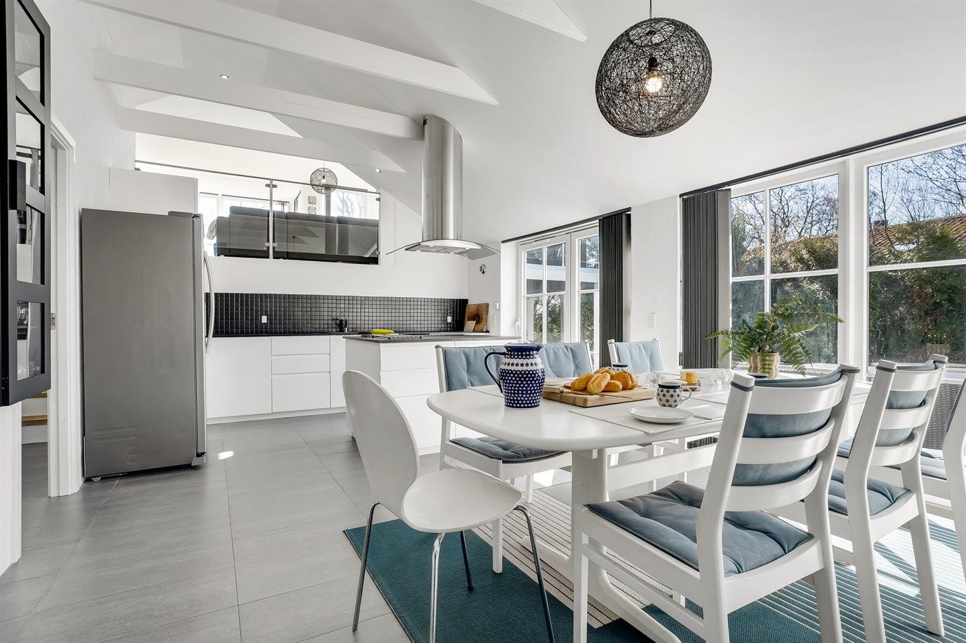 Køkkenet er udstyret med 1 køleskab. Der er 4 keramiske kogeplader, varmluftovn, mikrobølgeovn samt opvaskemaskine.