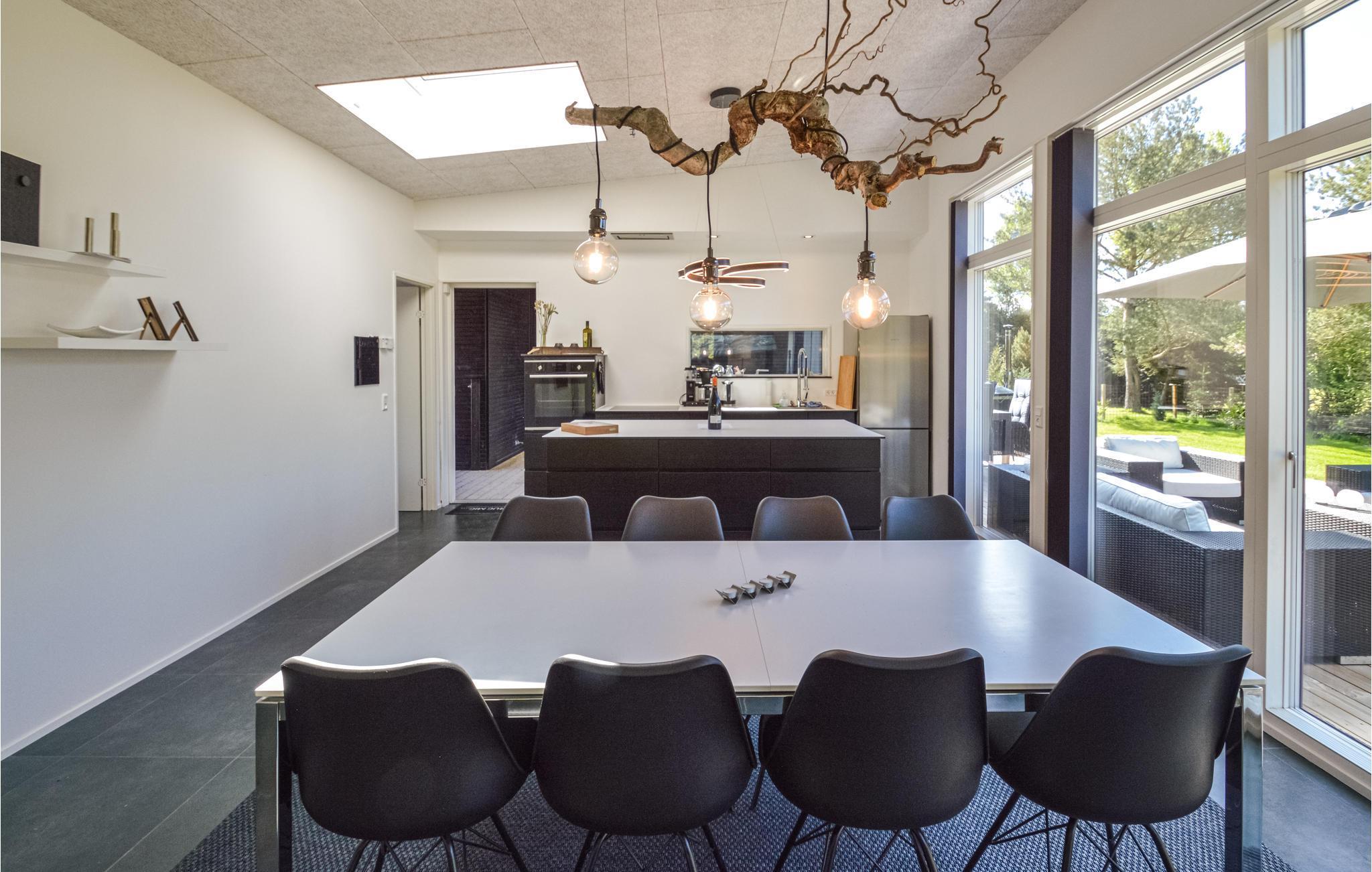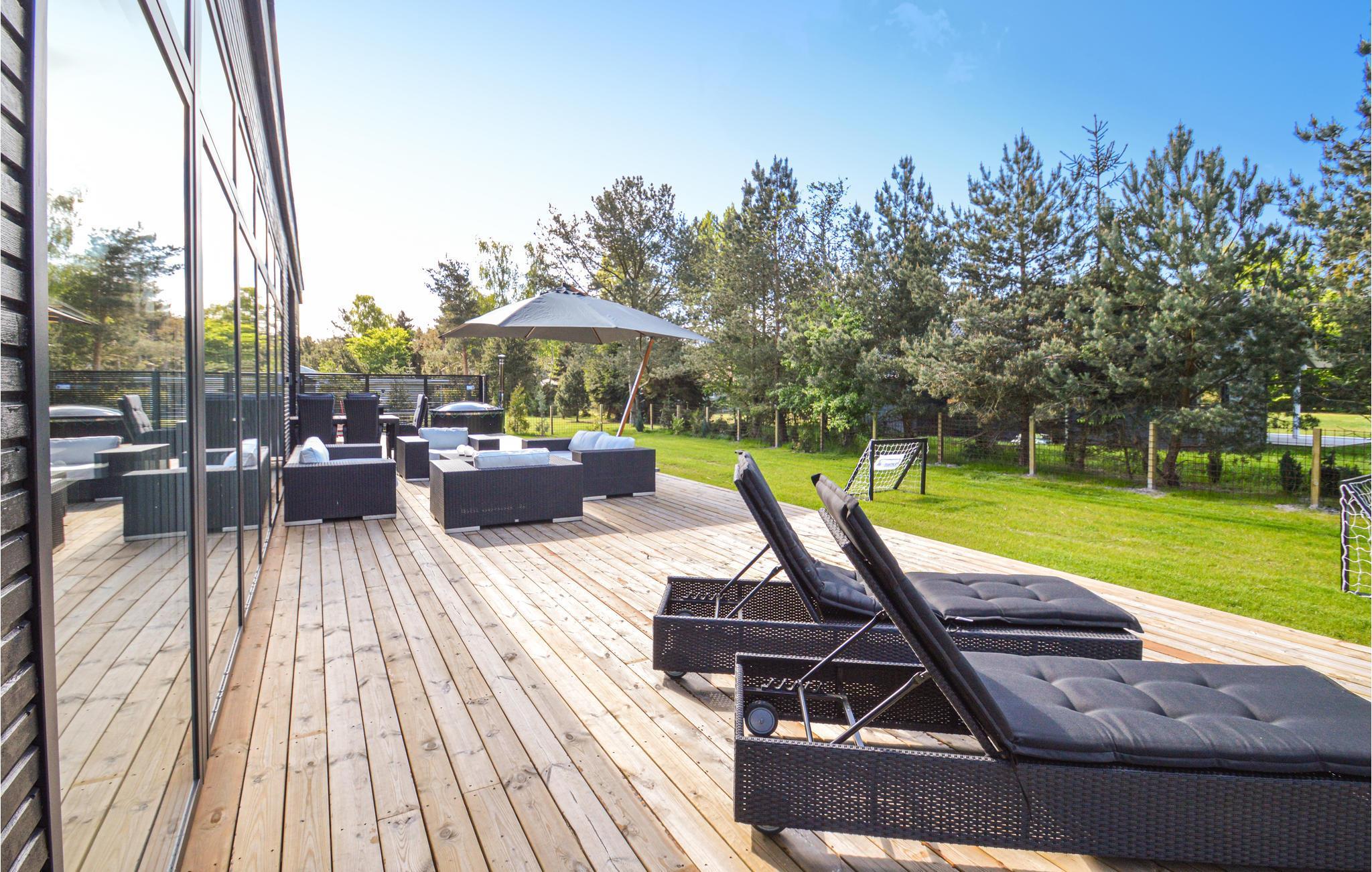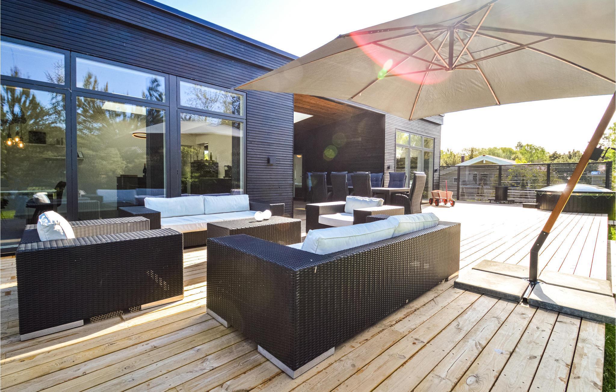 Smukt arkitekttegnet sommerhus ved Marielyst på Falster. Huset er opført i de bedste materialer og ligger på en stor grund i lukket område. Stor lys opholds og spisestue i forbindelse med åbent køkken. De store vinduespartier, kaster masser af lys ind i stuen. Herfra er der udgang til terrassen med integreret vildmarksbad til 5 personer og gode havemøbler. Overdækket terrasse i forbindelse med tilbygningen der indeholder badeværelse og soveværelser. Huset opvarmes via varmepumpe og der er gulvvarme i hele huset. I det ene badeværelse er der sauna og 5 personers spabad. Et rigtig dejligt sommerhus med alt hvad du behøver til den perfekte ferie. Marielyst byder på masser af forlystelser - restauranter og indkøbsmuligheder.