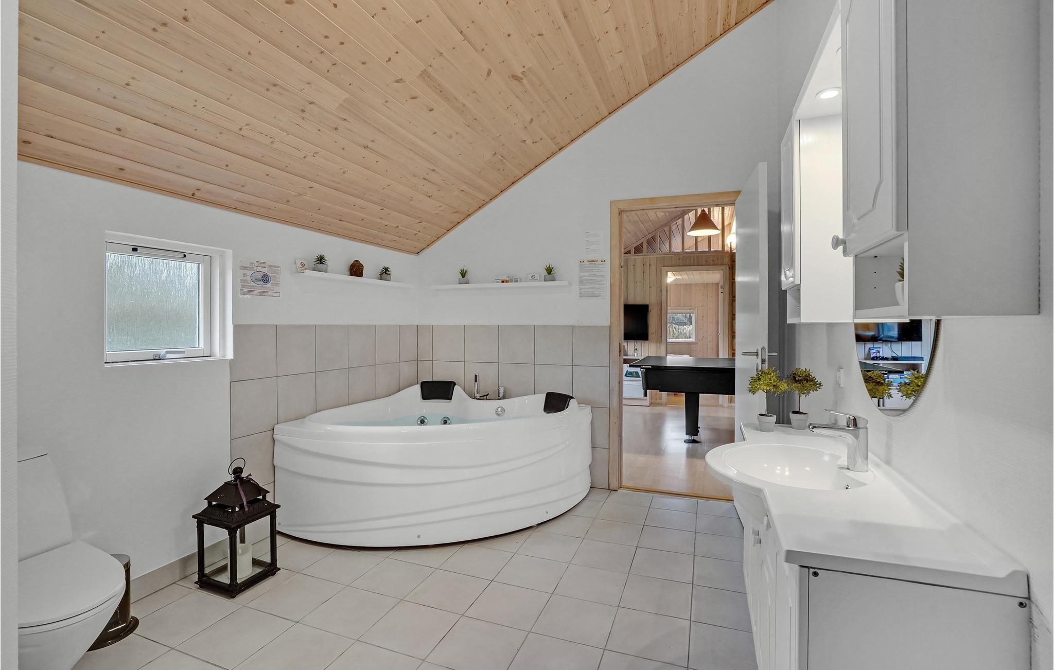 I aktivitetsrummet er der mange muligheder for underholdning og aktiv timer - poolbord, bordtennis, dart, shuffleboard og PS4. I det ene badeværelse kan I slappe af i den luksuriøse jacuzzi eller gå i sauna. Husets centrum er den lyse, åbne stue med spiseplads, sofaafdeling og køkken, hvor I kan tilbringe mange hyggelige timer sammen. I de køligere årstider sørger en varmepumpe for en behagelig temperatur, men I kan også tænde op, hvis I er til brændeovnshygge.