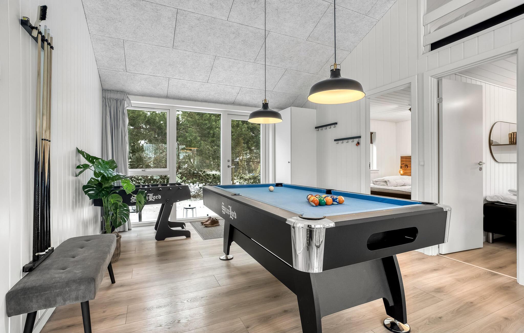 Tilbered en omfattende morgenmad i det moderne køkken, som I alle kan nyde sammen ved det lange spisebord, enten i det stilfulde indendørsområde eller ude på den indbydende terrasse. Der er også sørget for underholdning her. Uanset om det er en omgang billard eller bordfodbold i spillerummet, er der noget for enhver. For fuldkommen afslapning står der en udendørs whirlpool og en sauna til rådighed. Lad sjælen hvile, og nyd den behagelige varme efter en aktiv dag.
