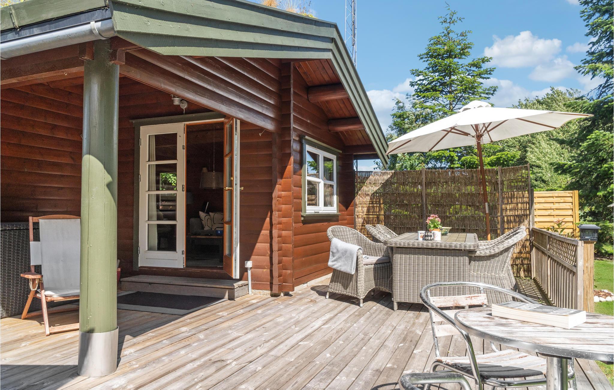 Hyggeligt bjælkehus nær Marielyst strand med terrasse, have og spilleaktiviteter for en afslappende ferie.