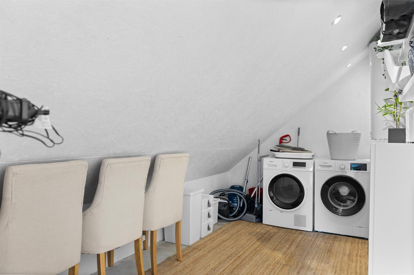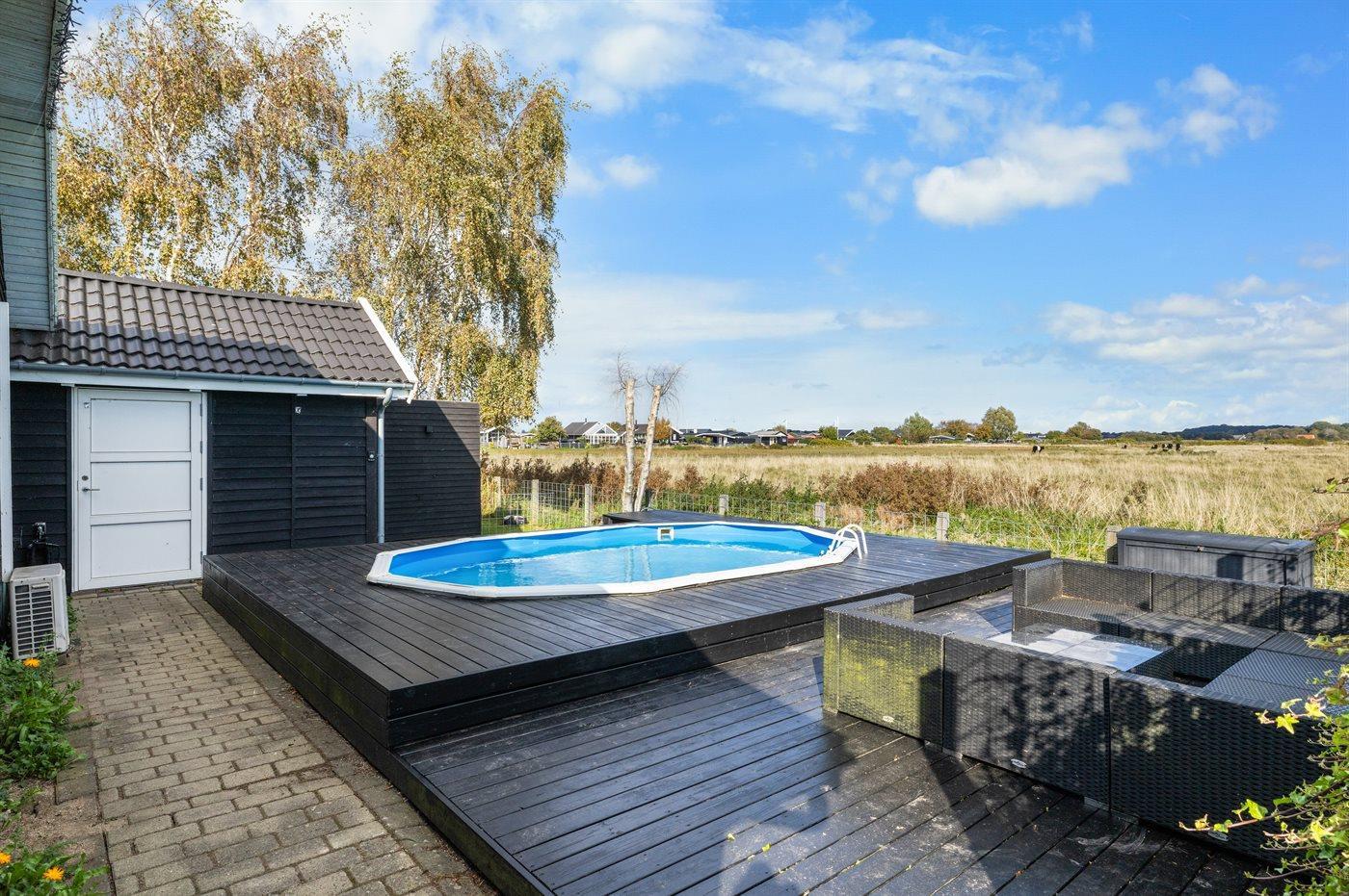 Huset er senest renoveret i 2022 og fremstår i flot, moderne stand. Bag huset findes der et lukket terrasseareal, hvor der er udendørs swimmingpool og loungeområde. Herfra er der udsigt ud over engområdet. Desuden er der et stort, overdækket terrasseareal med direkte udgang fra stuen. På grunden, som er indhegnet, er der god plads til udendørs aktiviteter.