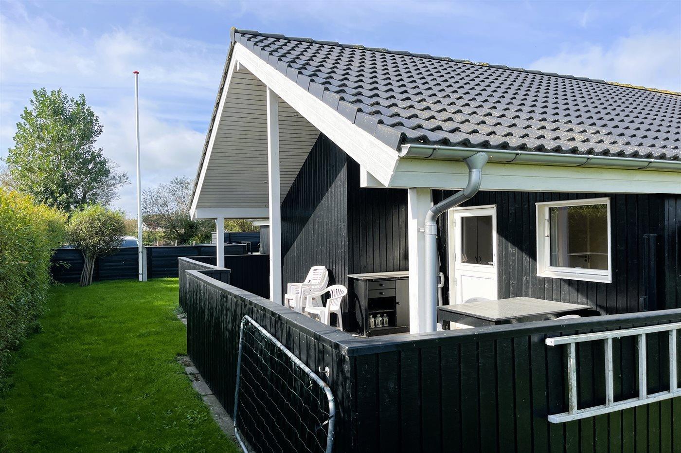 Ferieboligen er beliggende på en 350 m² stor havegrund. Grunden er indhegnet. Der er 150 m til havet. Nærmeste forretning er beliggende i en afstand af 2100 m. Der er en golfbane i en afstand af 5800 m. Til ferieboligen hører åbent terrasseareal. Desuden er der overdækket terrasse. Der er redskabsrum. Grill til rådighed. Der er installeret stik til opladning af elbil. Type 2 stik. Med 11 kW ladeeffekt. Parkering ved ferieboligen.