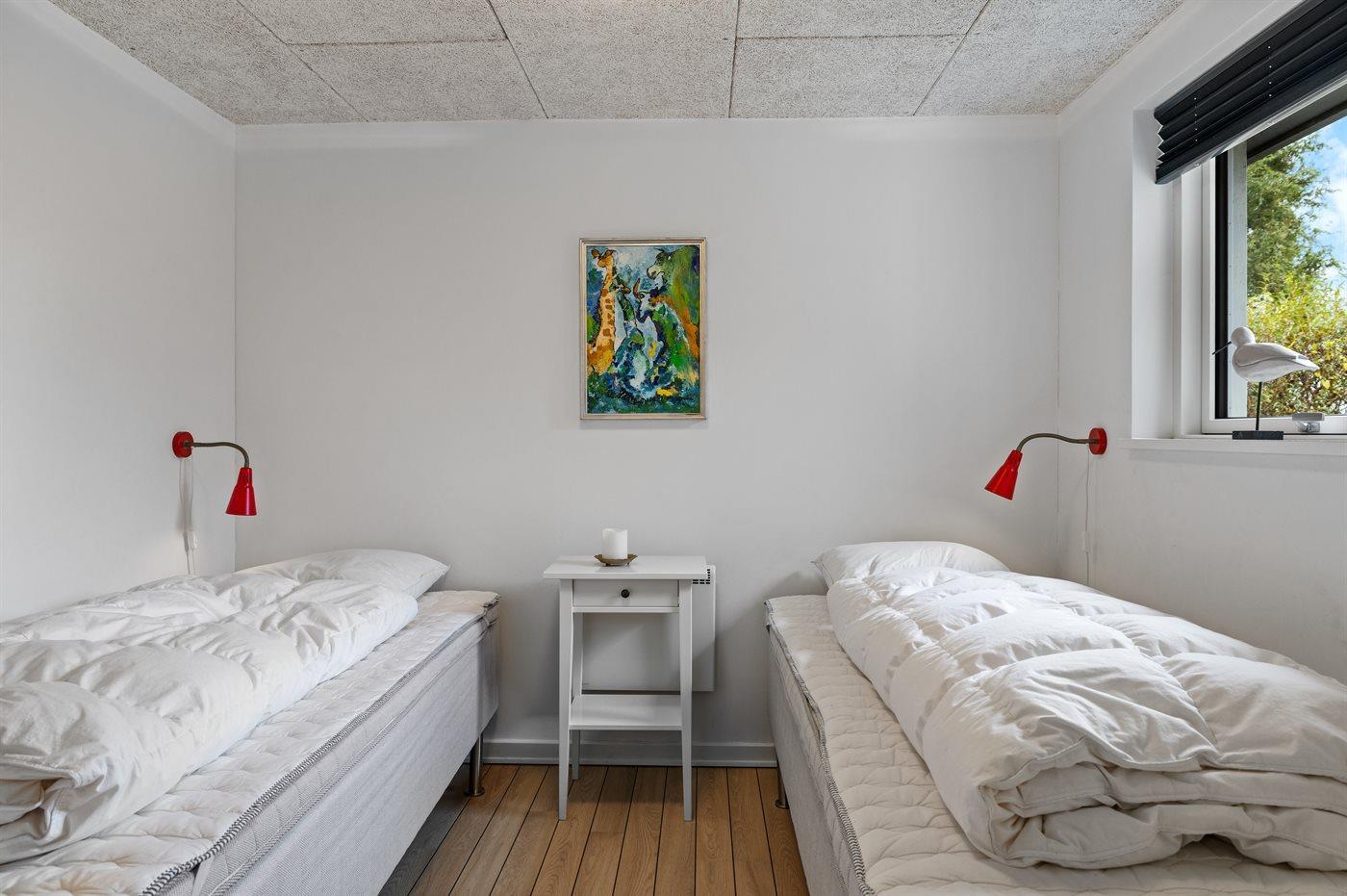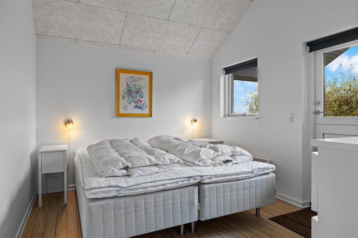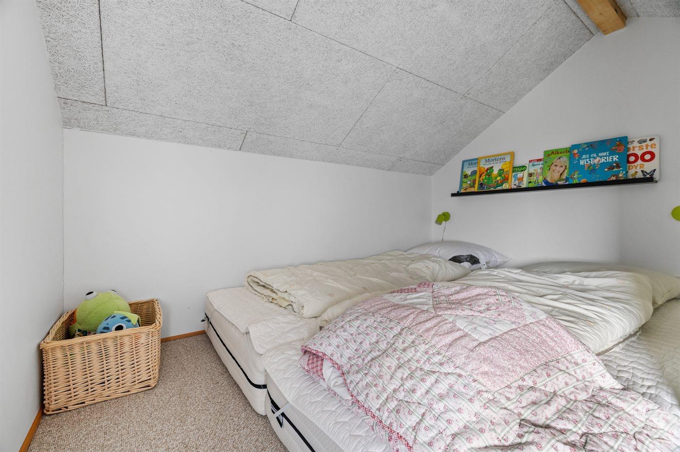 Der er i alt 2 soveværelser. Sovepladserne fordeler sig på: 2 sovepladser i dobbeltseng. 2 sovepladser i enkeltsenge. 4 sovepladser på madrasser. 4 af disse sovepladser befinder sig på hemse i huset. Derudover er der 1 stk. barneseng.