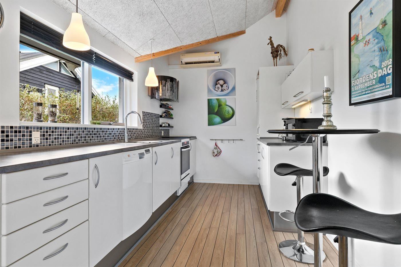 Køkkenet er udstyret med 1 køleskab. Der er 4 keramiske kogeplader, varmluftovn, mikrobølgeovn samt opvaskemaskine.