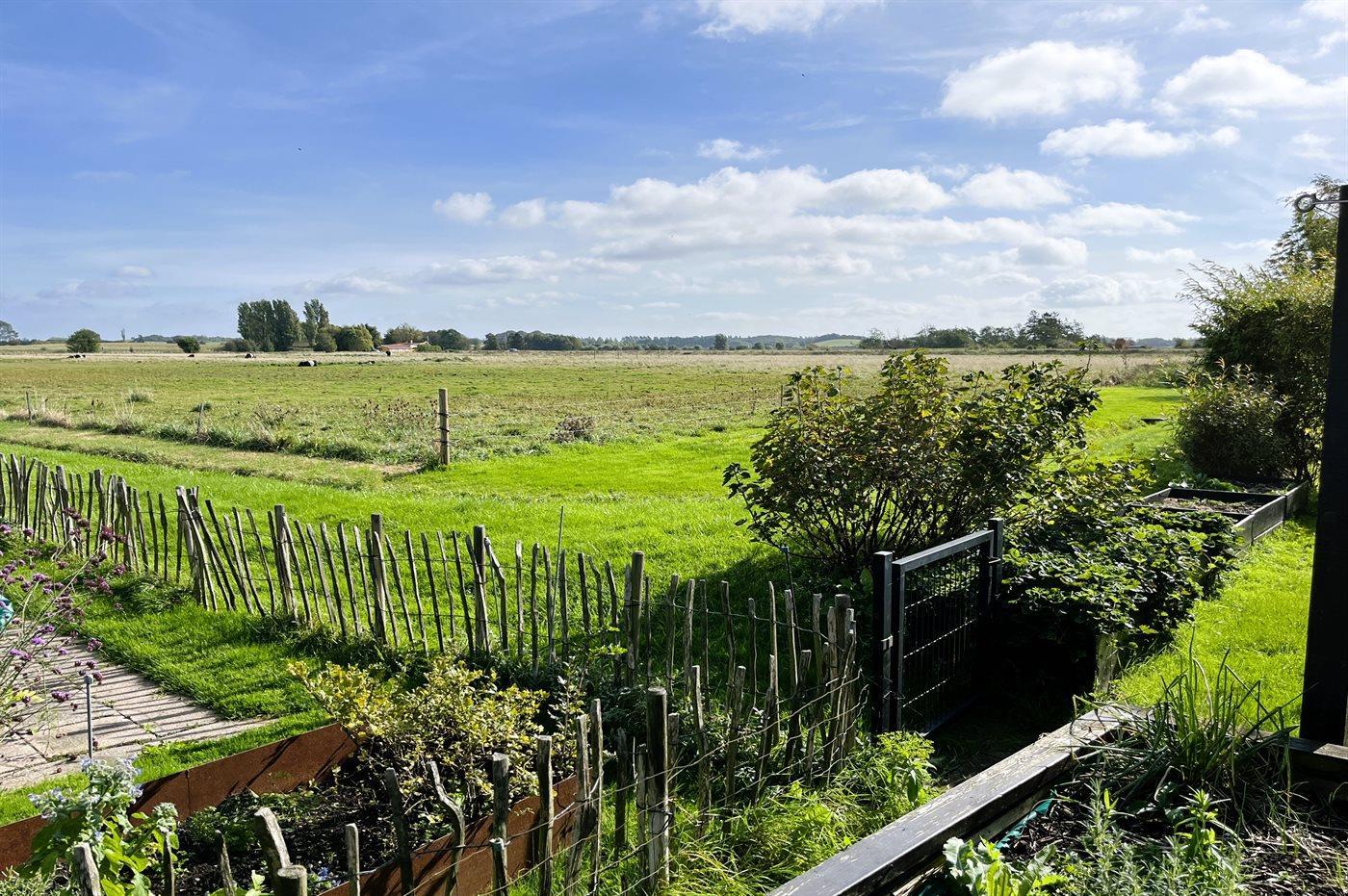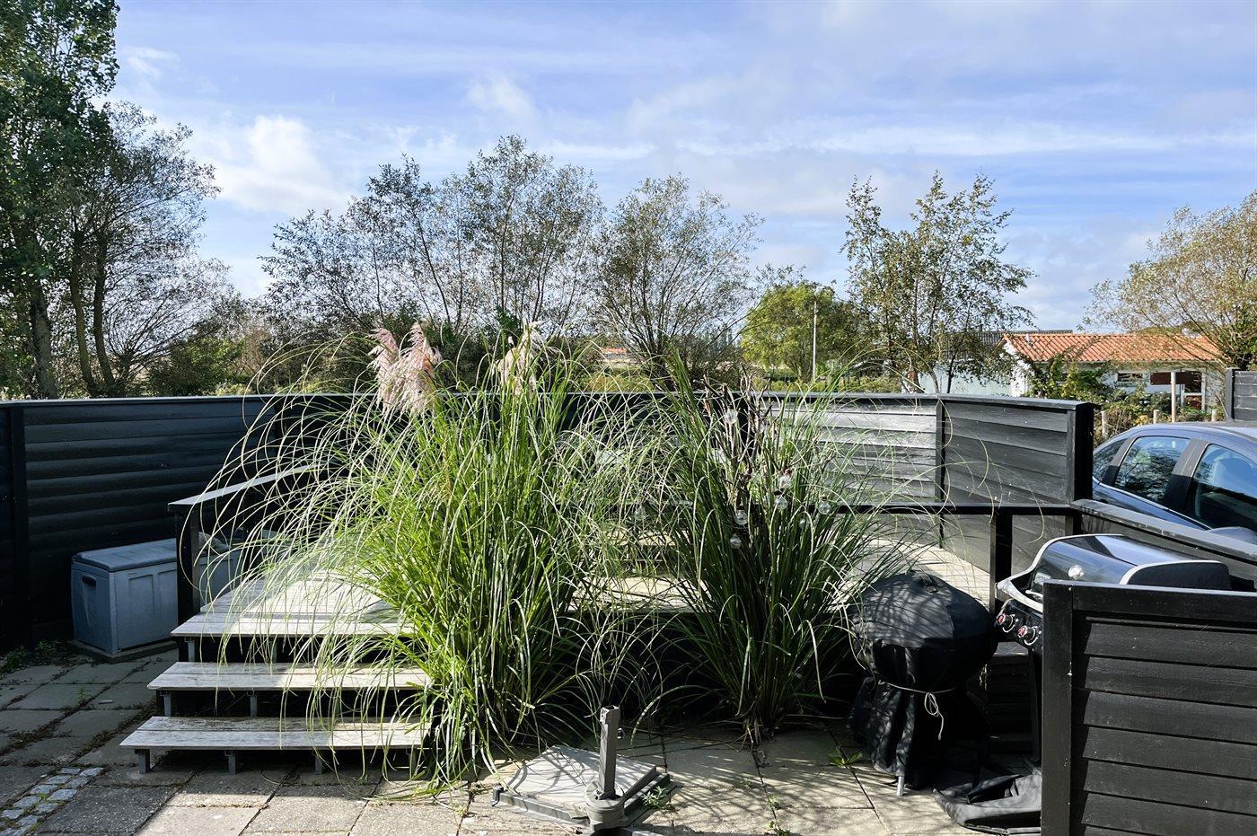 Omkring huset er der flere terrasser, hvoraf to er overdækket. Så her er både mulighed for morgen- og aftensol. Fra den hævede terrasse mod sydvest er der kig til vandet, og fra terrassen bag huset er der udsigt ud over engområdet. Terrasseområdet og en god del af haven er indhegnet.