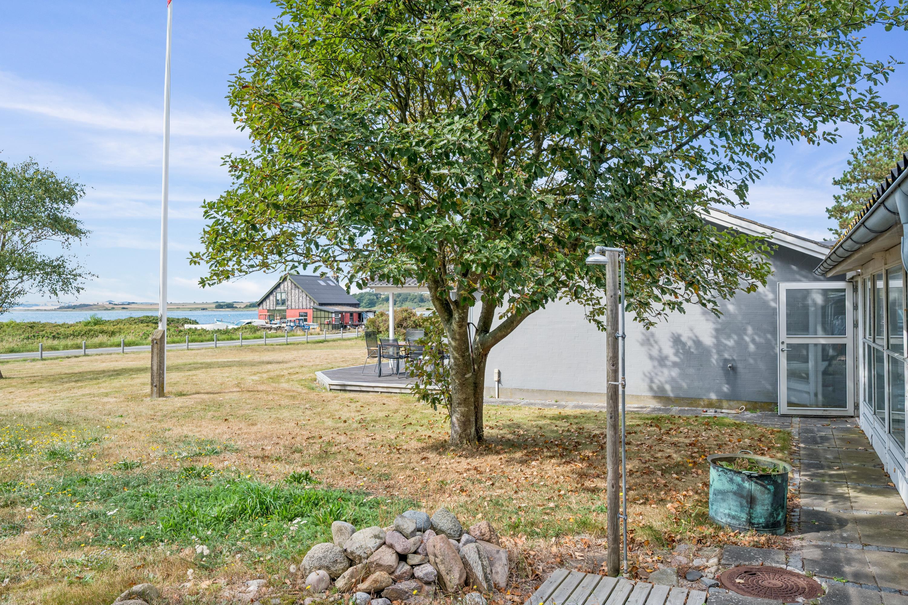 Rummeligt, lyst og skønt feriehus med pragtfuld beliggenhed på kanten af Helgenæs, med panoramaudsigt over Begtrup Vig og bare 75 meter fra stranden. Vestvendt og delvist overdækket træterrasse med udgang fra stue samt stor østvendt fliseterrasse med carport, som er omdannet til lukket terrasse med panoramavinduer mod vandet. Der er havemøbler, liggestole, parasol og grill.