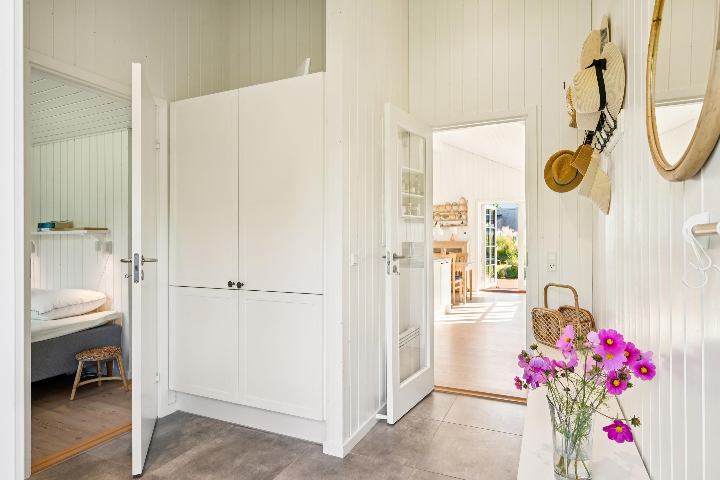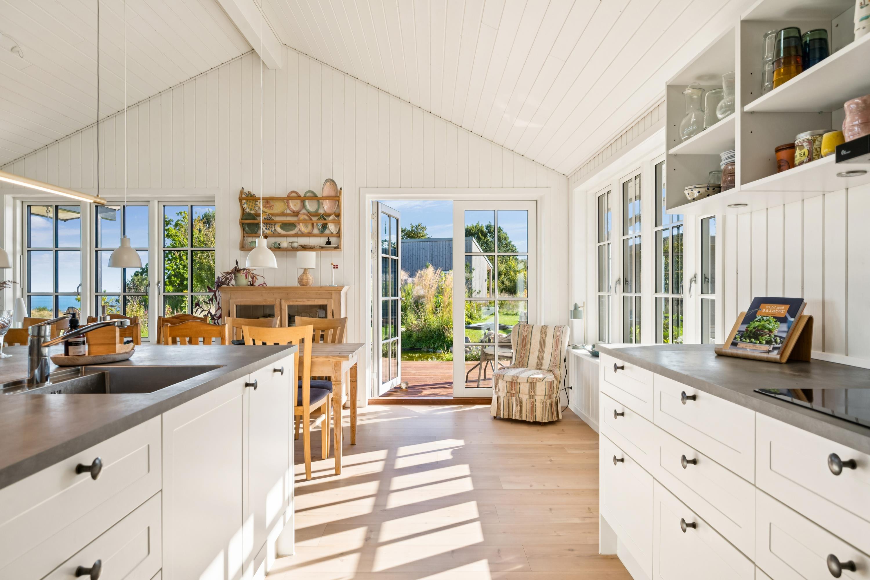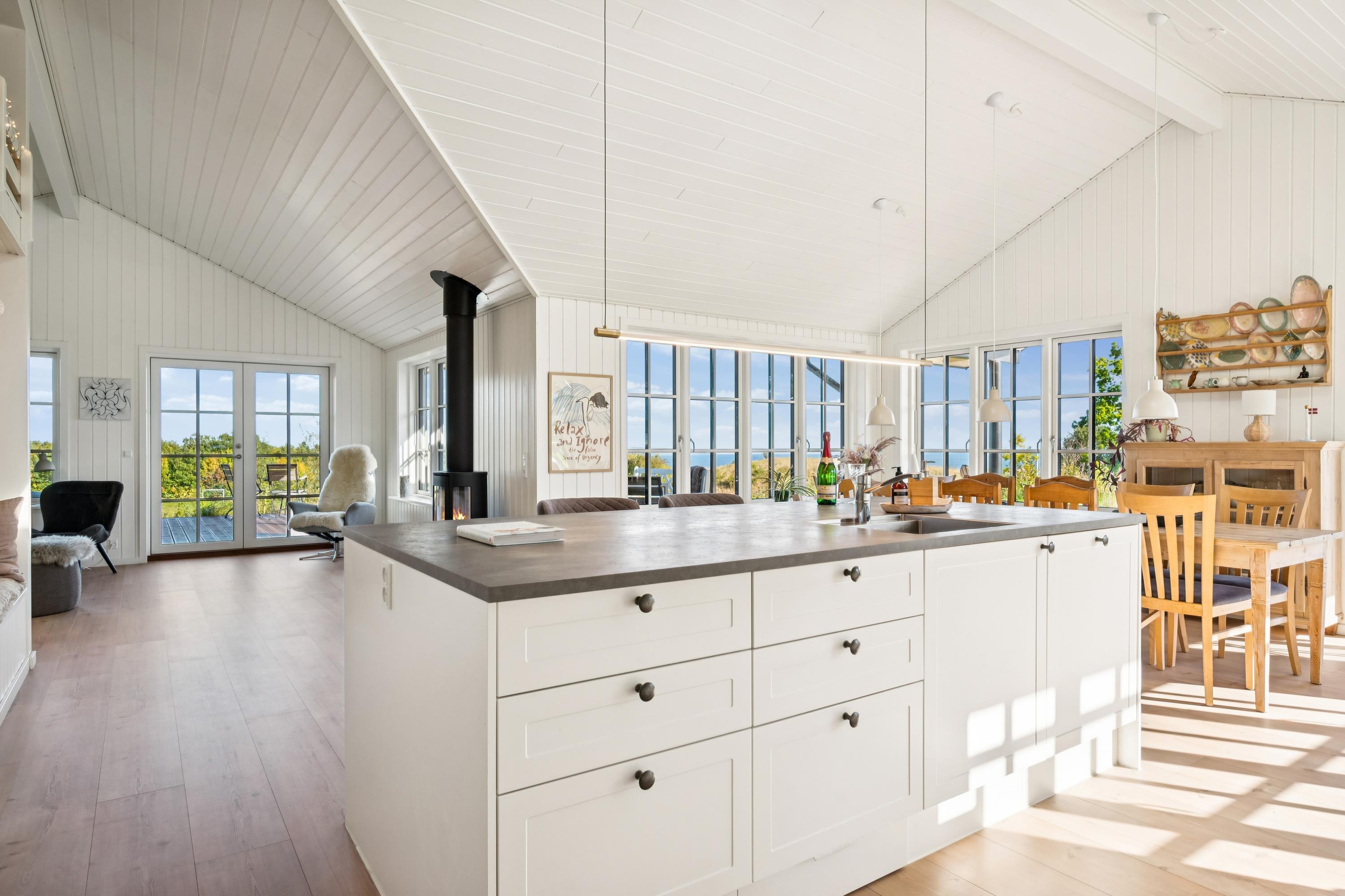 Allerede i entréen mærker man, at her er tænkt på komfort. Der er god plads til overtøj, og her findes også vaskemaskine, som gør huset velegnet til længere ophold. Husets hjerte er det store køkken/alrum, hvor man kan samles om madlavningen, hygge sig i alkoven eller blot nyde lyset og udsigten. Køkkenet har udgang til en skøn terrasse – både overdækket og åben – hvorfra I kan nyde udsigten til guldfiskedammen og det glitrende vand i vigen. Den hyggelige opholdsstue byder på bløde møbler og direkte adgang til endnu en terrasse, der er indrettet med loungemøbler til hyggelige stunder.