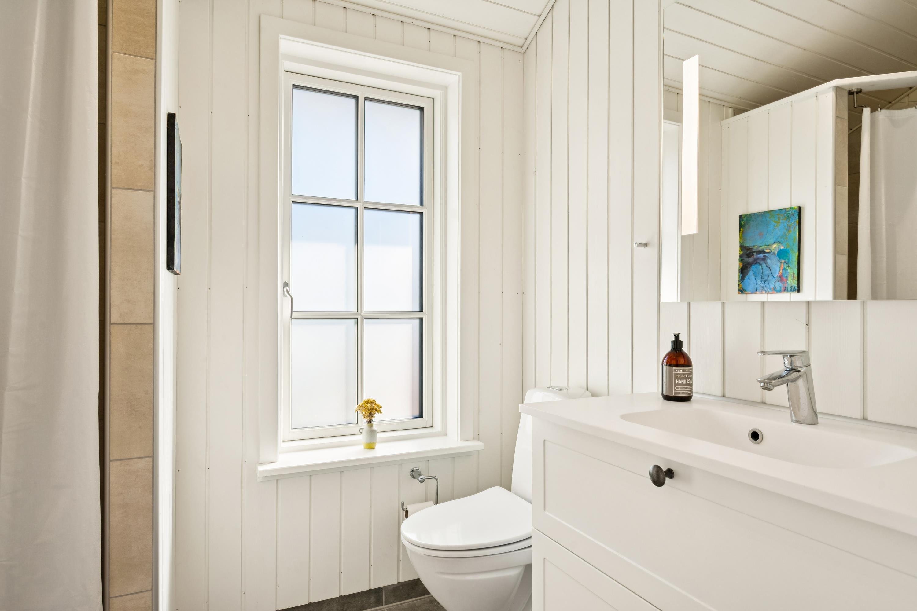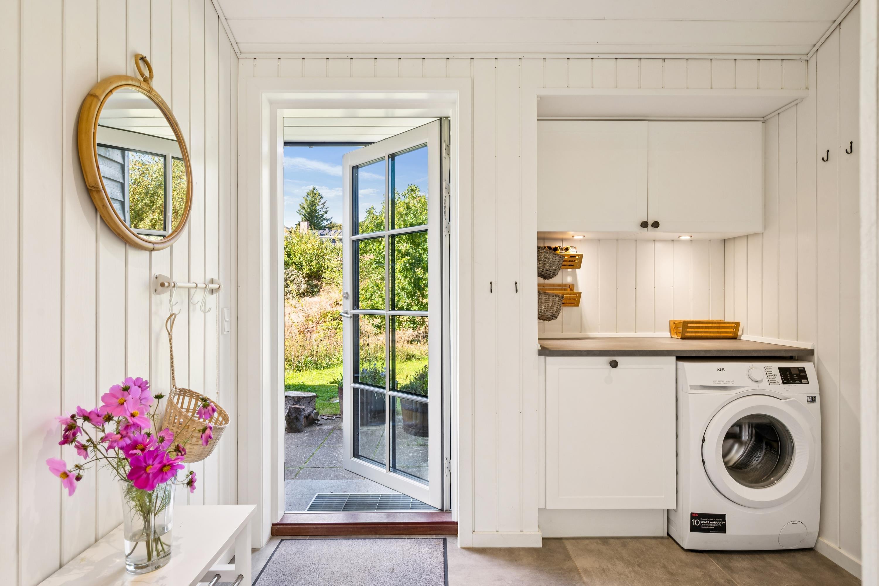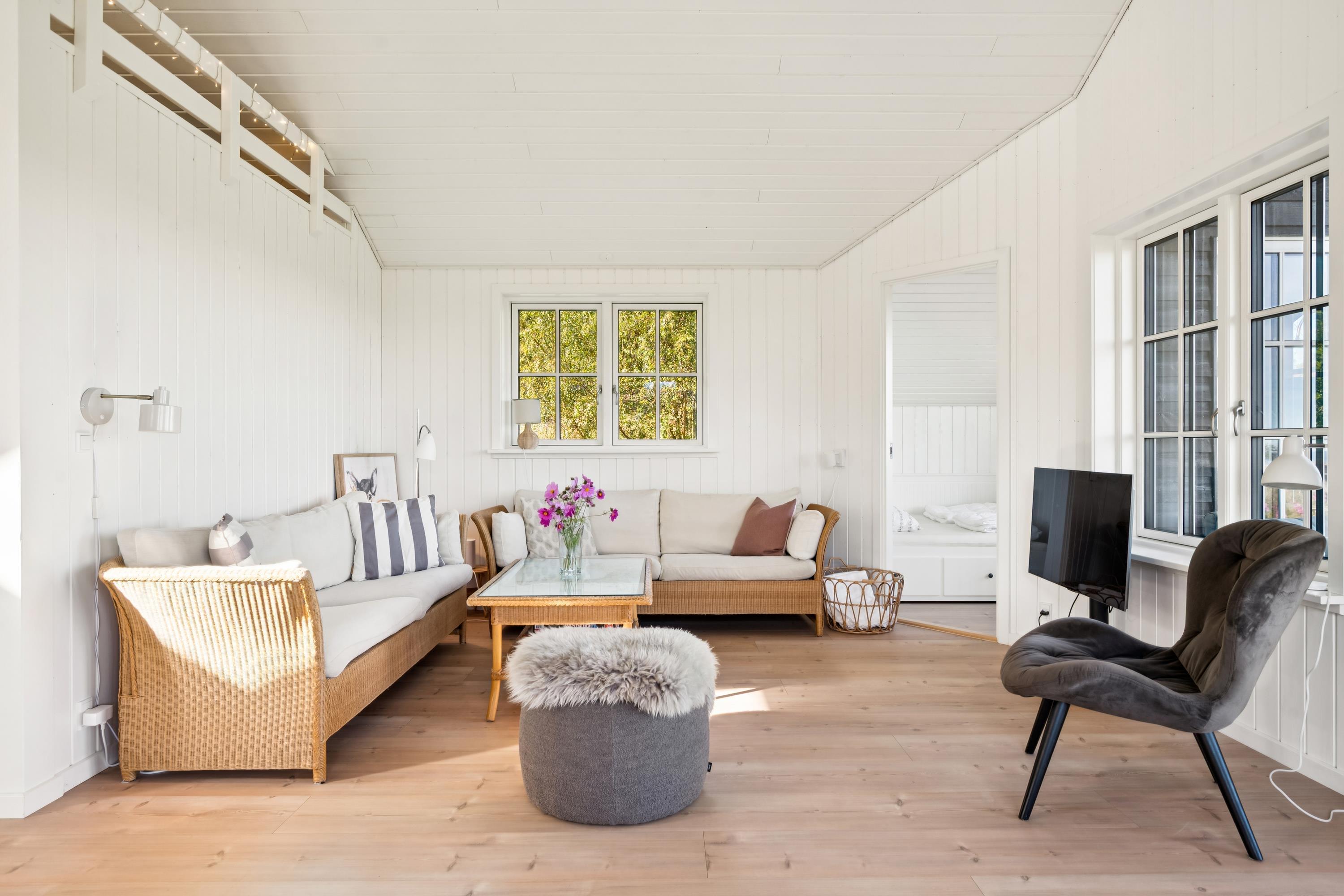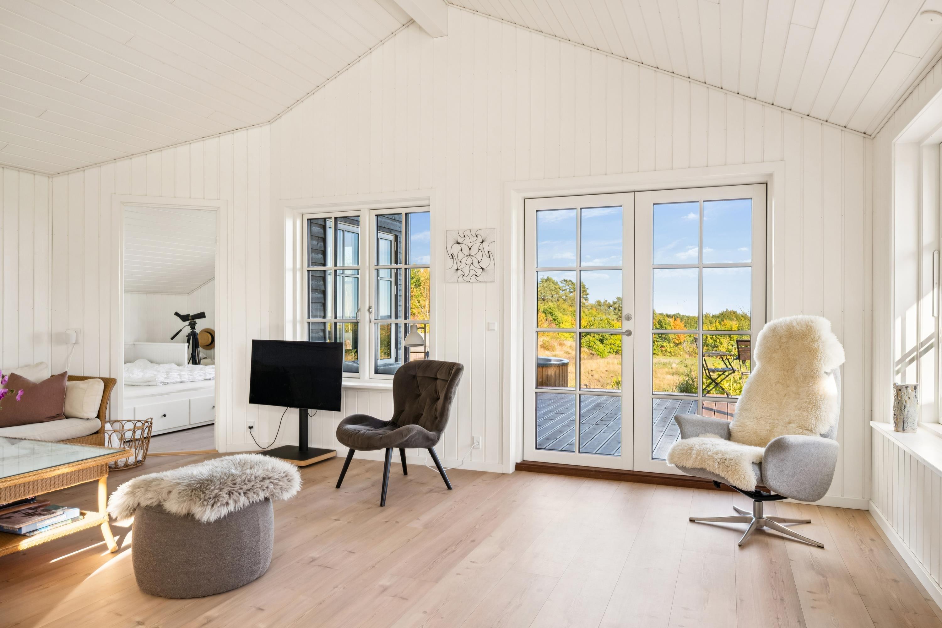 Allerede i entréen mærker man, at her er tænkt på komfort. Der er god plads til overtøj, og her findes også vaskemaskine, som gør huset velegnet til længere ophold. Husets hjerte er det store køkken/alrum, hvor man kan samles om madlavningen, hygge sig i alkoven eller blot nyde lyset og udsigten. Køkkenet har udgang til en skøn terrasse – både overdækket og åben – hvorfra I kan nyde udsigten til guldfiskedammen og det glitrende vand i vigen. Den hyggelige opholdsstue byder på bløde møbler og direkte adgang til endnu en terrasse, der er indrettet med loungemøbler til hyggelige stunder.