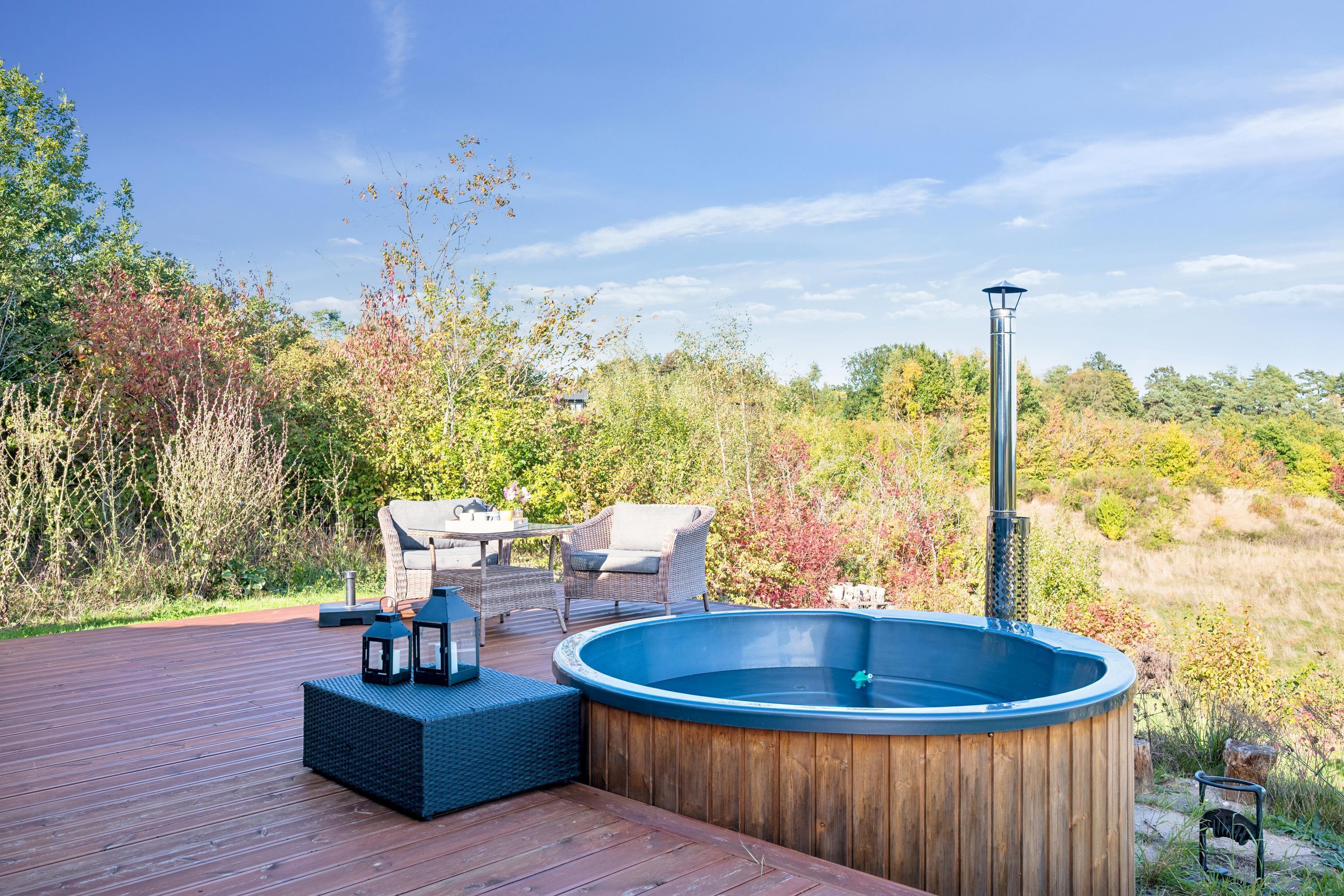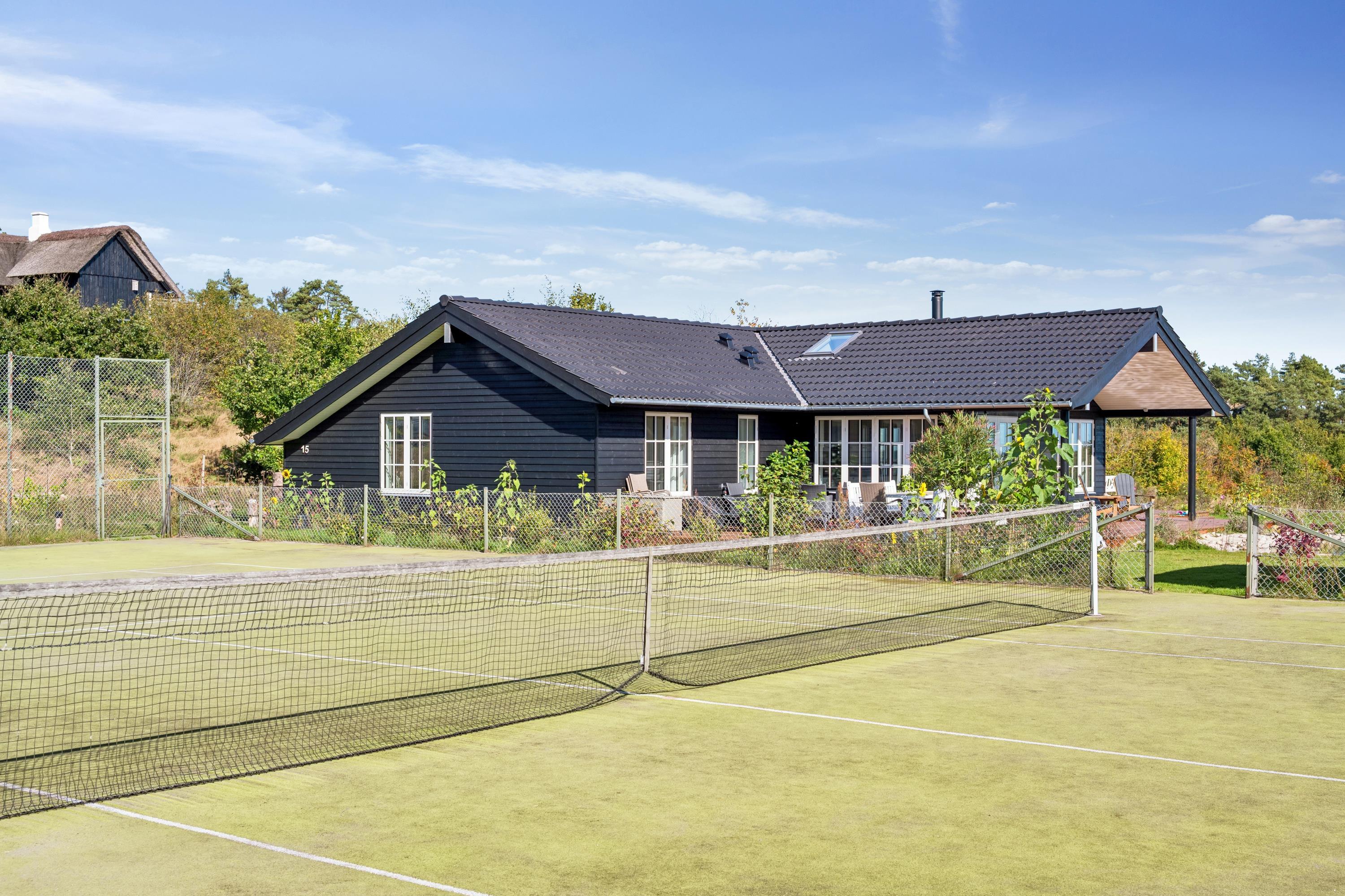 Udenfor venter et sandt ferieparadis. Grunden er stor og varieret – med både smukt anlagte områder og mere vild natur. Her er masser af plads til leg, boldspil og udforskning. Børnene kan glæde sig til sandkasse, gynge og rutsjebane, mens de voksne kan samles ved bålpladsen til snobrød eller skumfiduser på en lun sommeraften. Et helt særligt højdepunkt er den store, privatindhegnede tennisbane, hvor både begyndere og øvede kan udfordre hinanden. Efter en aktiv dag kan I sænke jer ned i det varme vildmarksbad, nyde roen og lade blikket glide ud over solnedgangen ved Fuglsø Vig.