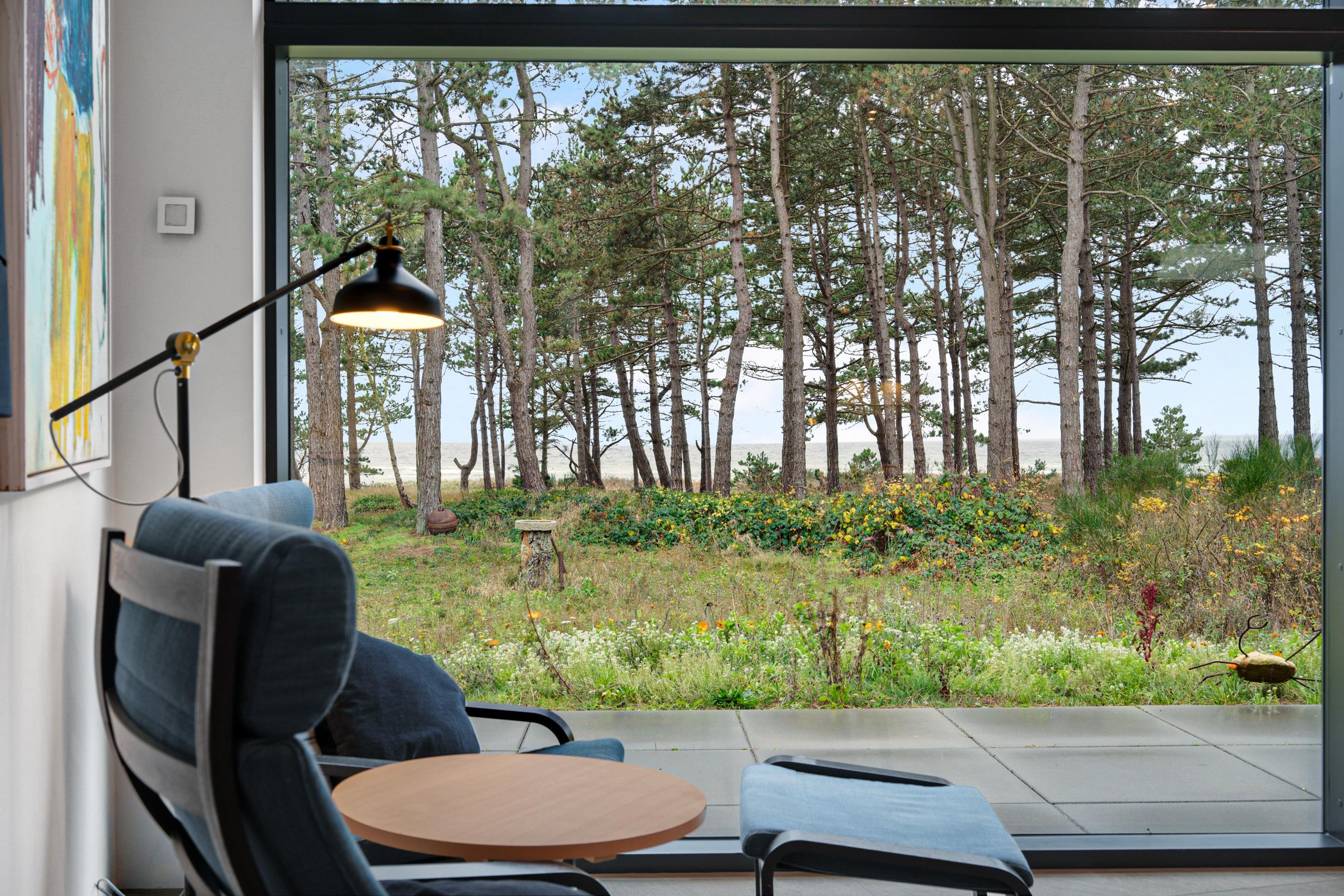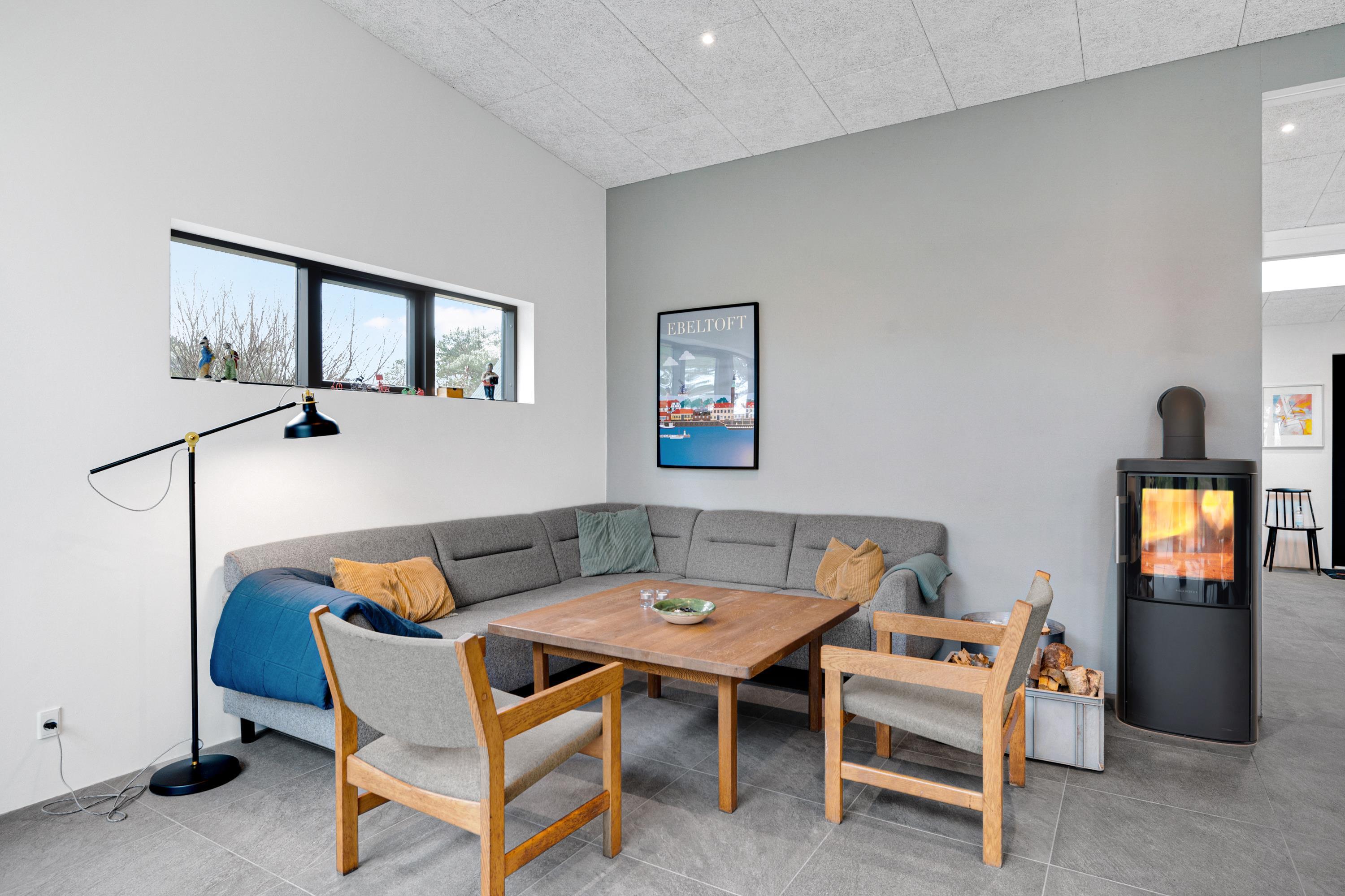 Fra entre og fordelingsgang kommer man ind i den store, lyse stue og køkken/alrum med panoramavinduer i hele rummets bredde. Her er dejligt sofamøblement, god spiseplads til 6 personer, brændeovn, TV med danske gratis kanaler og tyske kanaler samt radio. Lækkert køkken med god arbejdsplads, keramiske kogeplader, ovn, køle-/fryseskab og opvaskemaskine. Husets 6 sovepladser fordeler sig på 2 lyse soveværelser med dobbeltseng samt mindre værelse med 2 køjesenge. Stort badeværelse med bruseniche og vaskemaskine, samt gæstetoilet – begge med flot klinkegulv og gulvvarme som i resten af huset. Der er internetadgang.