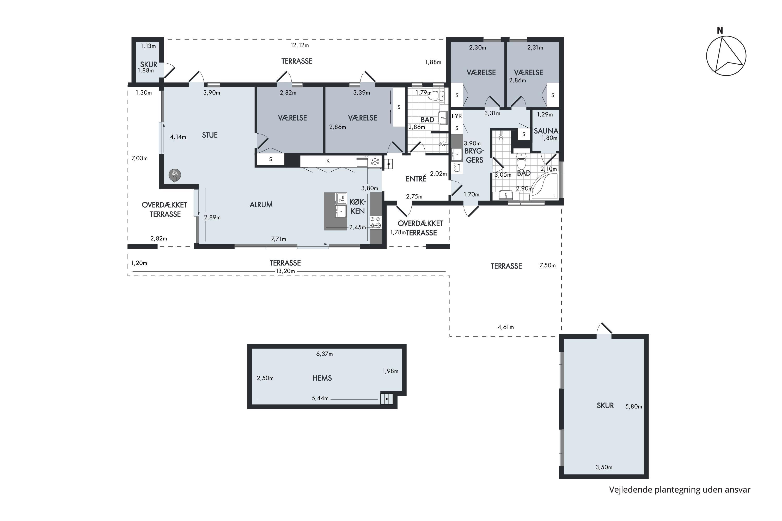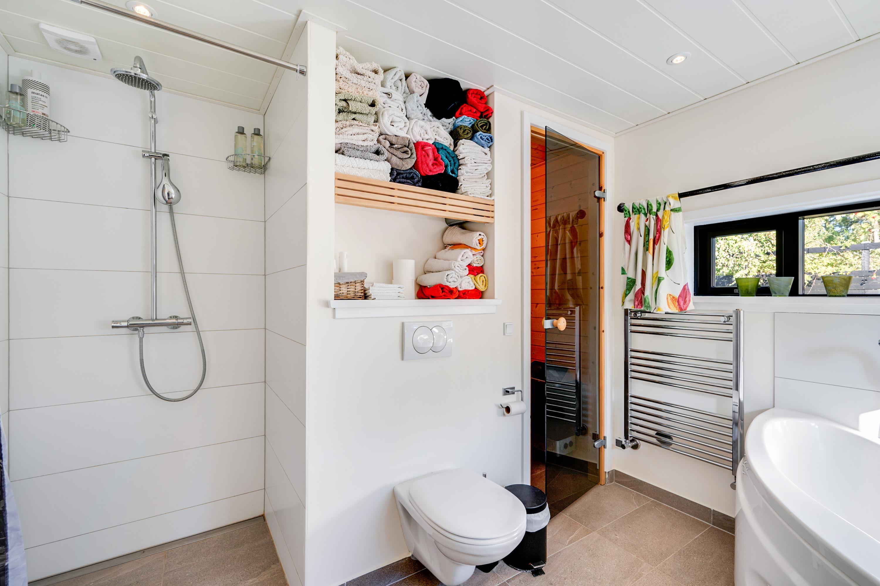 Fra entreen er der indgang til den store, lyse stue og alrum i åben forbindelse med køkken. Hyggelig opholdsstue med godt sofamøblement, brændeovn og TV med danske (inkl. TV2) og tyske kanaler, CD-afspiller samt radio. Dejlig spiseafdeling med plads til 10 personer og lækkert køkken med masser af arbejdsplads. Her er stor, keramisk kogeplade, indbygningsovn, køle-/fryseskab, opvaskemaskine og mikrobølgeovn. Husets 8 sovepladser fordeler sig på 4 gode og lyse soveværelser, 2 med dobbeltseng og 2 med 1½-personers seng samt overkøje. Desuden er der 2 sovepladser på hems med adgang fra opholdsstuen. Huset rummer to store badeværelser med indgang fra hhv. bryggers og entré, begge med bruseniche og gulvvarme, det ene desuden med badekar og adgang til sauna. Rummeligt og praktisk bryggers med vaskemaskine og god opbevaringsplads. Der er barnestol til de mindste. Internetadgang.