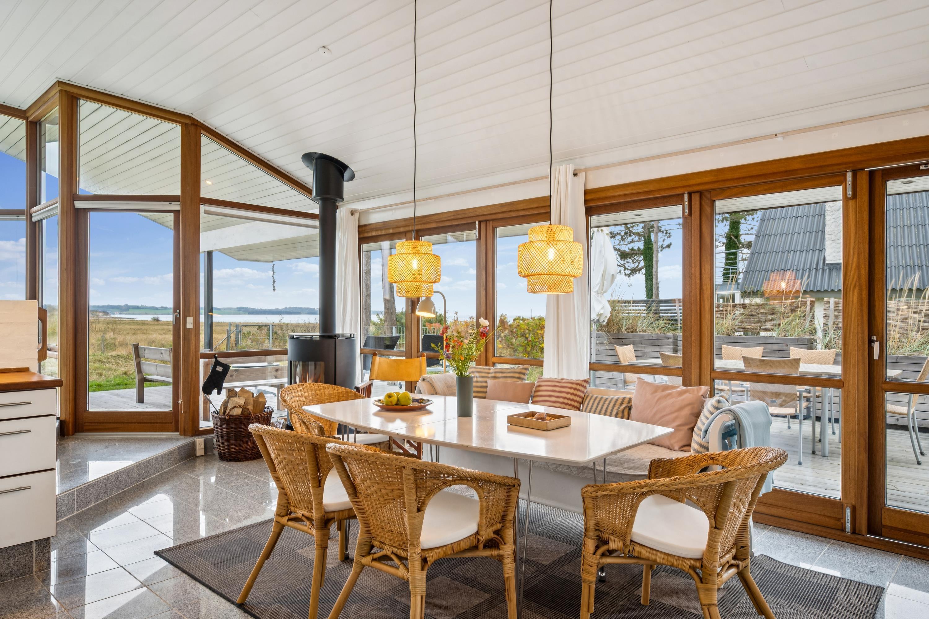Blot et stenkast fra vandet finder man dette flotte og velholdte feriehus, hvorfra man har den smukkeste udsigt til vandet og det kuperede landskab. Her bliver man budt indenfor i husets hjerterum - nemlig det skønne køkken med b.la. opvaskemaskine og den rigtig hyggelige spiseafdeling med brændeovn og med udgang til en dejlig overdækket terrasse med loungemøbler og solsenge. Der er et trin op til den lyse og velmøblerede opholdsstue hvorfra man kan nyde den skønne udsigt over det flotte landskab og vandet. Lækkert badeværelse med bruseniche og gulvvarme. Husets sovepladser finder man i tre store værelser, heraf to med dobbeltsenge og et værelse med to enkeltsenge. Udendørs findes der flere skønne terrasser, så man kan nyde både solopgang og solnedgang og derudover et hyggeligt shelter. Af stisystemer er der ca 10 min gang til en virkelig dejlig sandstrand og kan man li at fiske, så er det lige på den anden side af vejen. Huset ligger ikke lagt fra Karpenhøj Fritidscenter og Fuglsøcentret. Området er meget kuperet og her kan man besøge Olaf Ryes Skanser, som er et levn fra Treårs krigen 1848-1850 mod tyskerne. Fra huset er der ikke langt til Sletterhage Fyr som er meget velbesøgt. Herfra kan man i sommerperioden følge de store skibe til og fra Århus Havn, samt de store luksuslinere der sejler forbi meget tæt på kysten. Området på Helgenæs er kendetegnet af den unikke natur og kuperede terræn, dyreliv og fantastiske udsigtspunkter. Der er ca et kvarters kørsel til Ebeltoft By med de mange turistattraktioner. Her kan man b.la. besøge Det gamle Rådhus, Fregatten Jylland og Glasmuseet.