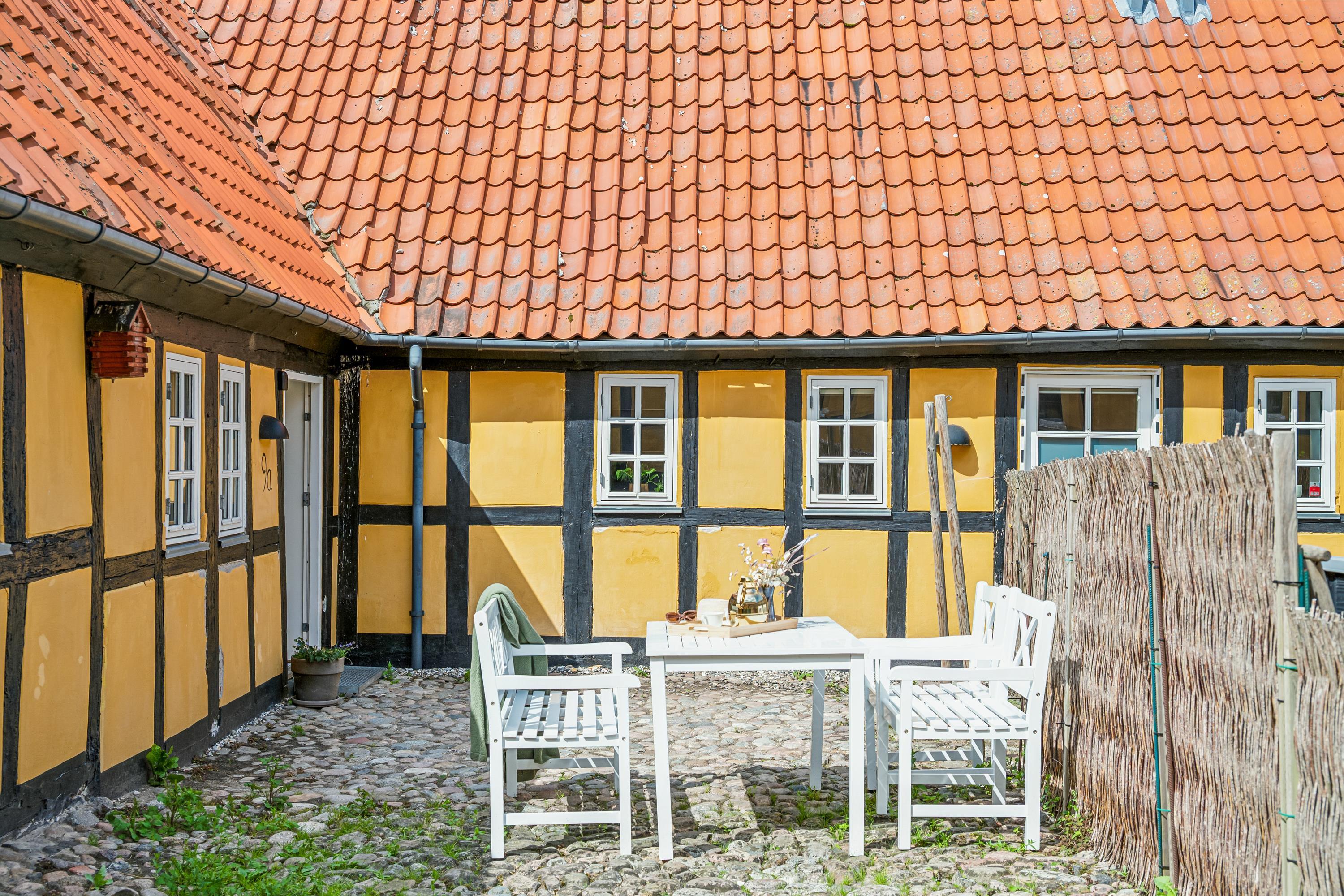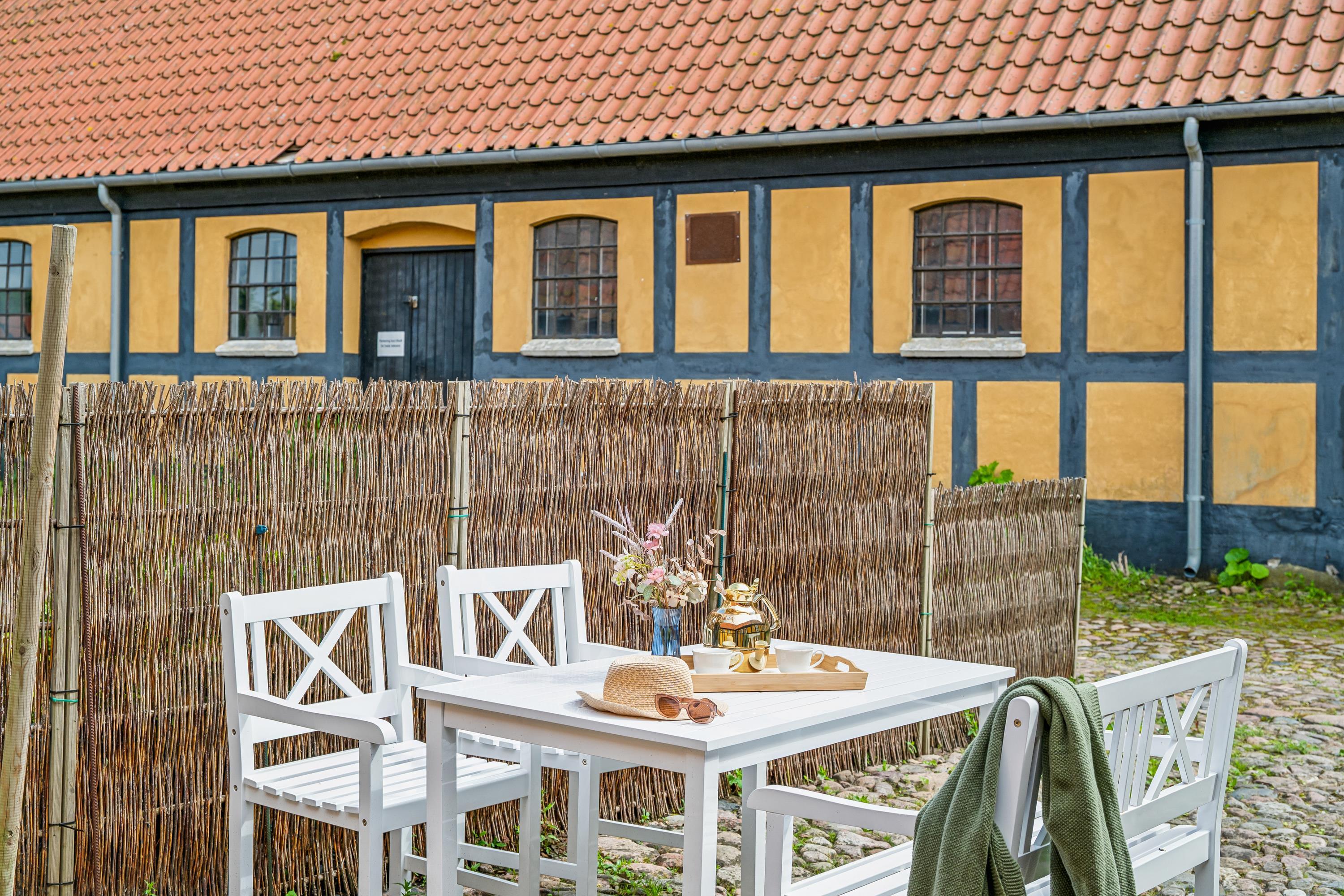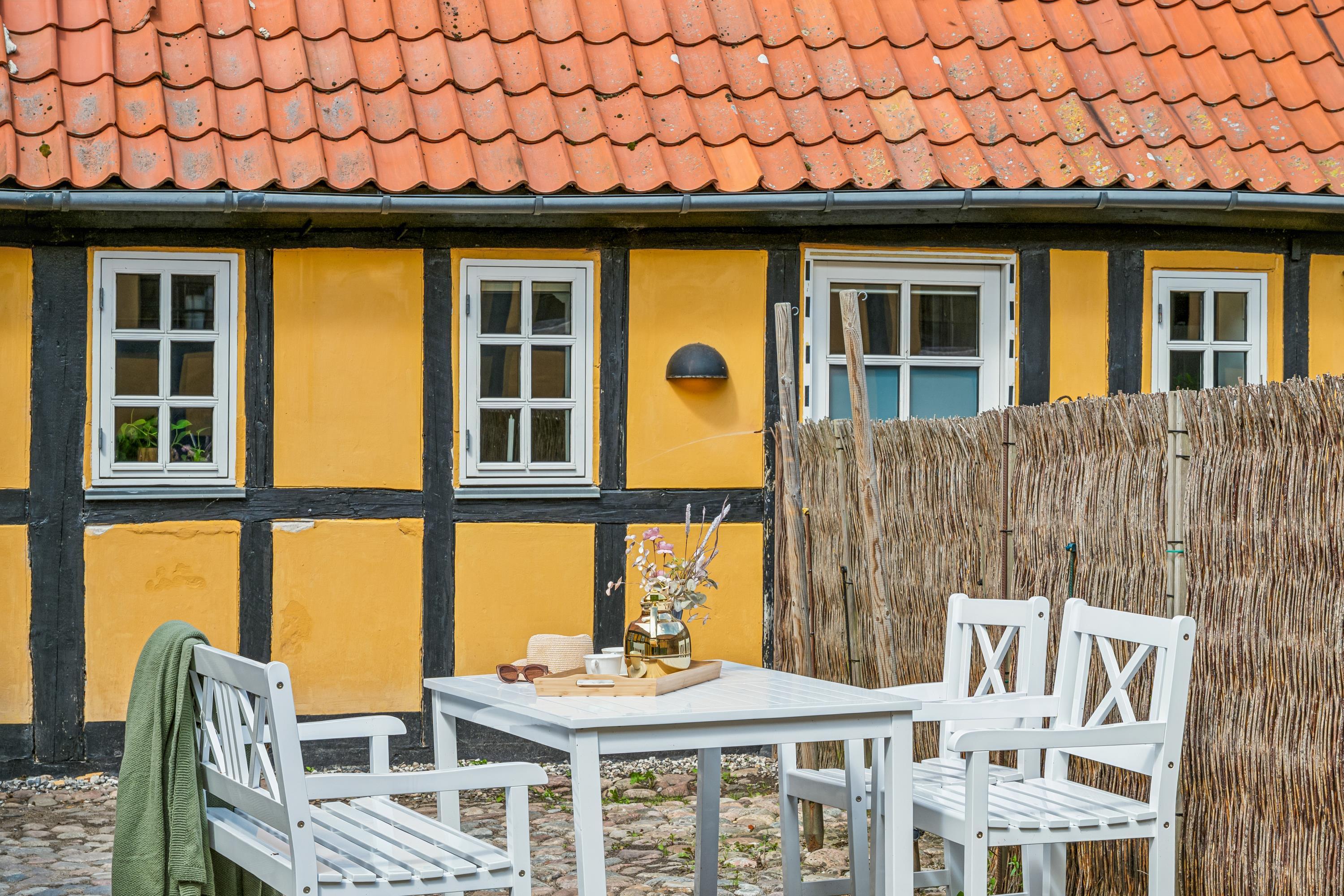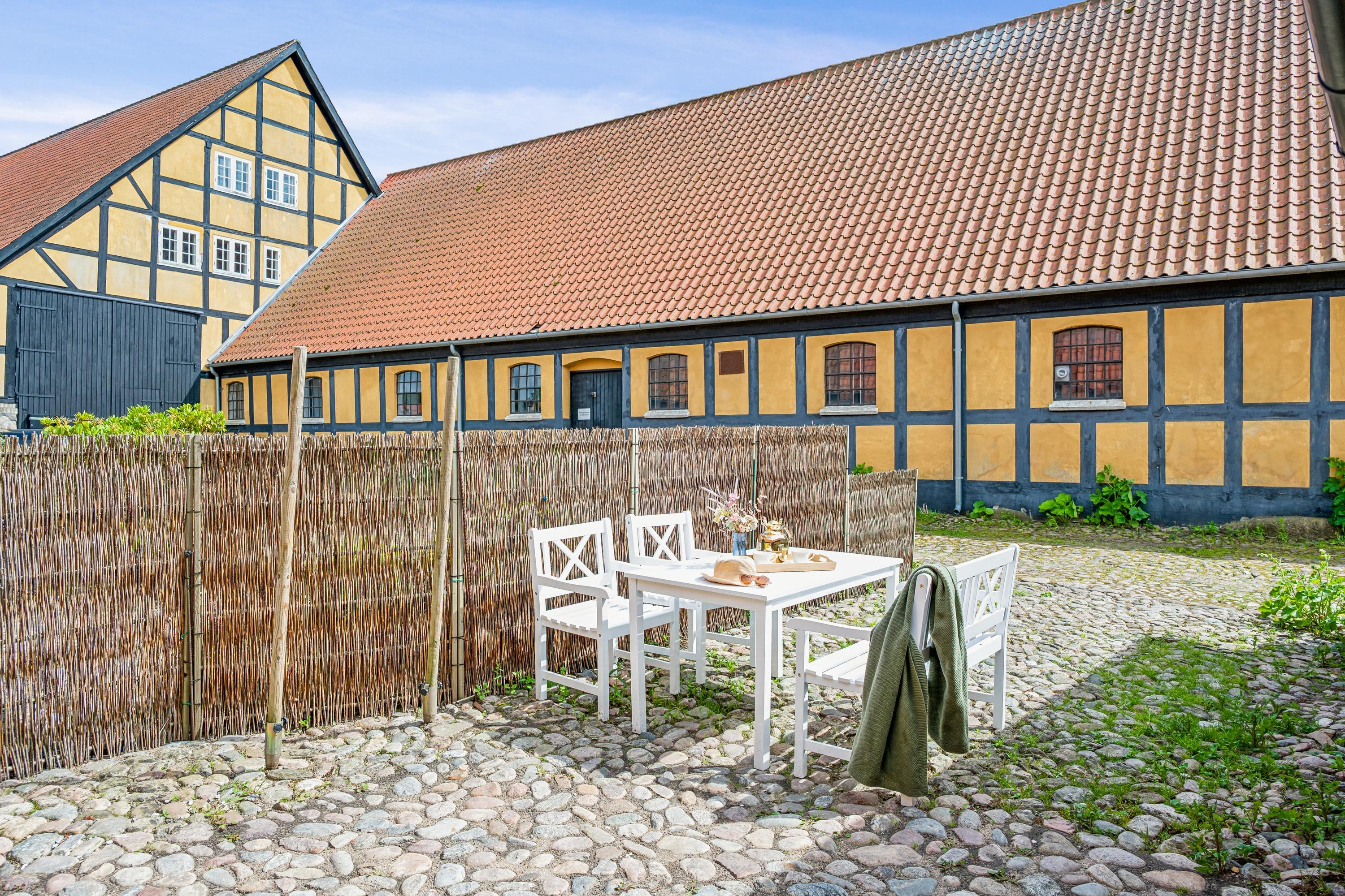 Udendørs finder du en charmerende gårdsplads med toppede brosten, havemøbler og en rolig atmosfære – perfekt til afslappende stunder. Med sine gule mure, smukt bindingsværk og autentiske detaljer får du en ferieoplevelse, hvor kultur og natur mødes på bedste vis.