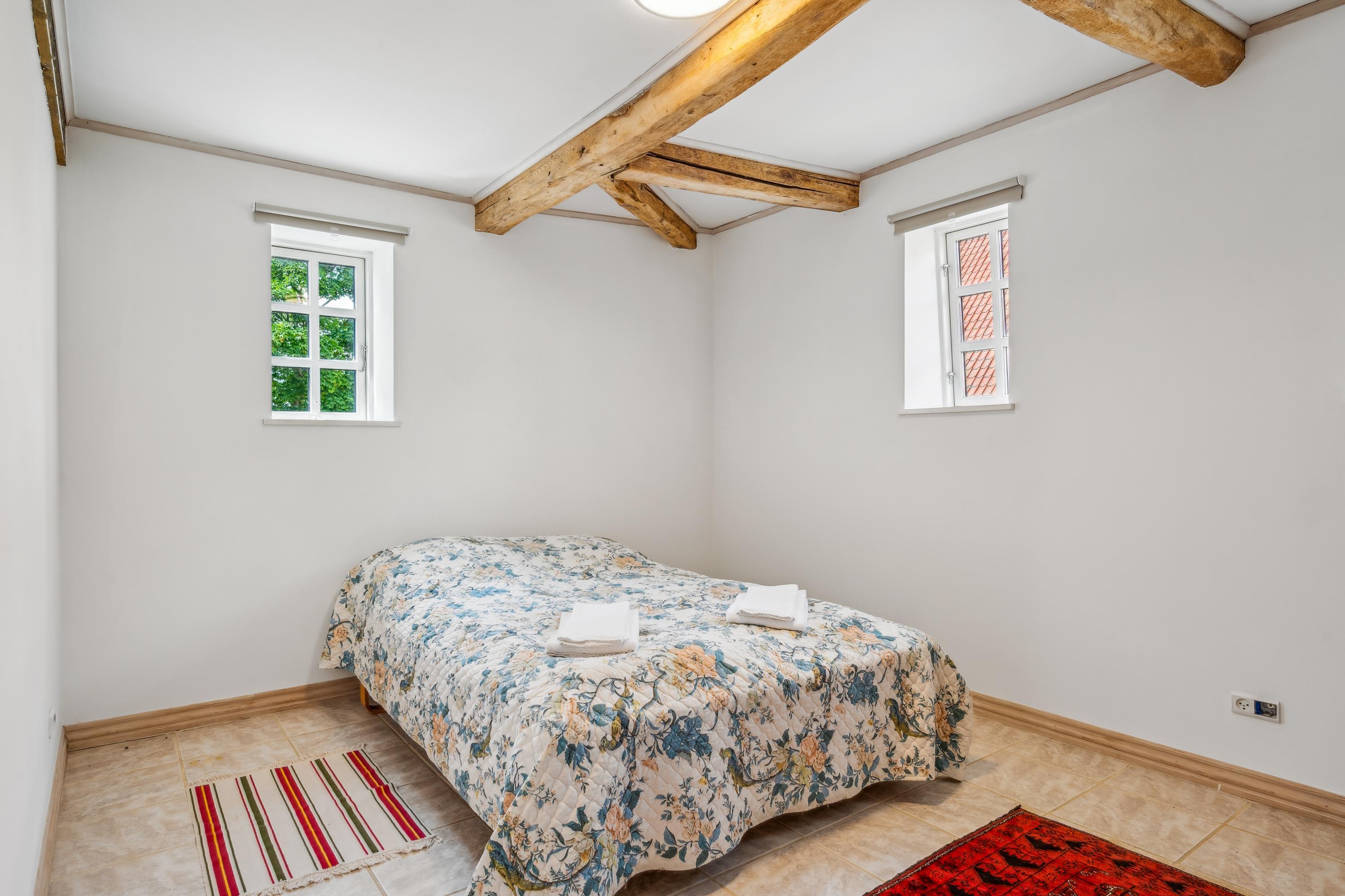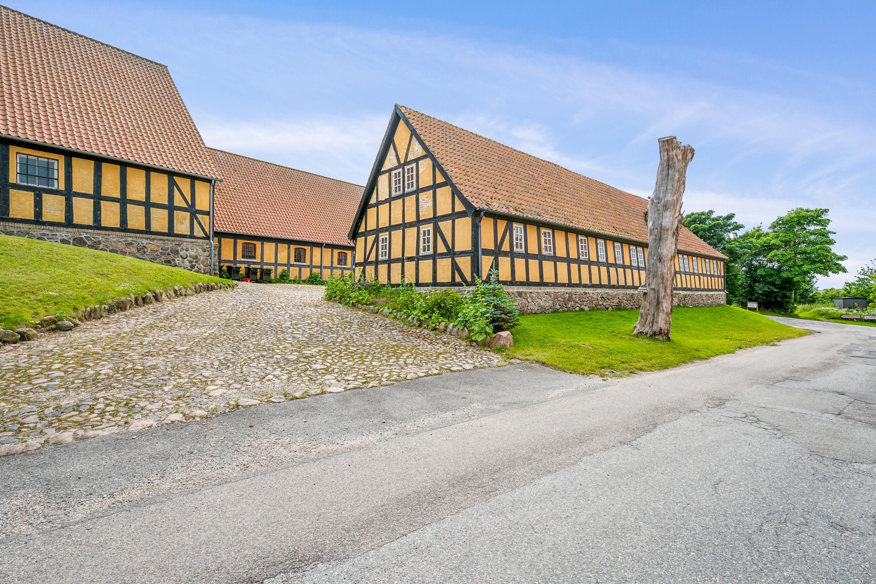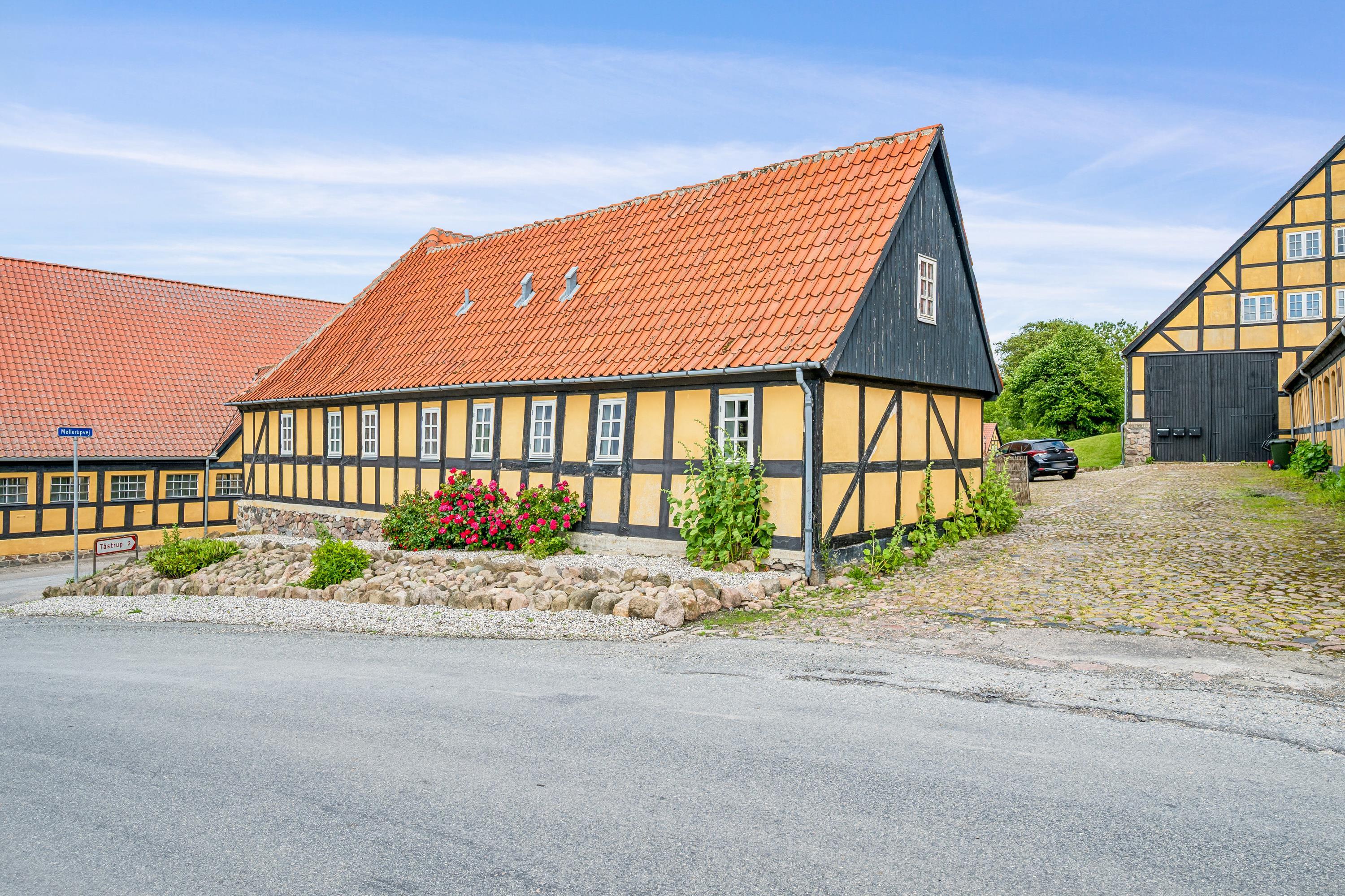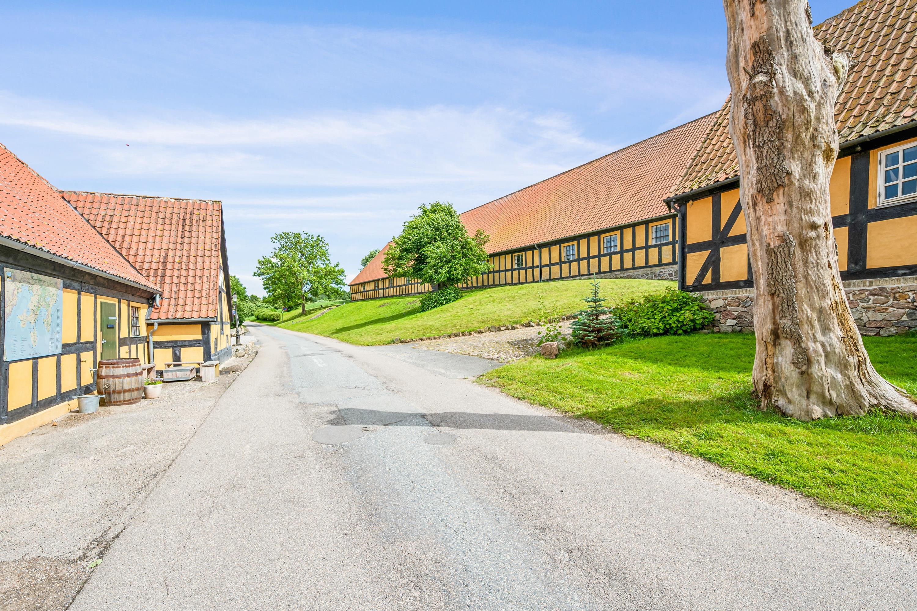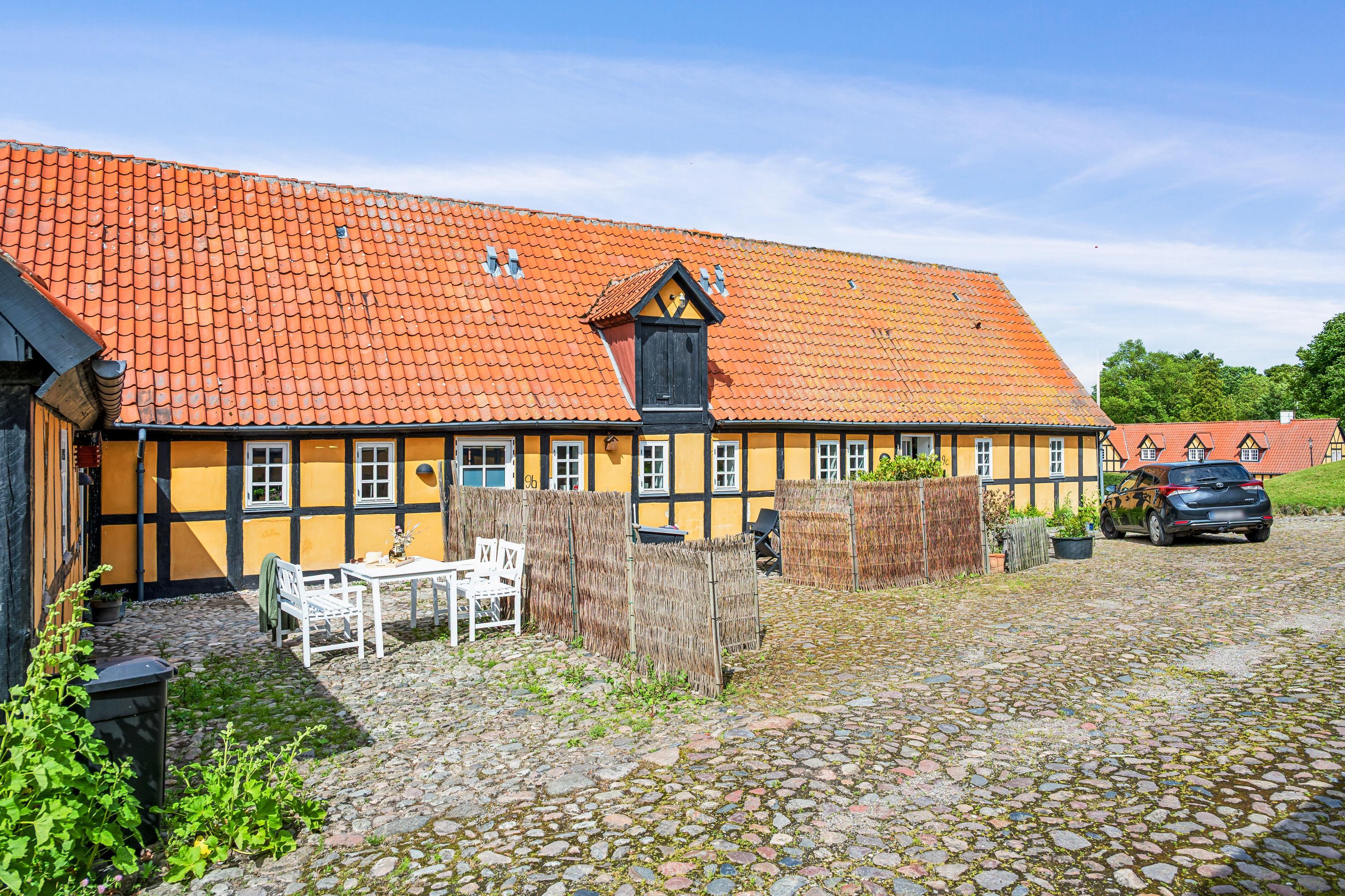 Udendørs finder du en charmerende gårdsplads med toppede brosten, havemøbler og en rolig atmosfære – perfekt til afslappende stunder. Med sine gule mure, smukt bindingsværk og autentiske detaljer får du en ferieoplevelse, hvor kultur og natur mødes på bedste vis.