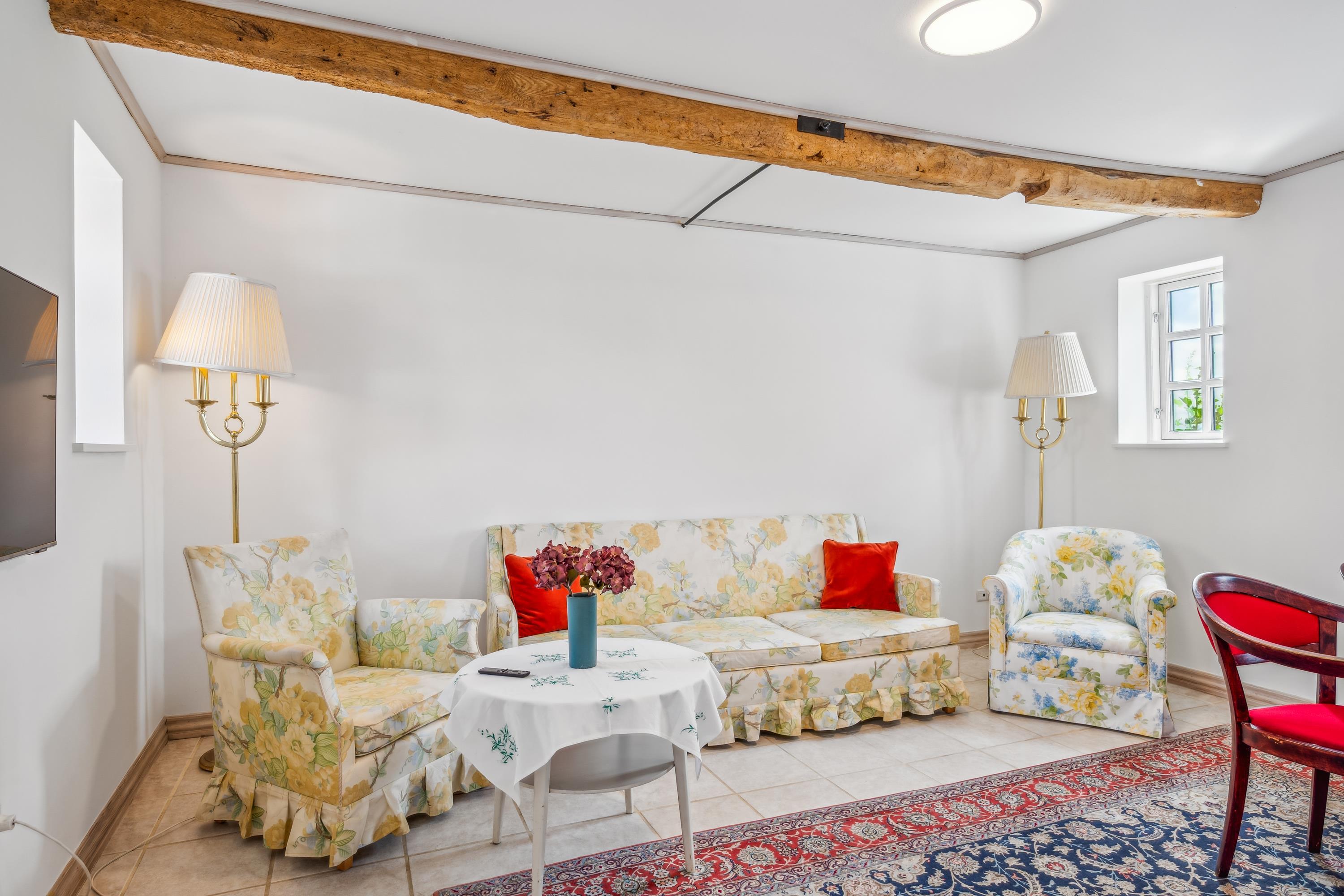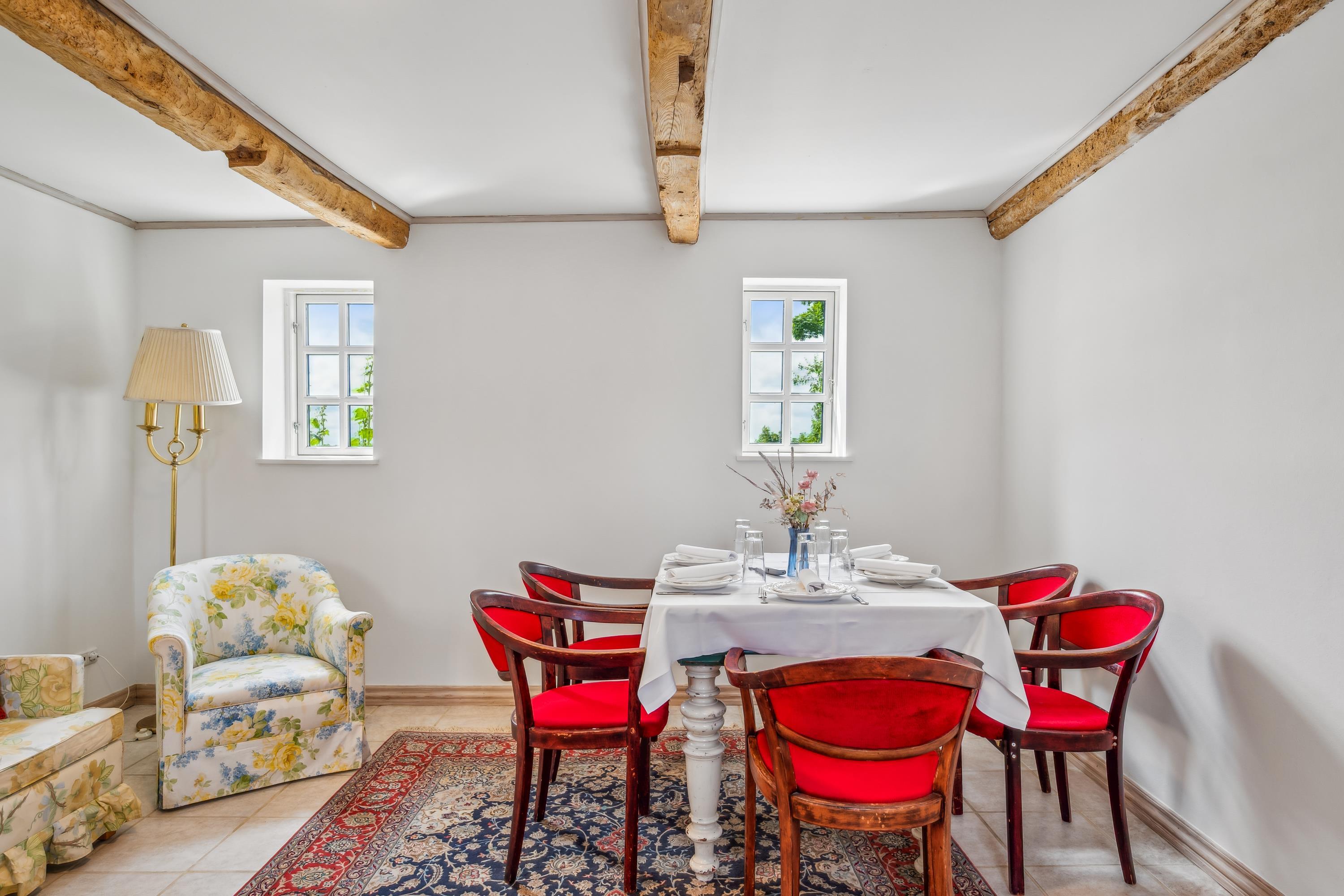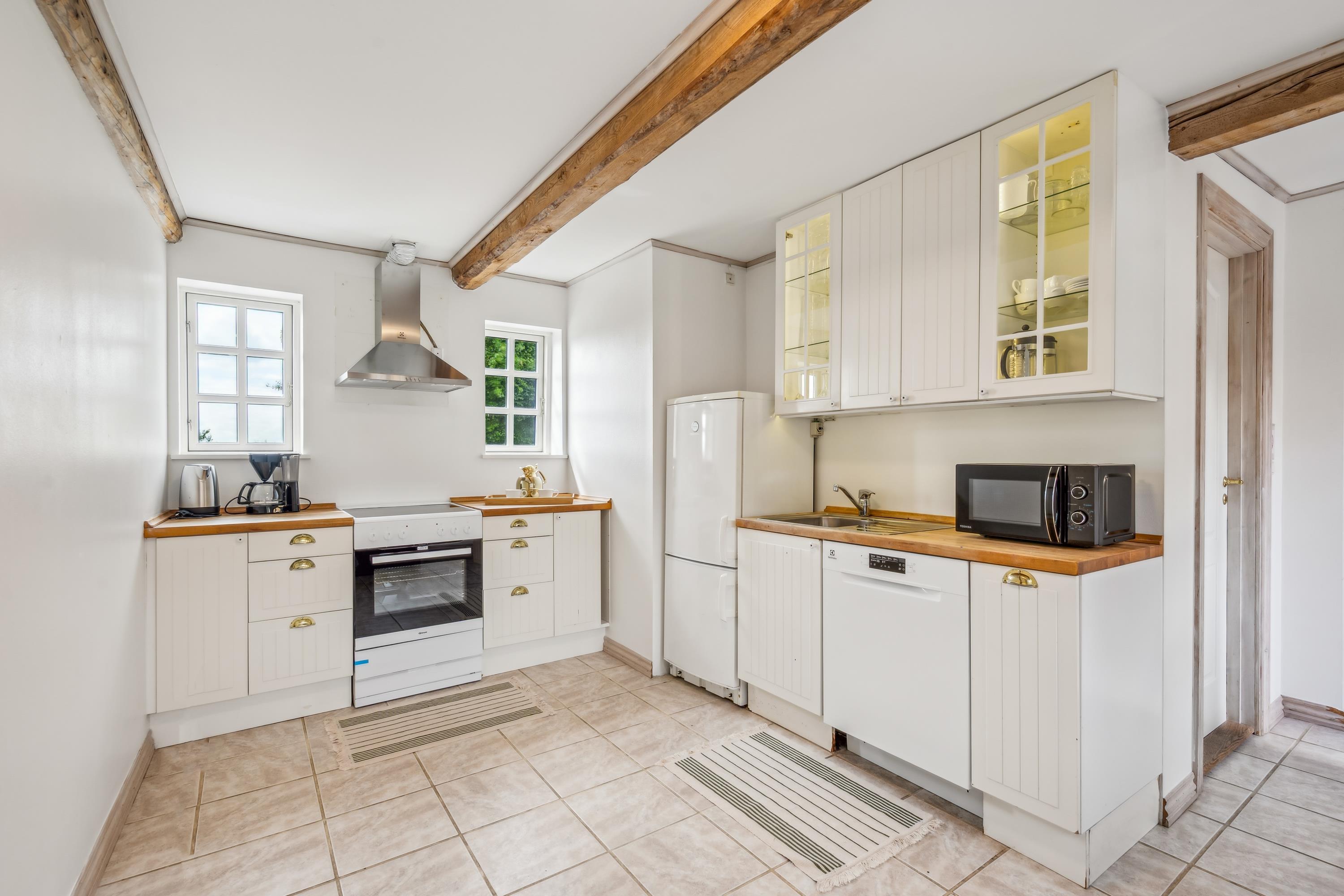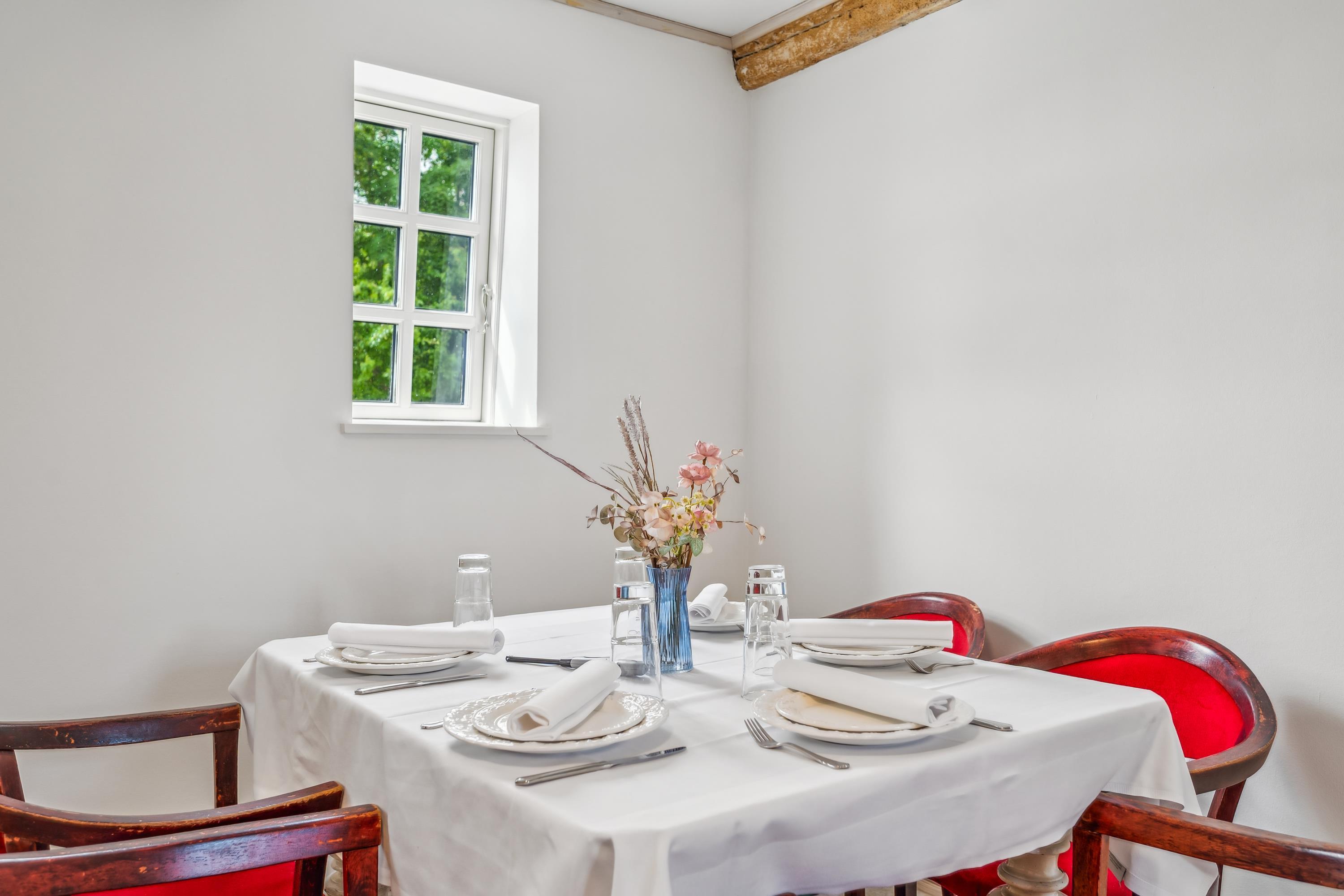 Udendørs finder du en charmerende gårdsplads med toppede brosten, havemøbler og en rolig atmosfære – perfekt til afslappende stunder. Med sine gule mure, smukt bindingsværk og autentiske detaljer får du en ferieoplevelse, hvor kultur og natur mødes på bedste vis.