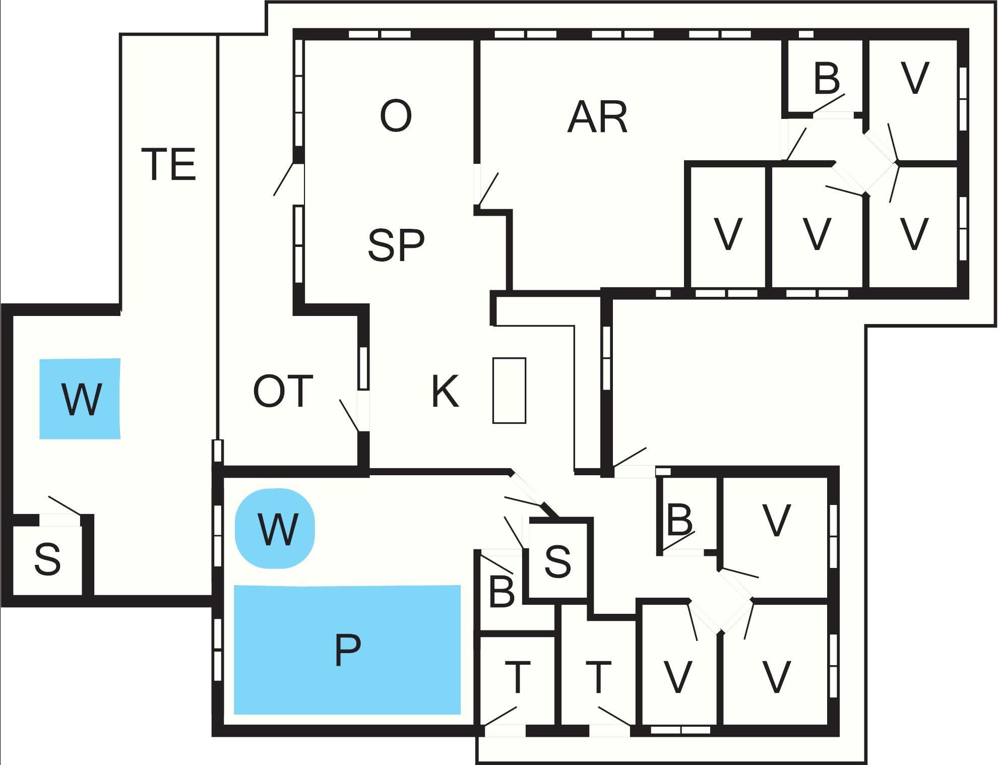 De syv dobbeltværelser er placeret i to soveområder med henholdsvis tre og fire soveværelser med hvert sit badeværelse. Sommerhuset har i alt tre badeværelser, hvoraf det sidste er placeret i poolrummet. Derudover er der fire sovepladser på hemsen, som især er populær blandt børn.
