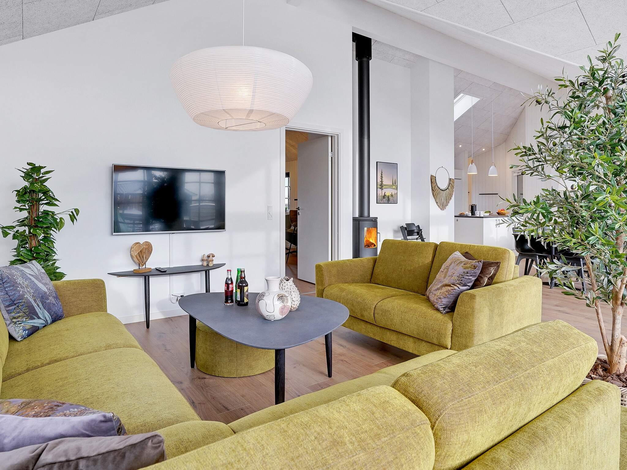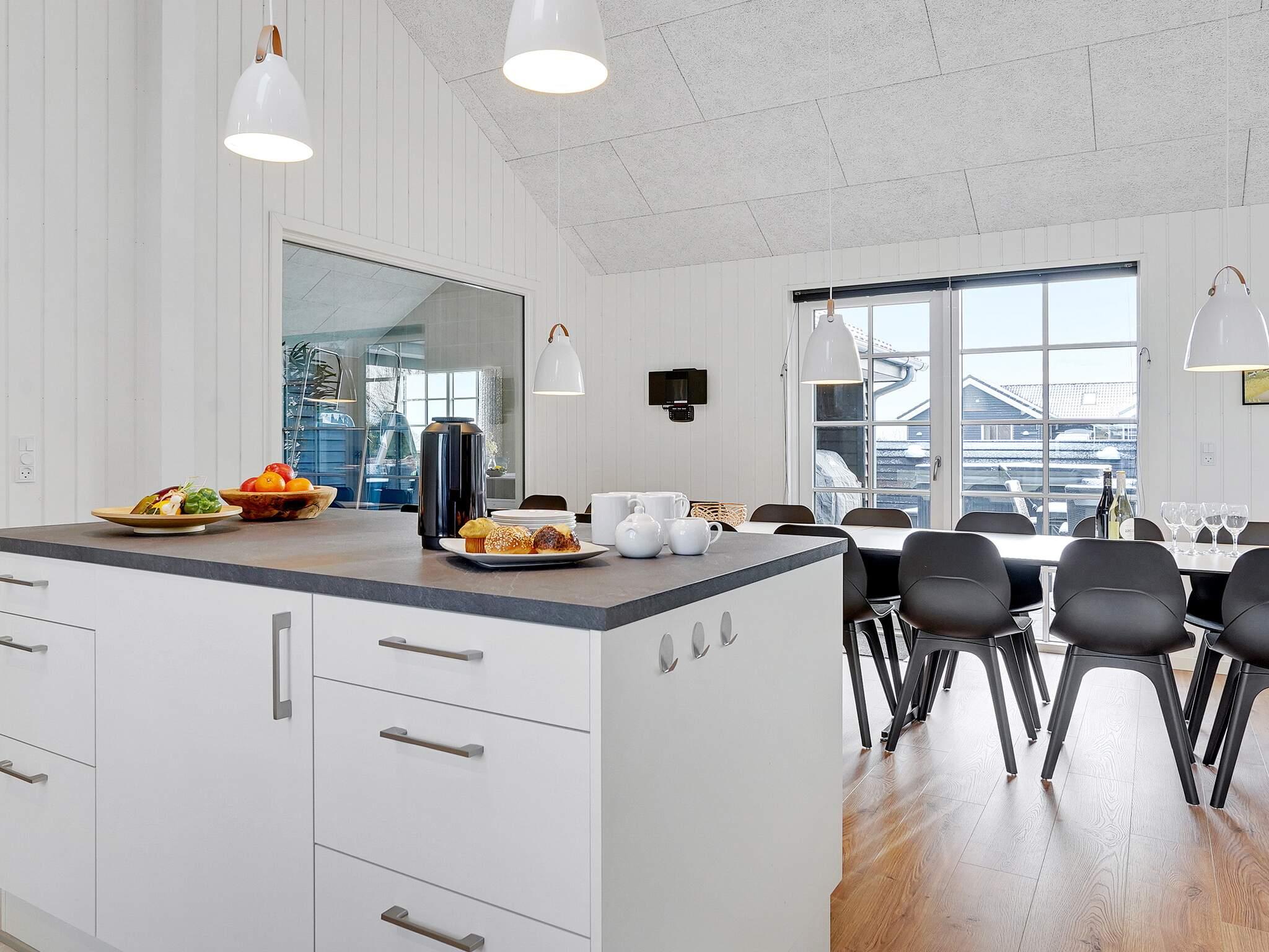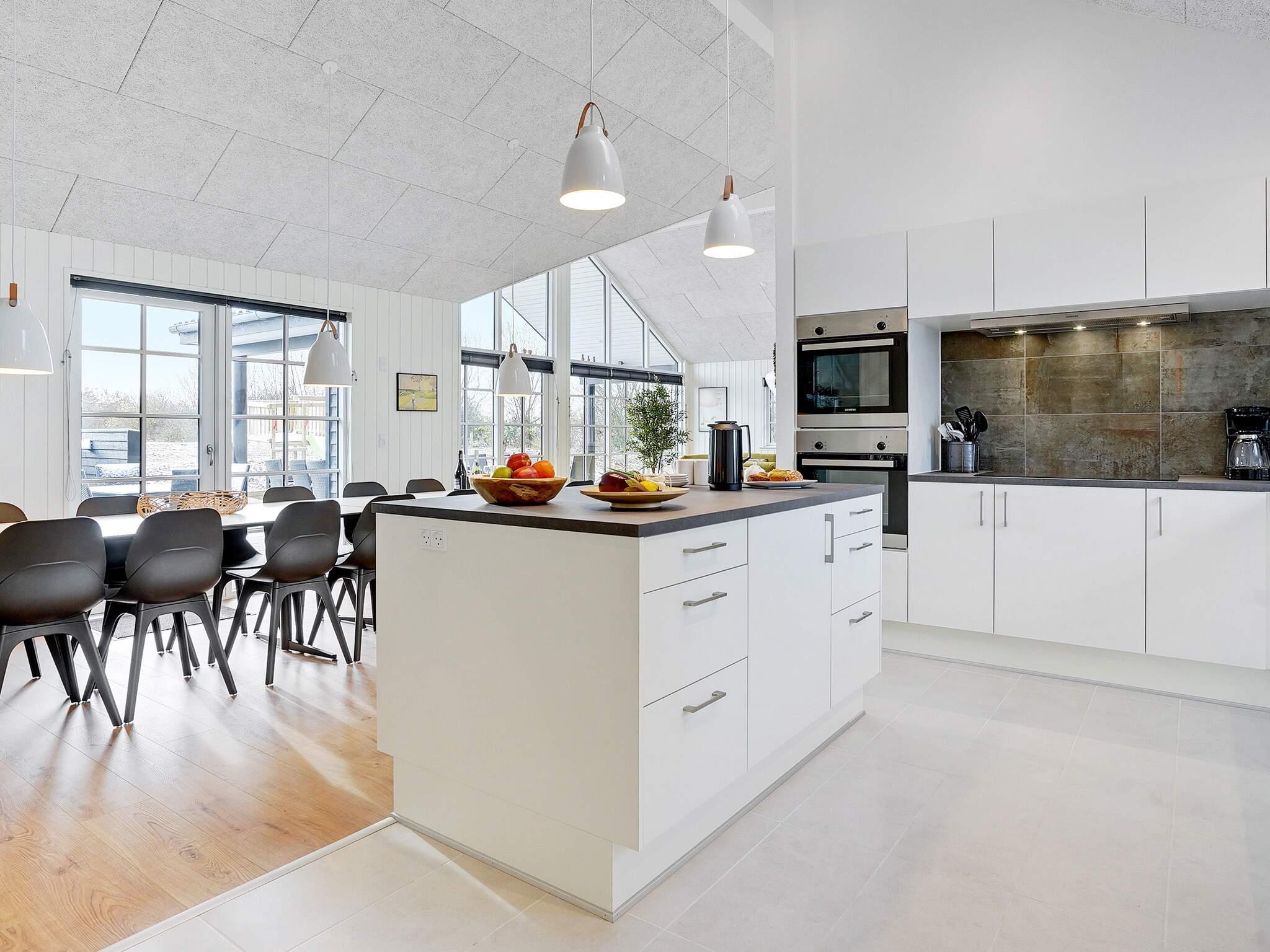 Midt i sommerhuset ligger det store køkken/alrum, som består af en hyggelig sofagruppe med tv og brændeovn. Herfra har du udsigt til terrassen. Omkring det lange spisebord er der plads til, at alle 18 gæster kan sidde sammen og nyde et lækkert måltid, som kan tilberedes i det stilrene køkken. Der er to opvaskemaskiner, to ovne/komfurer og rigelig køle/fryseplads. Det er en ren fornøjelse at være kok i disse omgivelser.
