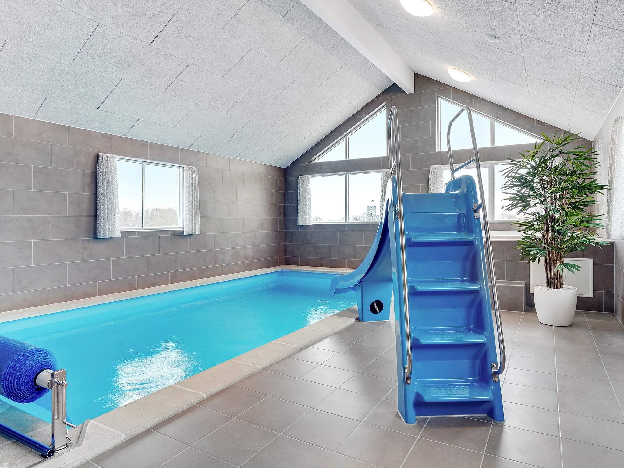 Feriehuset har sin egen 18 m2 indendørs swimmingpool med vandrutsjebane, romerske trappetrin og modstrømsanlæg. Poolrummet har også et luksuriøst spabad og sauna, så du kan nyde en ægte wellness-oplevelse.