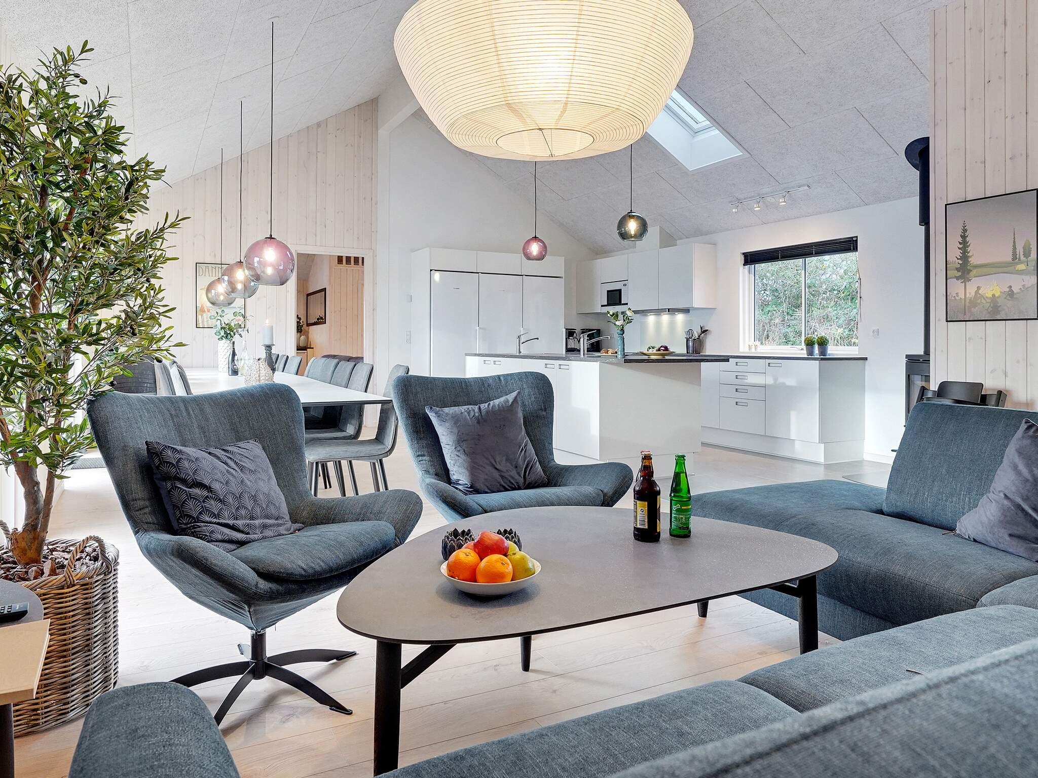 Feriehuset har en hyggelig stue med spisebord og sofahjørne. Du kan nyde varmen fra brændeovnen med en god film eller bog. Det stilrene køkken er veludstyret og ligger i forlængelse af stuen. Her finder du det ekstra rummelige køkken med ekstra kogeplade, køleskab, ovn, samt plads til større måltider.