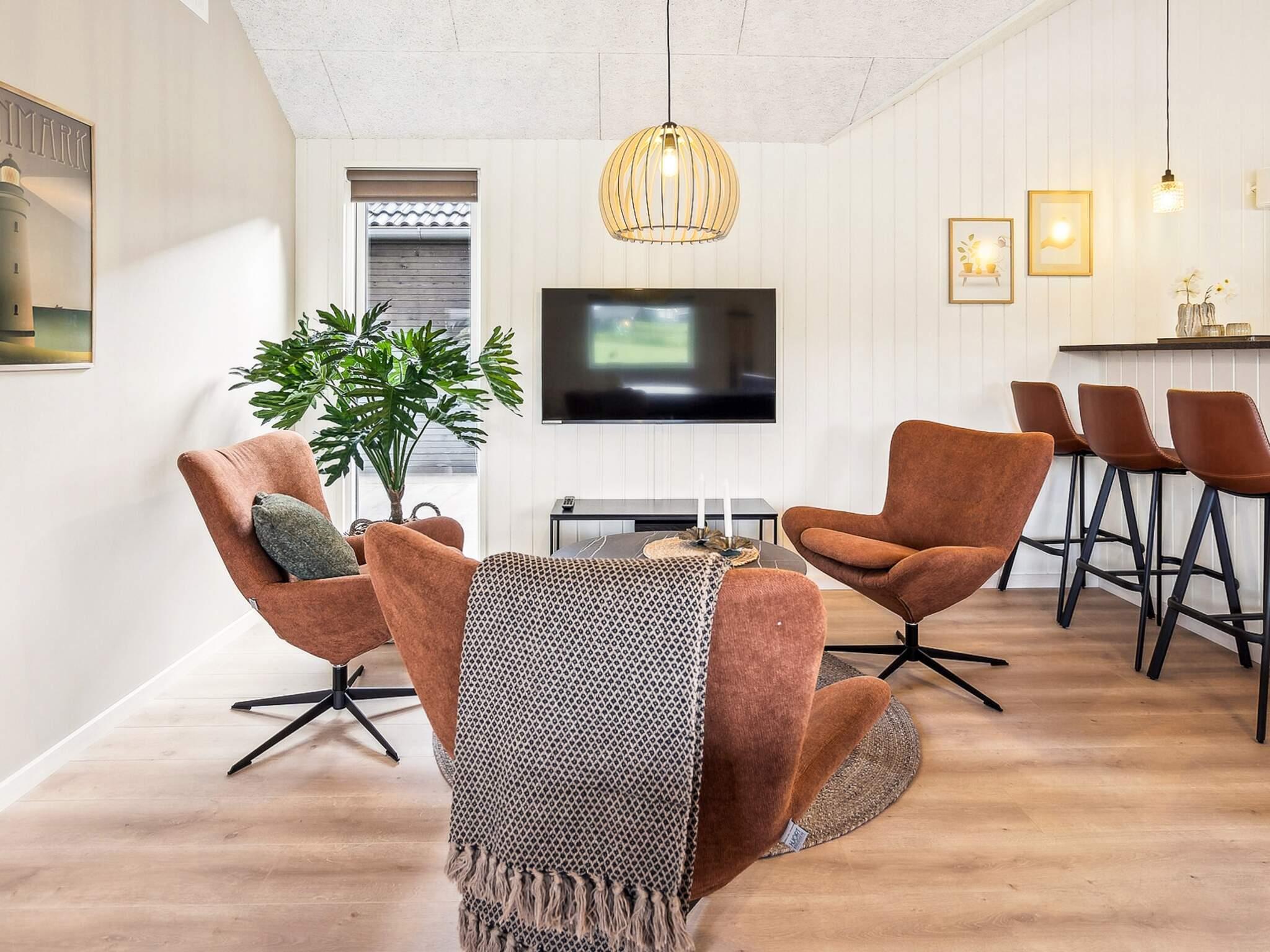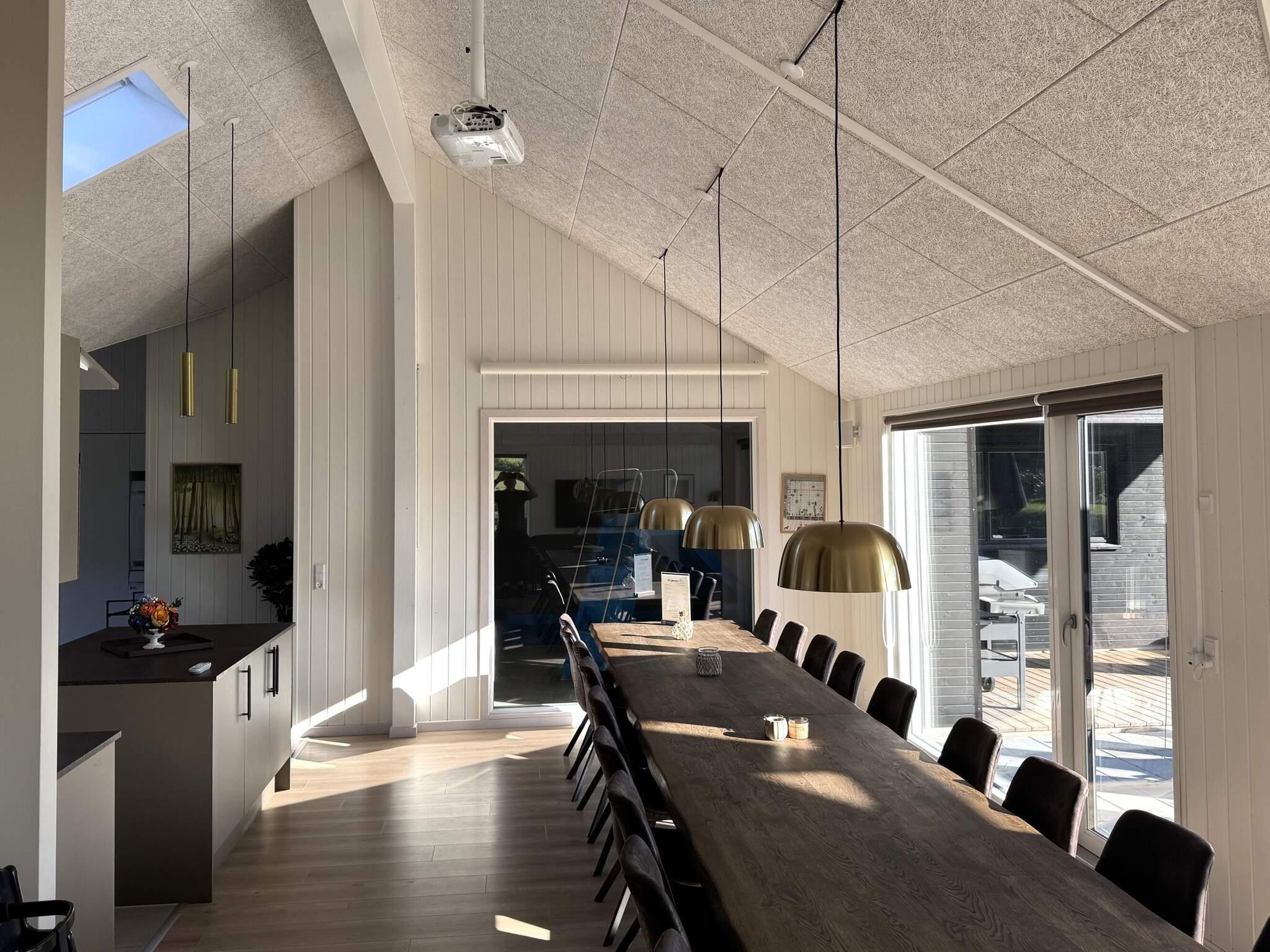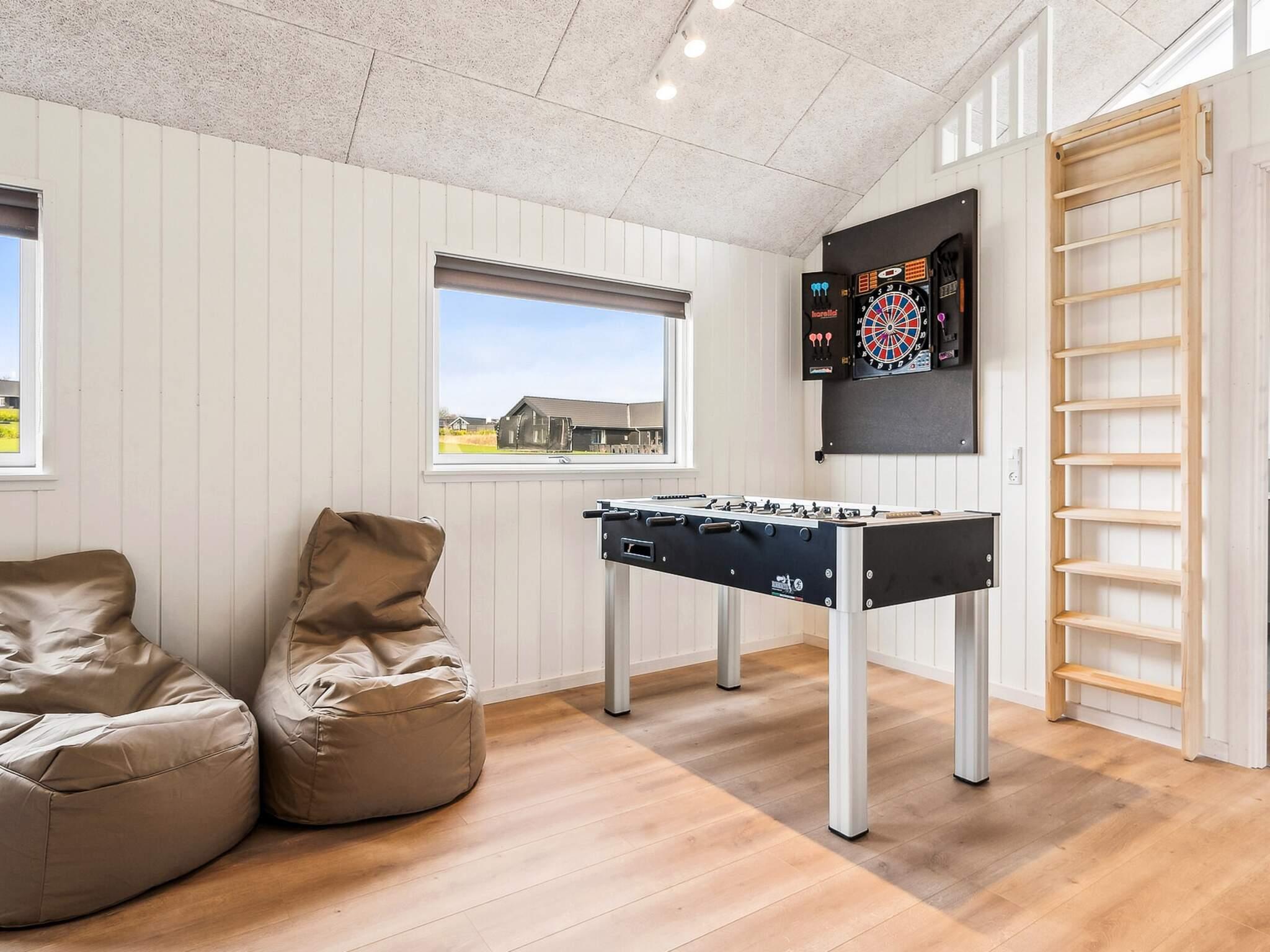 I idylliske Mommark finder I dette dejlige luksusferiehus til 18 personer, beliggende tæt på en skøn sandstrand, en lille havn med fiskerbåde, og skøn natur med muligheder for vandre- eller cykelture. Feriehuset har syv soveværelser, tre badeværelser og en hyggelig hems, som især børn vil elske. Der er taget ekstra hensyn til indretningen af det store køkken-alrum, der fungerer som omdrejningspunktet for huset med et fuldt udstyret XL-køkken med 2 ovne og 2 opvaskemaskiner, et langt flot mahogni spisebord med plads til alle, samt en behagelig sofagruppe med brændeovn. Her er rig mulighed for hyggeligt samvær og gode måltider. Aktivitetsrummet, der er forbundet med køkken-alrummet, byder på masser af sjov. Der er billard, bordtennis, bordfodbold og dart, samt en bar, hvor du kan nyde forfriskninger, mens du konkurrerer i de mange spil. Derudover kan du også slappe af i loungemøblerne i aktivitetsrummet, måske med en film, der giver en perfekt balance mellem aktivitet og afslapning. Huset har eget poolområde, hvor man kan bade og lege i timevis, med plads til både store og små børn. Udenfor finder du et wellness-område med en lille overdækket træterrasse, sauna, udendørs spa og udendørs bruser, hvor du kan slappe af under åben himmel. For de yngste gæster er der masser af underholdning i haven med trampolin, som garanterer mange timers sjov. Imens kan de voksne nyde en grillmiddag eller slappe af på den delvist overdækkede terrasse med komfortable havemøbler. For lystfiskere har huset sit eget udendørs fiskerensningsområde med bord, vask og vandhane. Området omkring huset byder også på en stor multisportsplads og en legeplads, der omfatter et spændende piratskib. Her er borde og bænke, så de voksne kan hygge sig, mens børnene leger og udforsker området. Huset er desuden udstyret med ladestander til elbiler, så du kan oplade din bil direkte ved huset. Dette hus kombinerer komfort, sjov og afslapning og er det perfekte valg til en ferie fuld af oplevelser og sjov på Mommarks fredelige kystlinje, hvilket gør det til det ideelle sted for en afslappende ferie ved vandet. Med projektor og lærred er huset også velegnet til mindre kurser.