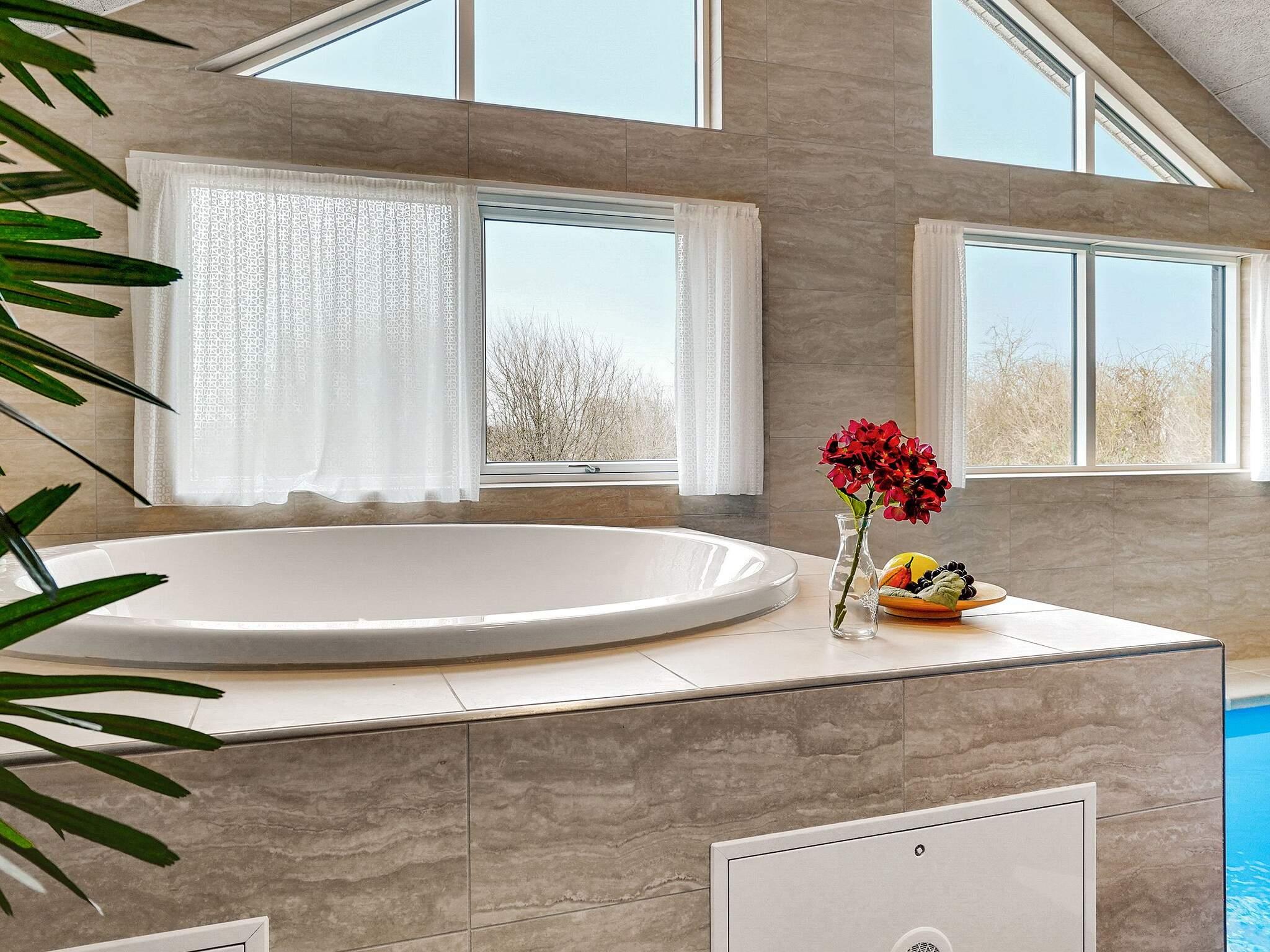 Sommerhuset byder på et væld af aktiviteter og underholdningsmuligheder, så ingen gæst kommer til at kede sig hverken sommer eller vinter. En dukkert i den 18 m2 store swimmingpool med vandrutsjebane, romerske trin og modstrømssystem er en mulighed hele året rundt. Alternativt kan du nyde en varm dukkert i rummets spabad, hvor en tur i saunaen også bidrager til den afslappende følelse.