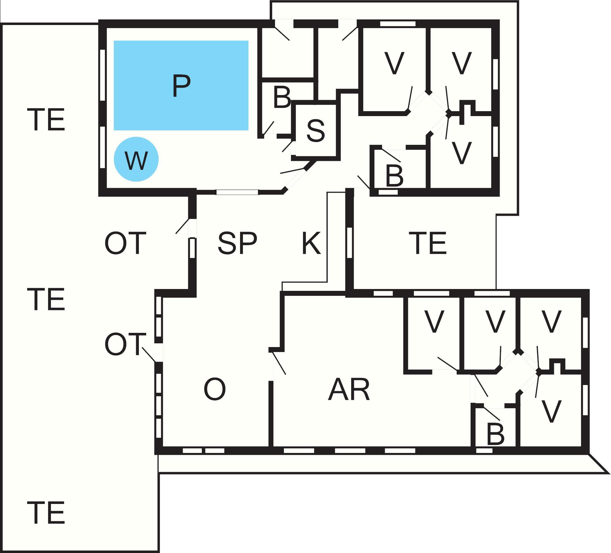 7 Soveværelser: (1DS)+(1DS)+(2S)+(2S)+(2S)+(2S)+(2S), barneseng