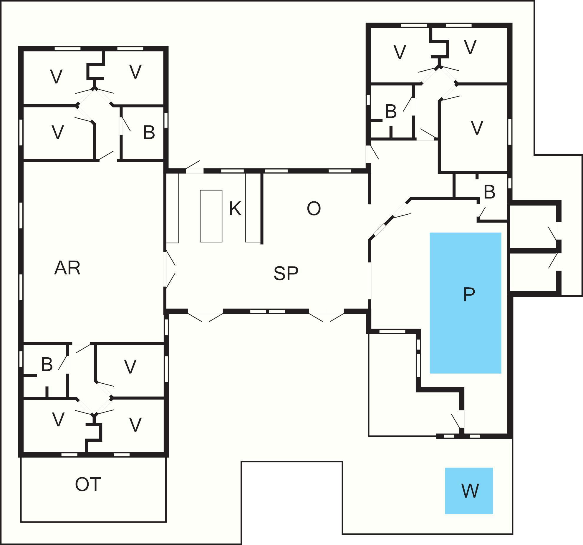 Værelsesfordelingen gør det perfekt til store grupper. Sommerhuset har 9 værelser fordelt på 3 soveafdelinger, hver med eget badeværelse. Ét af værelserne er indrettet med både dobbeltseng og køjeseng og er ideelt som familieværelse. Der er desuden et ekstra badeværelse i poolområdet for ekstra komfort.
