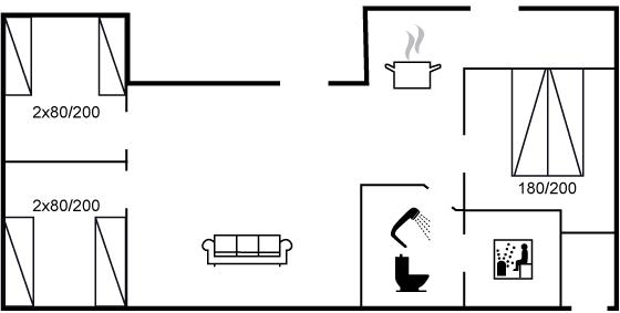 Der er i alt 3 soveværelser. Sovepladserne fordeler sig på: 2 sovepladser i dobbeltseng. 4 sovepladser i enkeltsenge. Derudover er der 1 stk. barneseng.