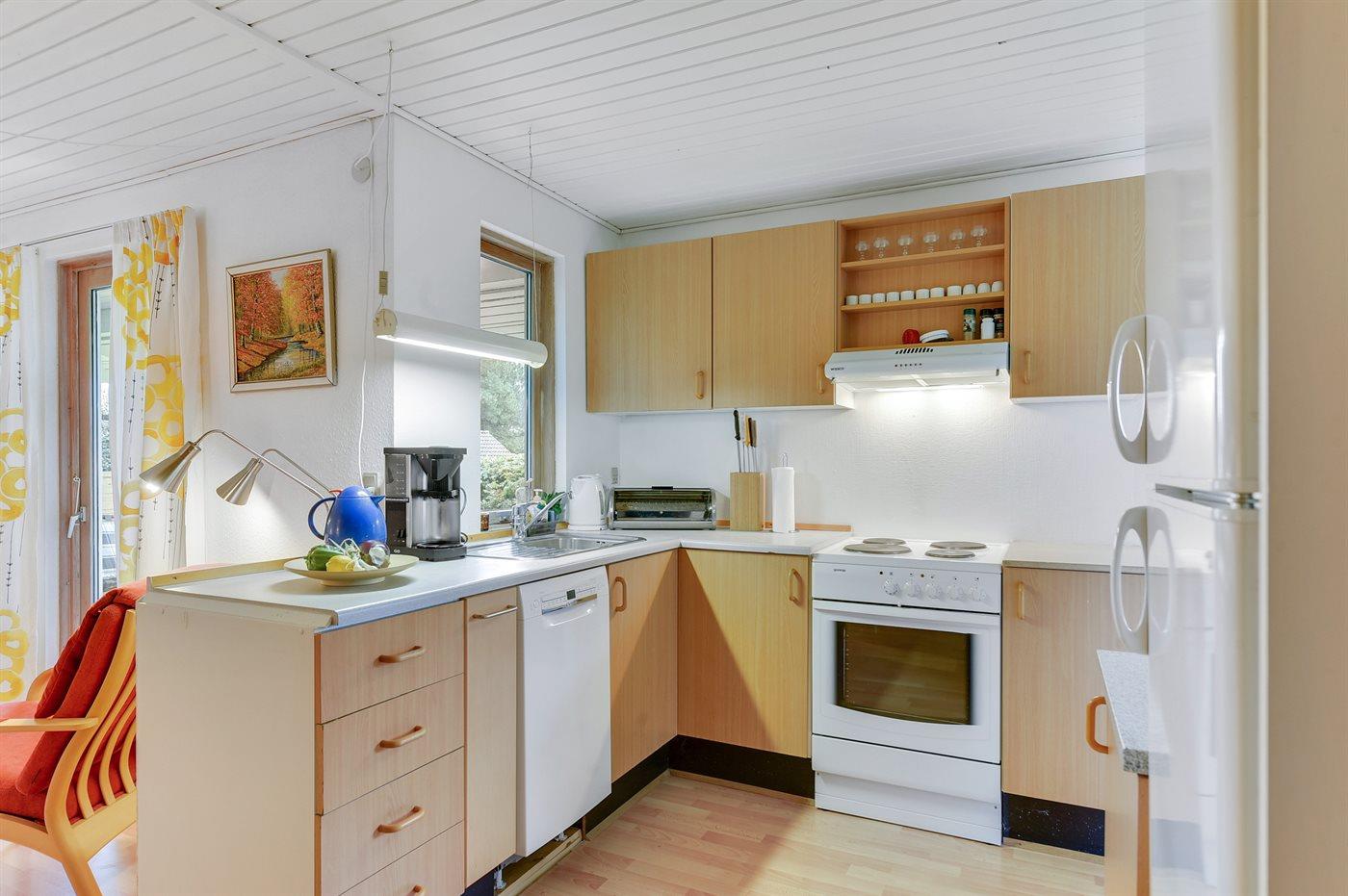 Køkkenet er udstyret med 1 køleskab. Der er 4 elkogeplader, varmluftovn, mikrobølgeovn samt opvaskemaskine.