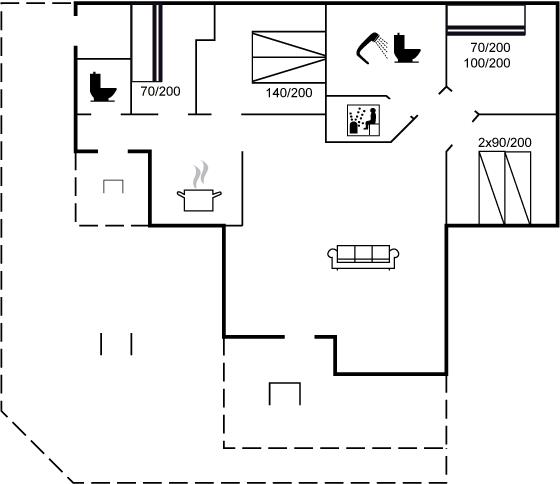 Der er 1 badeværelse med bruseniche og 2 toiletter, heraf 1 gæstetoilet I saunaen er der mulighed for afslapning.